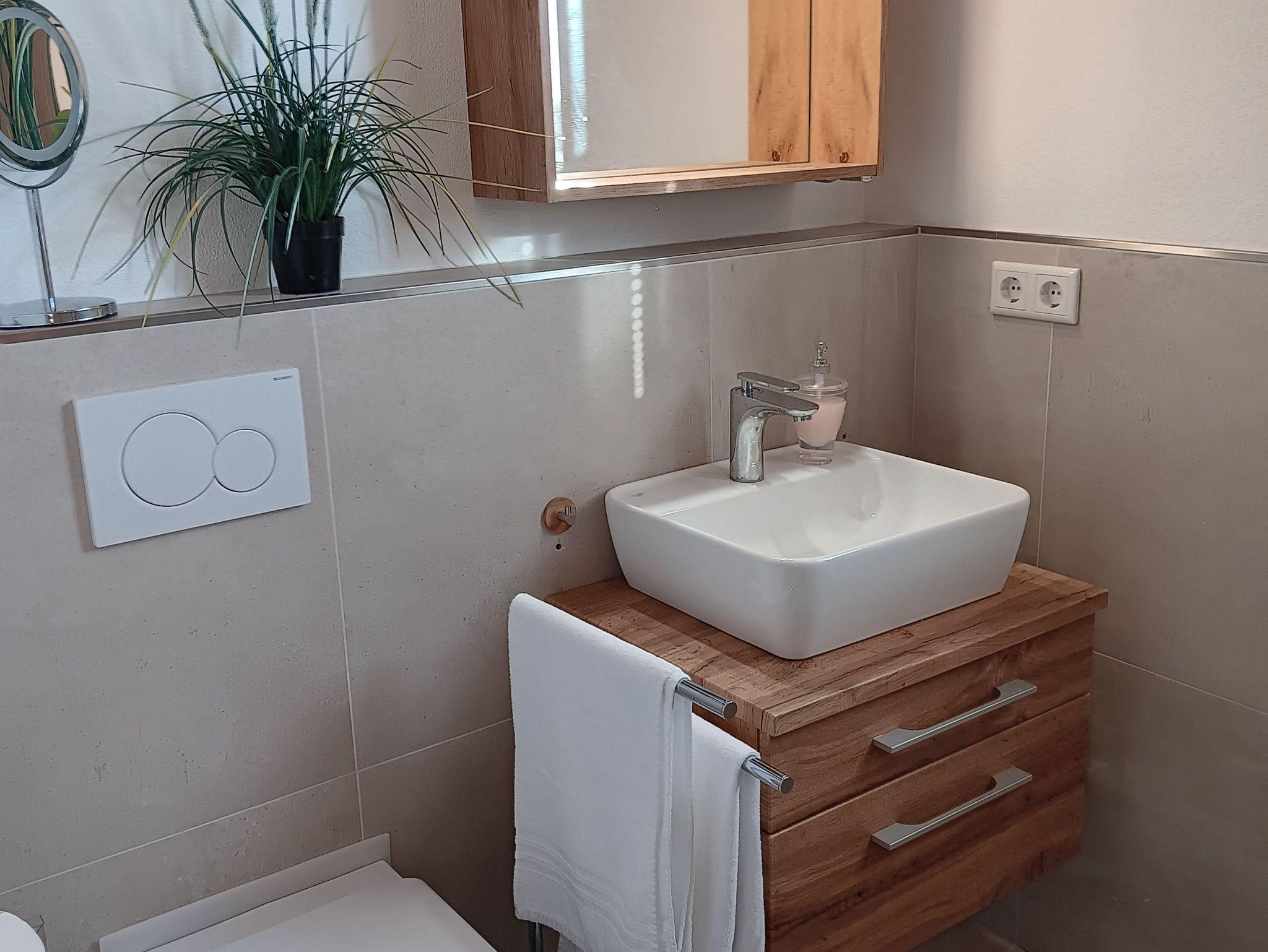 Das etwas kleinere Bad hat eine geräumige, barrierefreie Dusche, Waschbecken, WC.