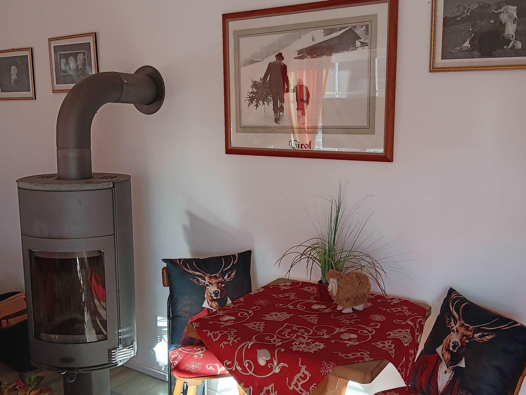 Schreibtisch und ein Eßtisch der Platz für 6 Personen bietet Außerdem ein Schwedenofen der die