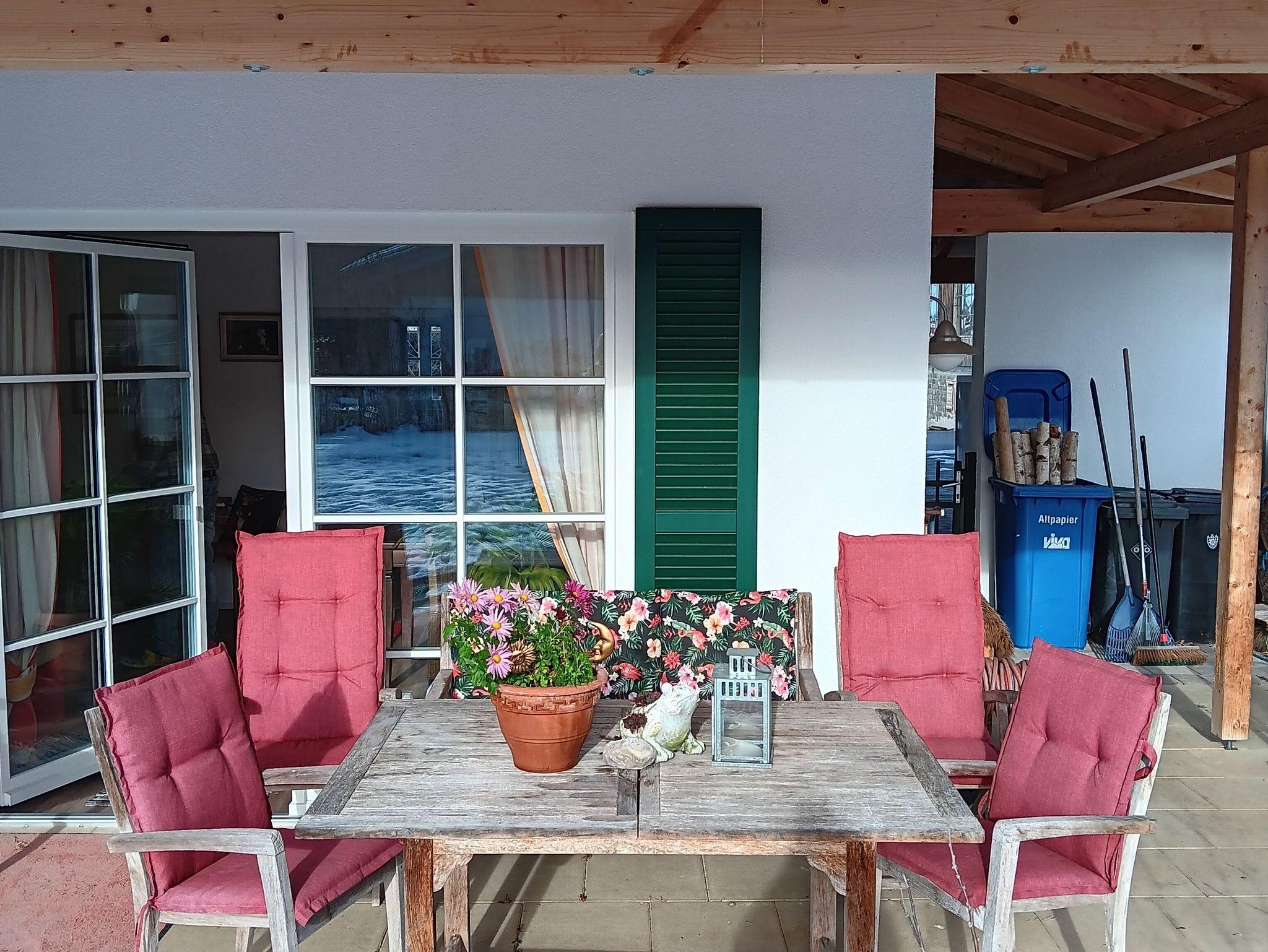 Auf der überdachten Terrasse mit Blick in den Garten erwarten dich schöne Teakholzmöbel,