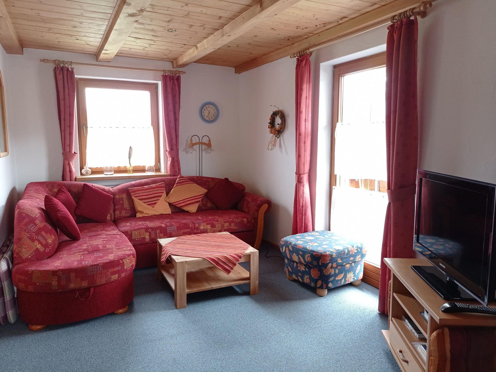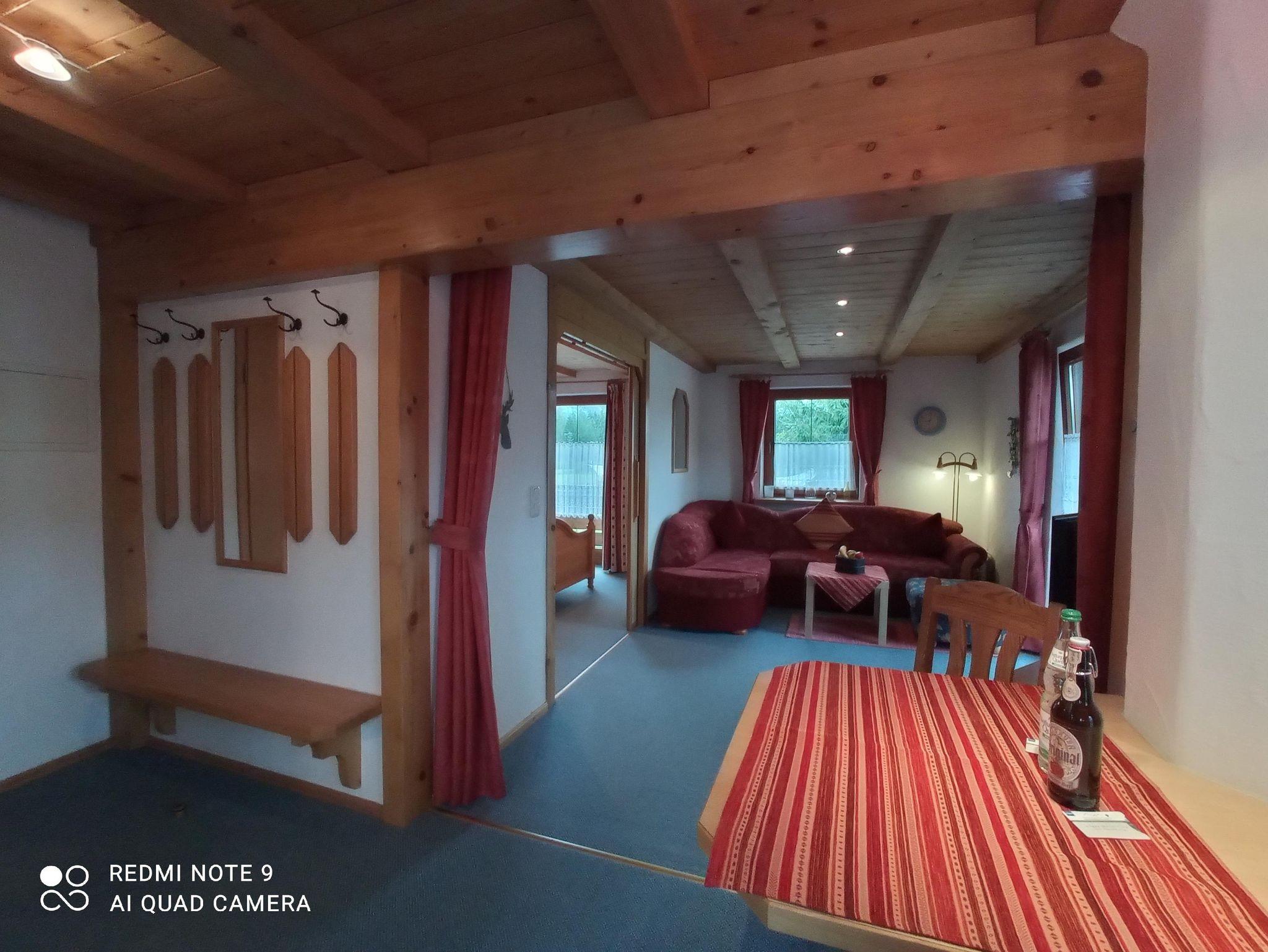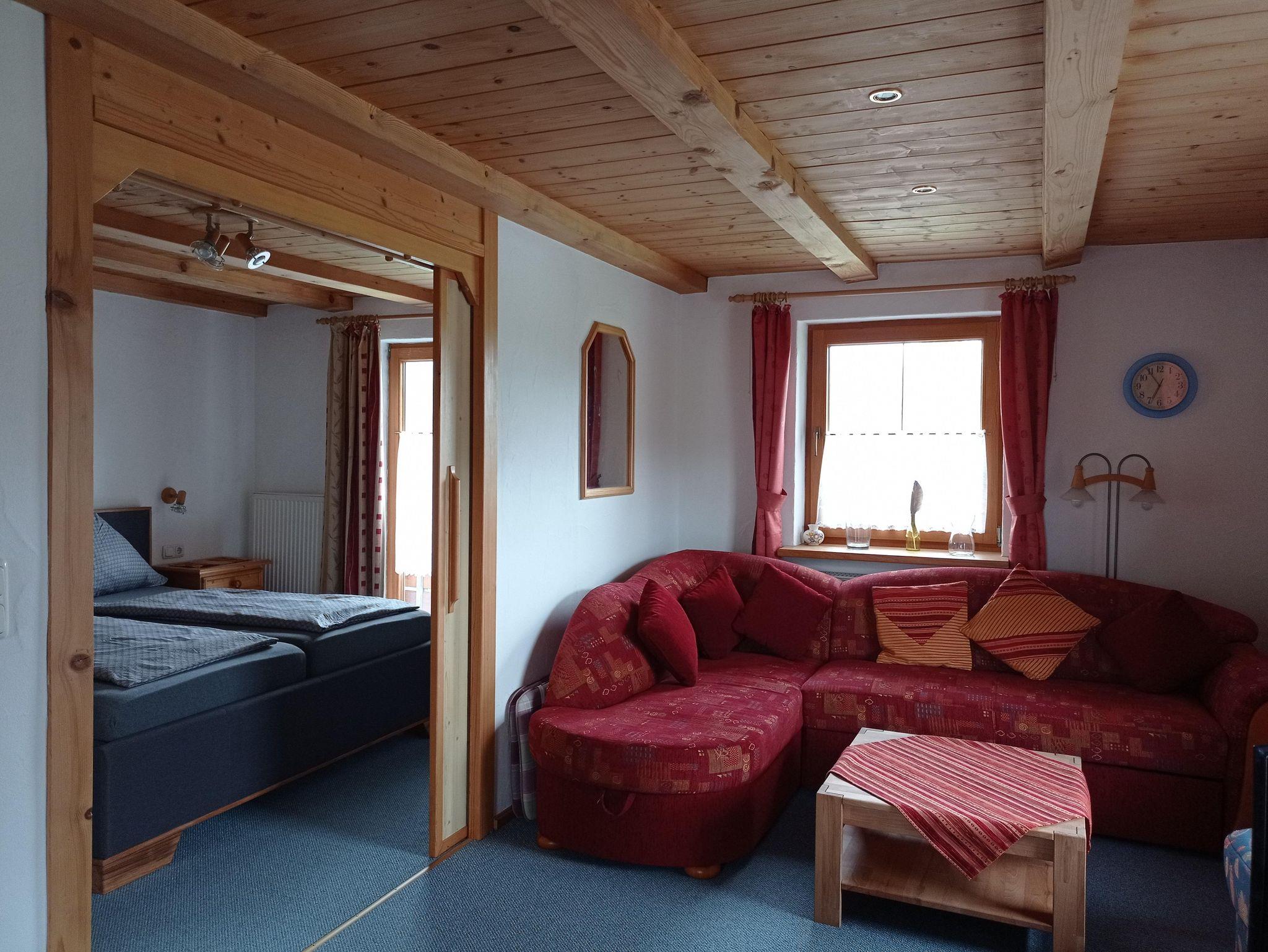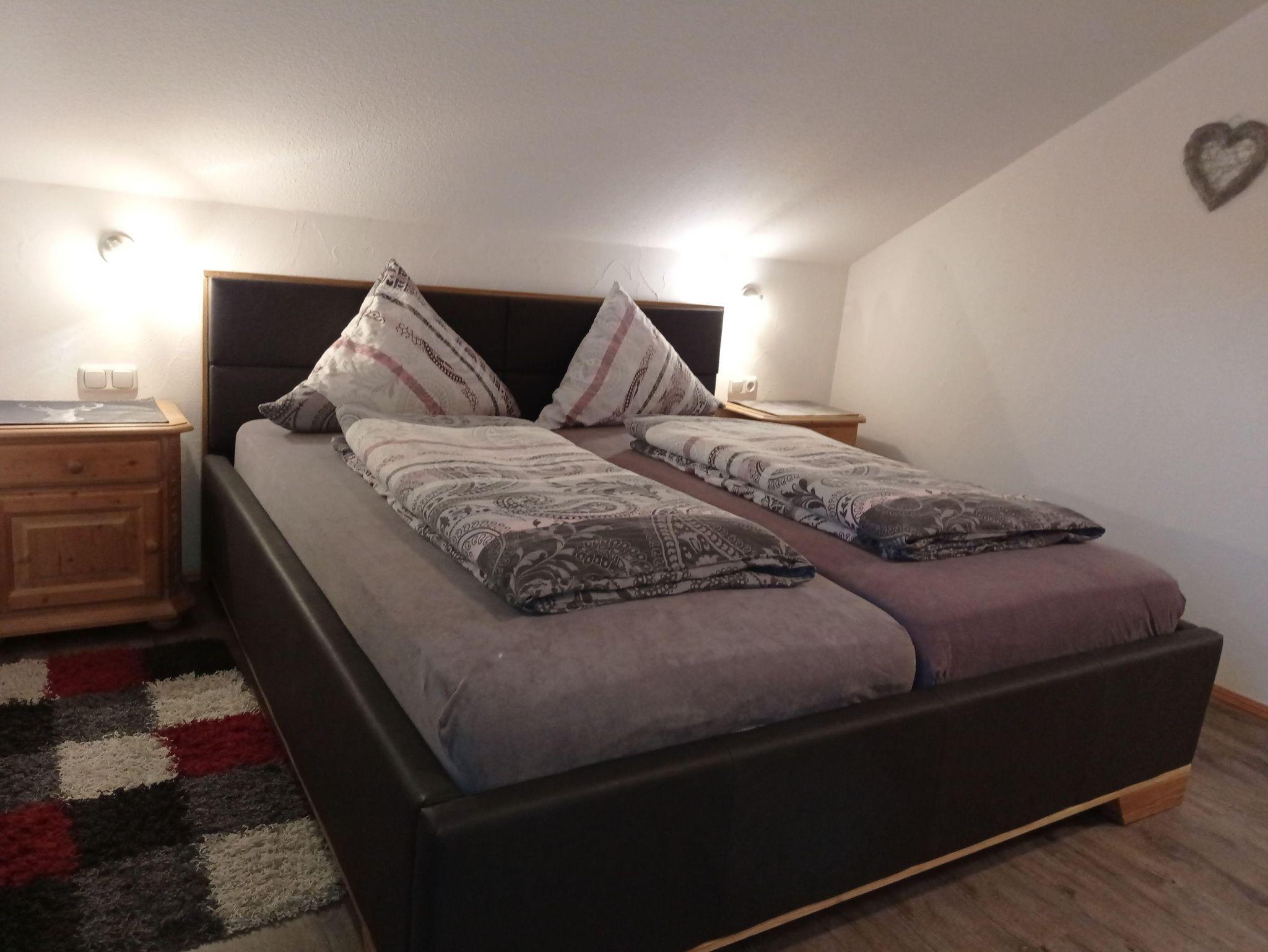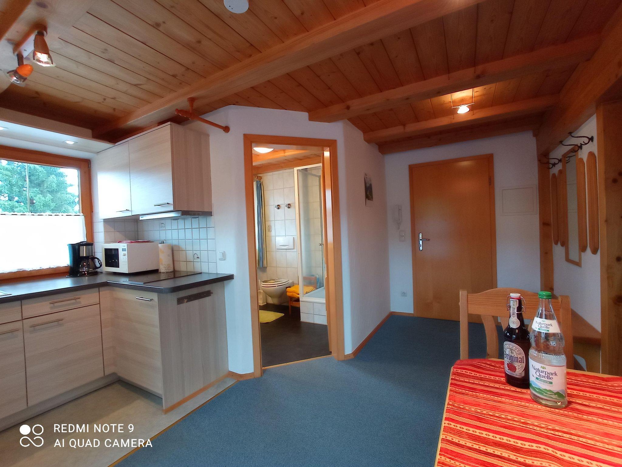 Die Fewo hat zwei Balkone Süd-u. Westseite, herrlicher Ausblick vom Südbalkon auf die Oberstdorfer Berge, Westbalkon Richtung Maderhalm. Helle rustikale Vollholzmöbel aus Fichte mit offener Holzbalkendecke und gemütliche Rundeckcouch, 2022 neue Betten mit neuen Matratzen und neues Bad/WC mit Duschtasse, geeignet für ältere Gäste!!!