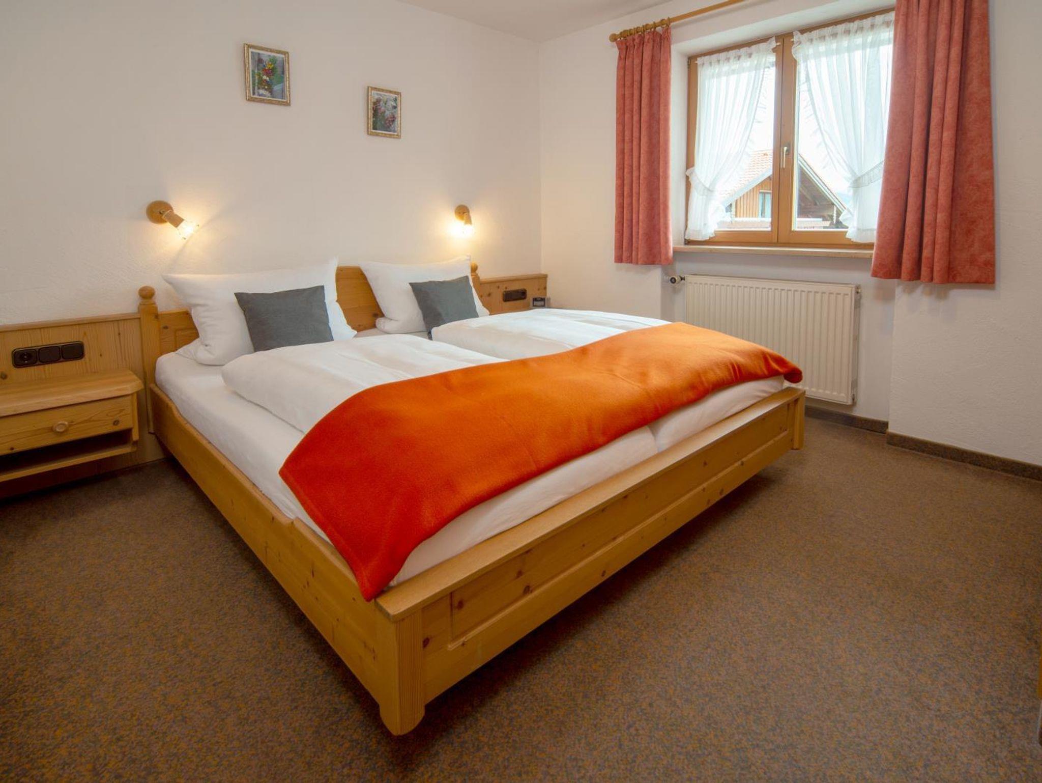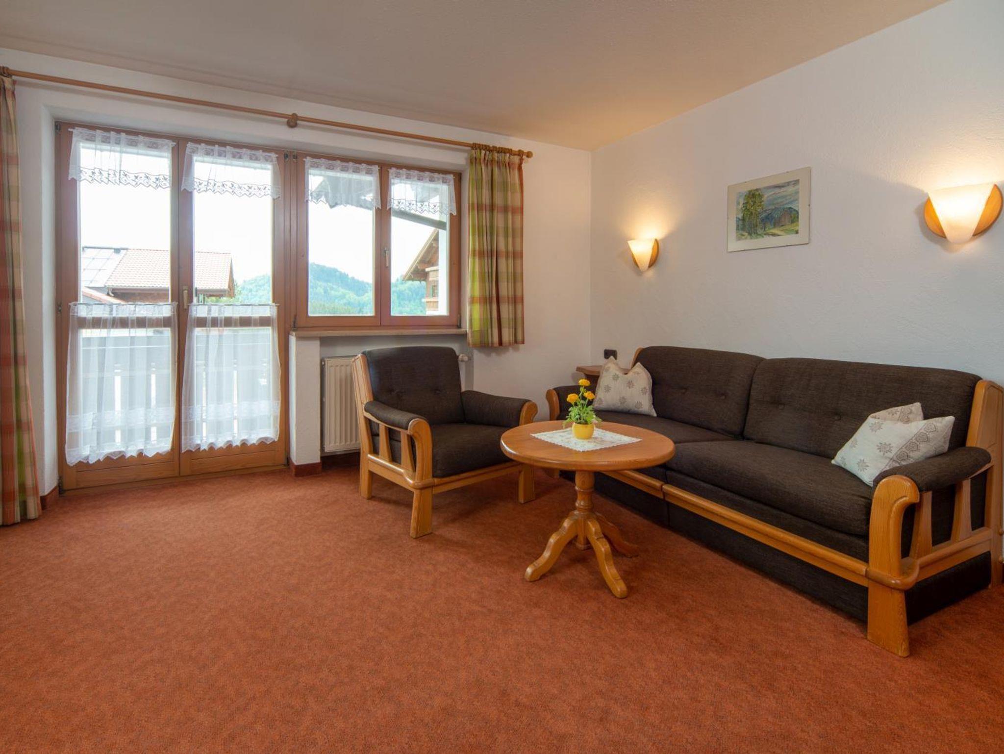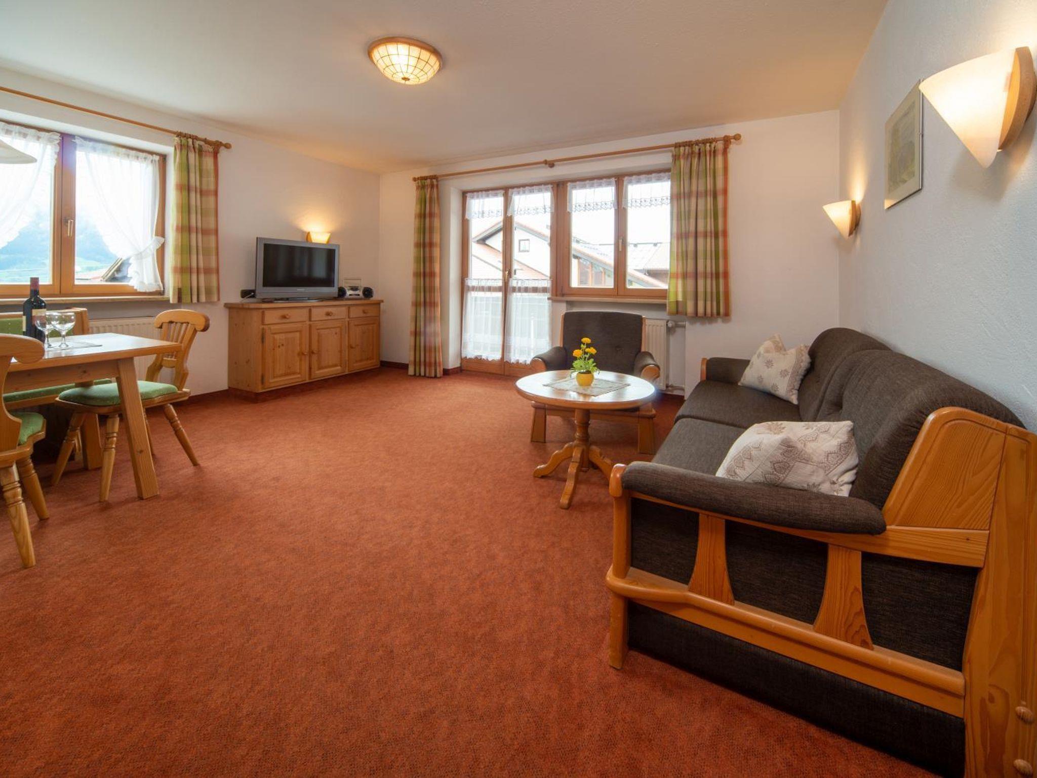 2-Zimmerwohnung (50 qm) mit Wohnzimmer und Doppelzimmer (offene Bettenden), separater Küche mit Spülmaschine und Mikrowelle, Dusche und separatem WC, Farb-TV, Radio und Südbalkon mit herrlichem Blick auf die Oberstdorfer Berge.