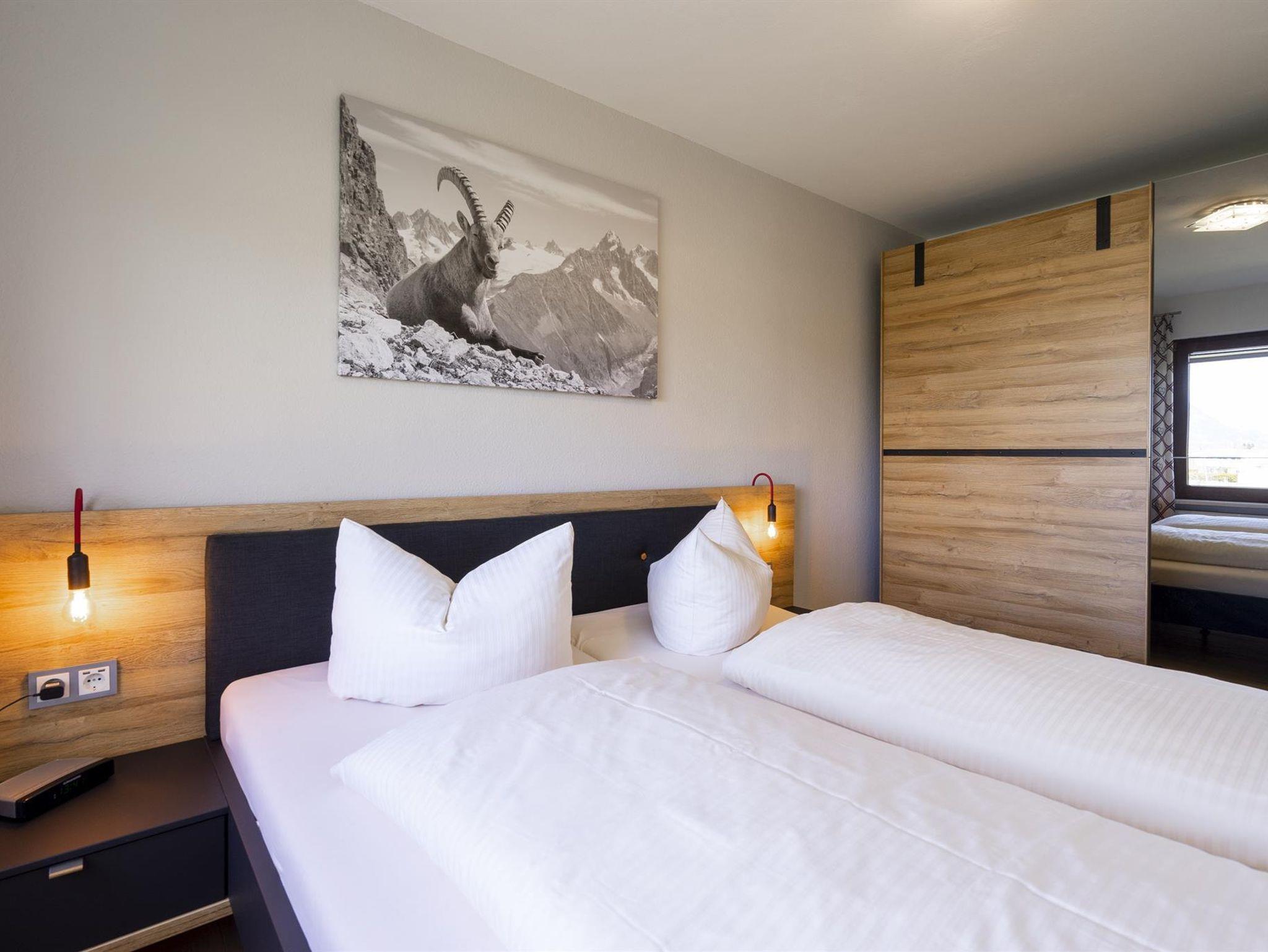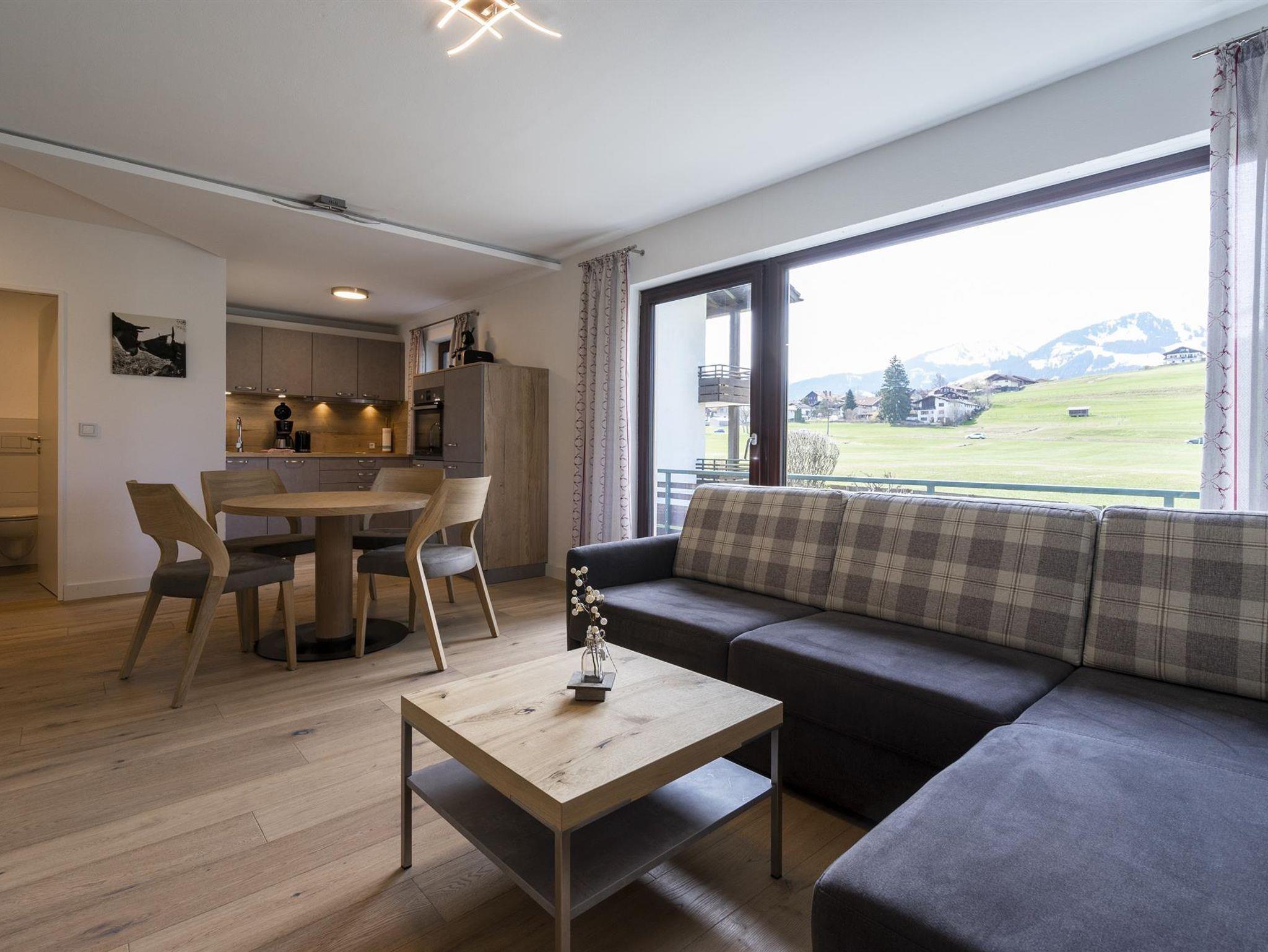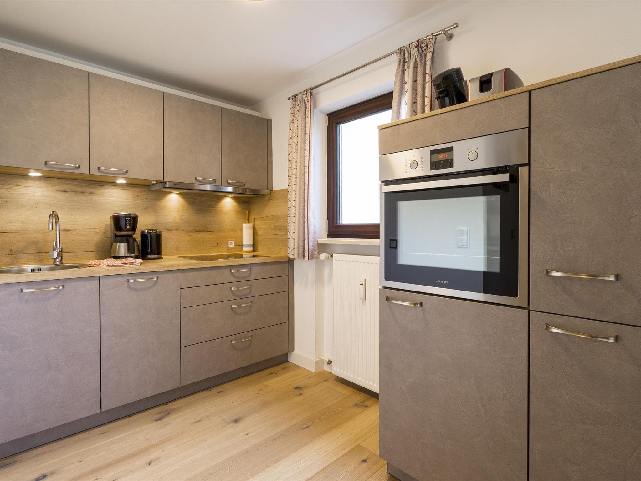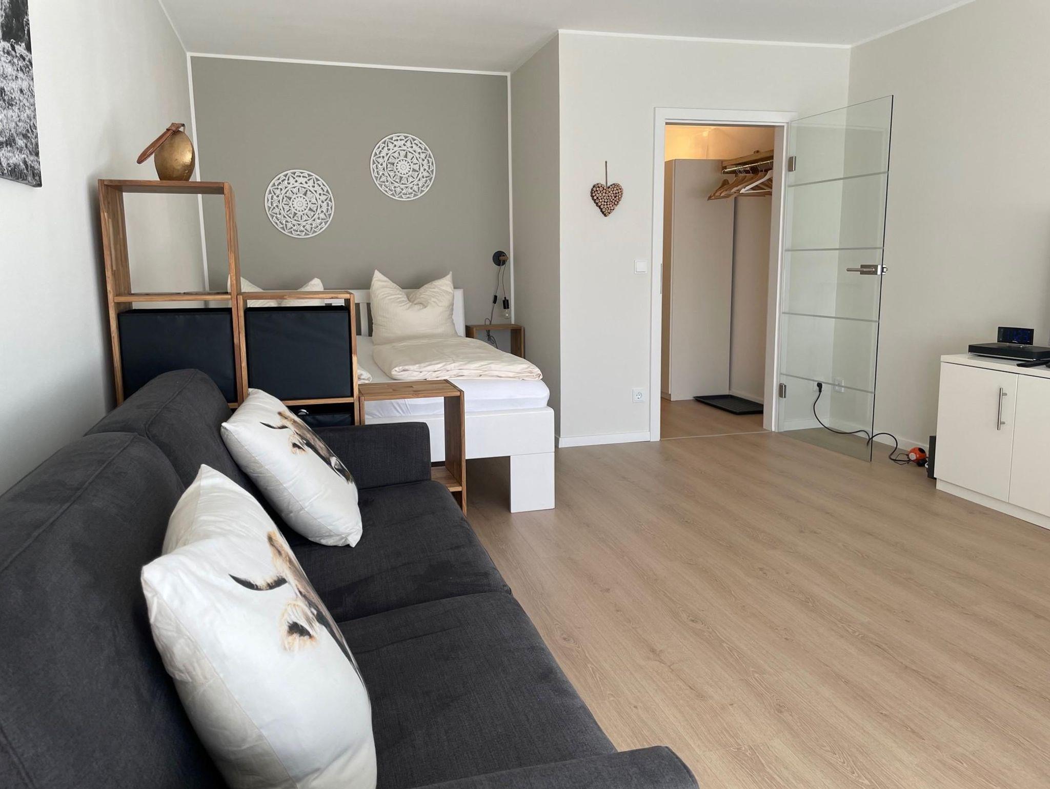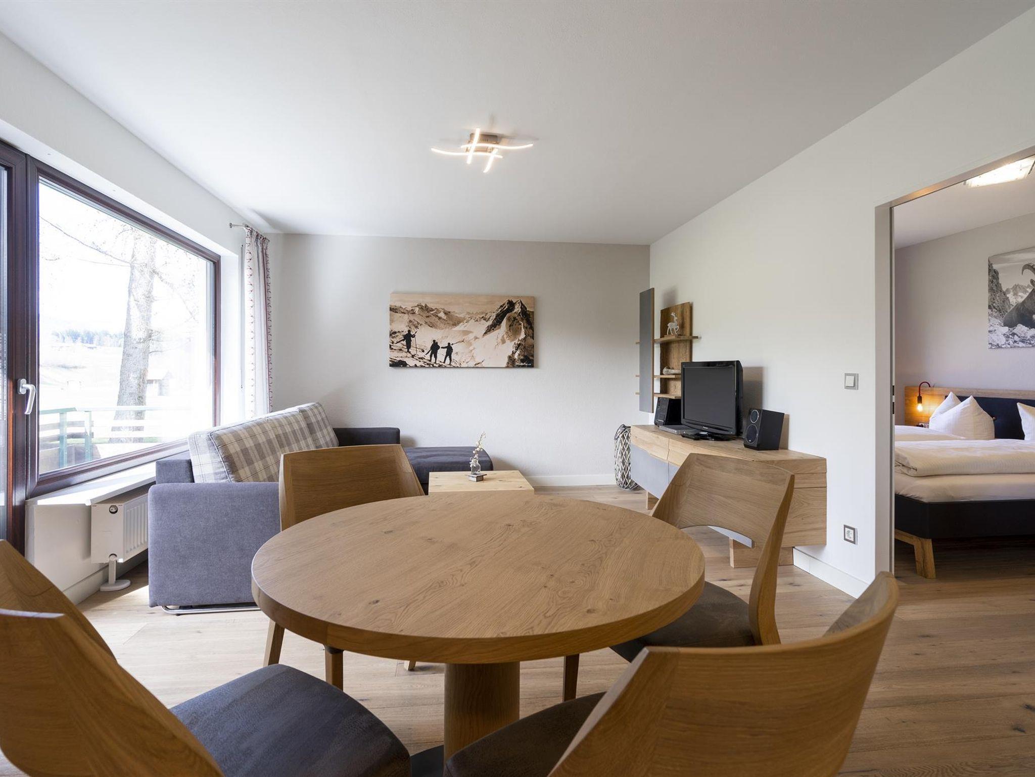 Moderne, komplett renovierte Ferienwohnung im Erdgeschoss, 50 qm für 2 Personen. Sie ist stilvoll mit Vollholzmöbeln in Erdfarben eingerichtet und hochwertig ausgestattet, u.a. mit einer Einbauküche mit Backofen und Spülmaschine. Auf dem überdachten West-Balkon genießt man die Nachmittags- und Abendsonne mit Blick auf die Berge der Hörnerkette.