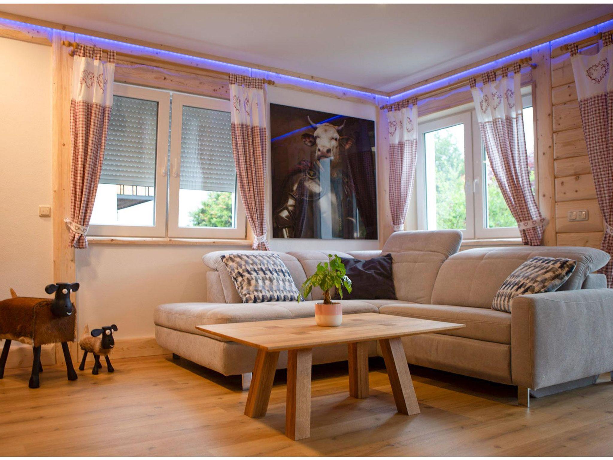 • Ferienwohnung Alpenglück (Erdgeschoss): ca. 80 m², Terrasse, Garten, 2 Schlafzimmer (Kinderbett optional), für 4 Personen. Gemütliche Sofaoase und Zugang zur Natur.