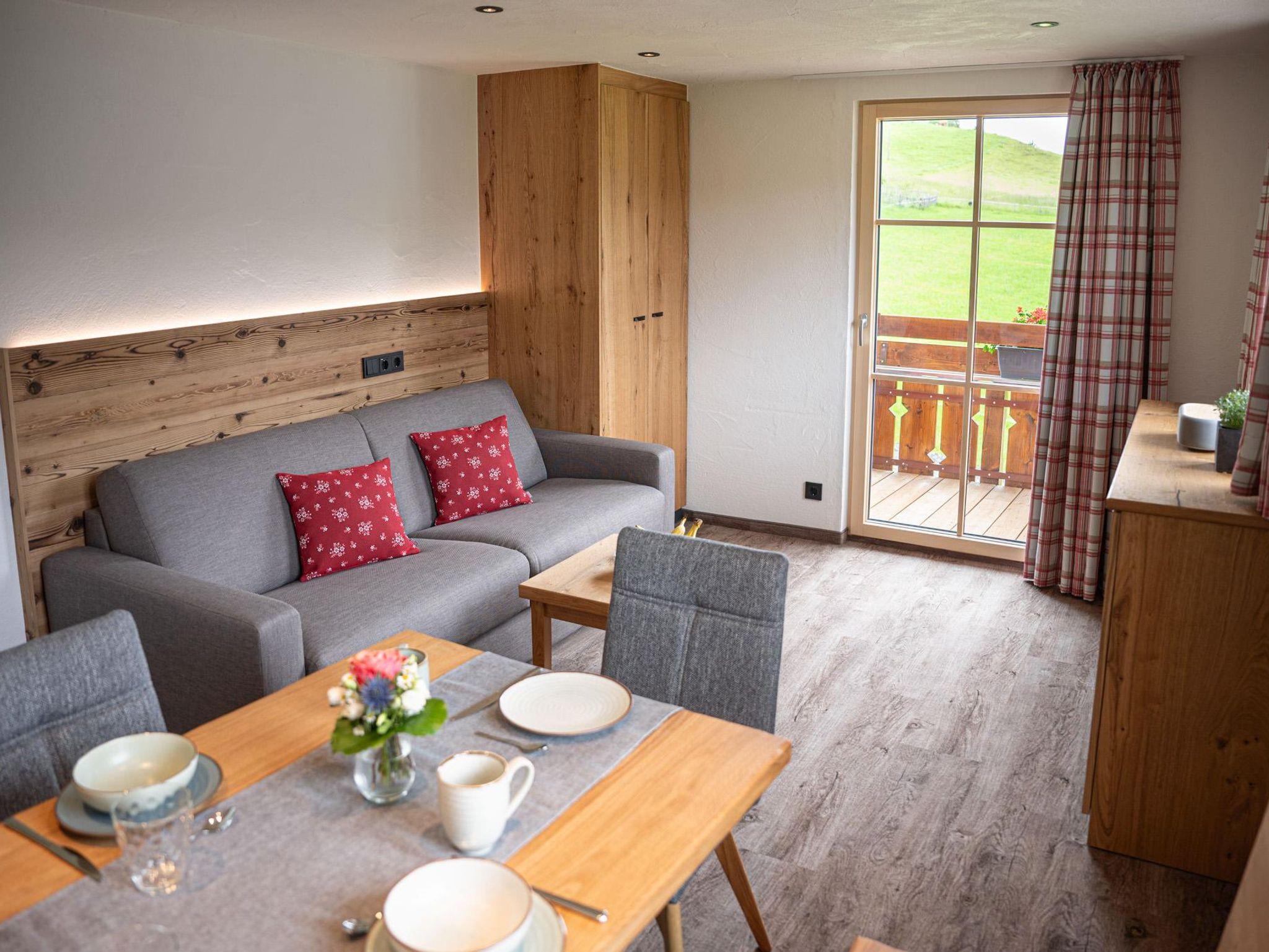 Ferienwohnung Sonnenkopf eignet sich ideal für Familien mit bis zu 2 Kindern oder Ruhesuchenden, die gerne ein wenig mehr Platz möchten. Das getrennte Schlafzimmer und die großzügig, ausklappbare Schlafouch im Wohnbereich bieten eine Heimat für 1-4 Personen. Balkon mit Morgensonne inklusive.