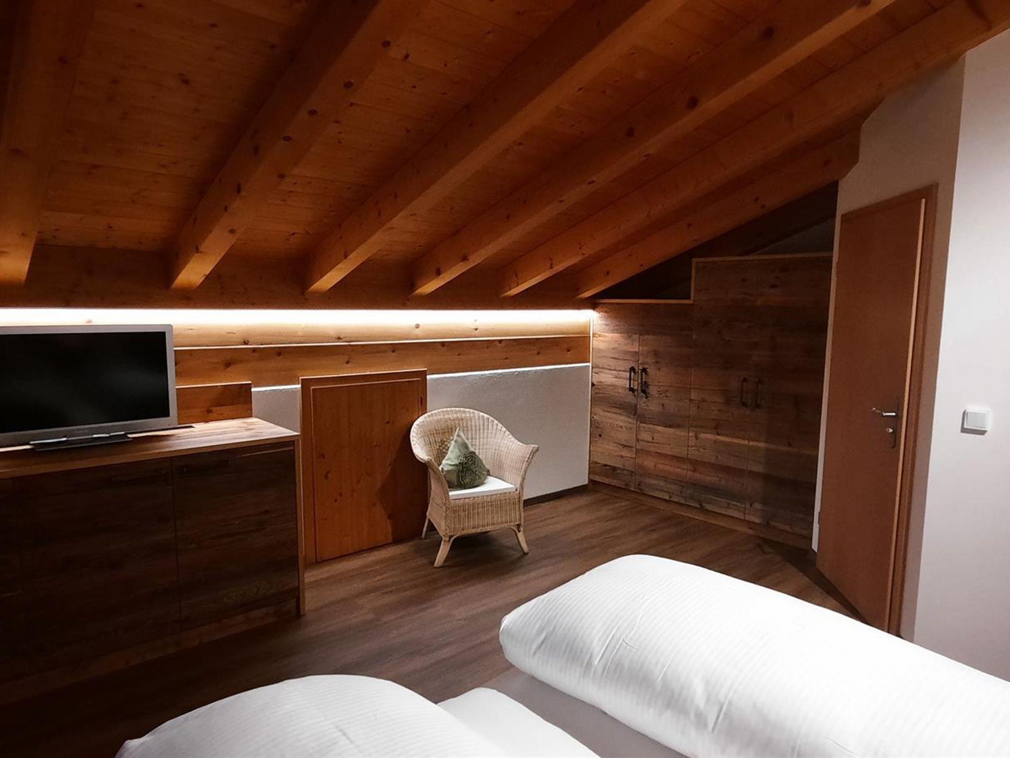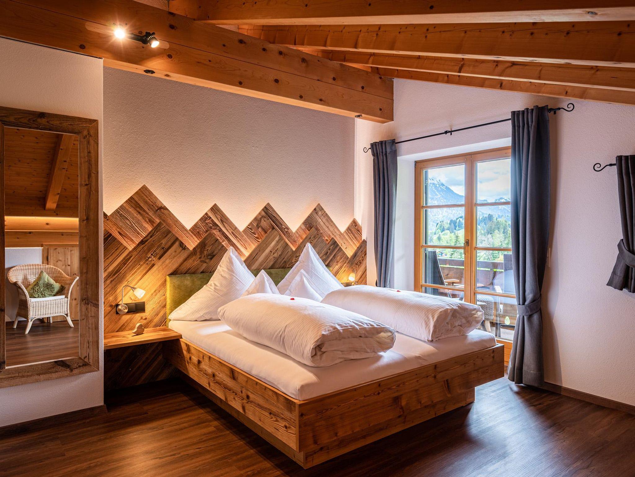 • Schalfzimmer 1 mit massgefertigten Schreinermöbeln aus sonnenverbranntem Holz, Bettrückwand aus ausgesägten Bergen mit LED-Beleuchtung, Sat-TV