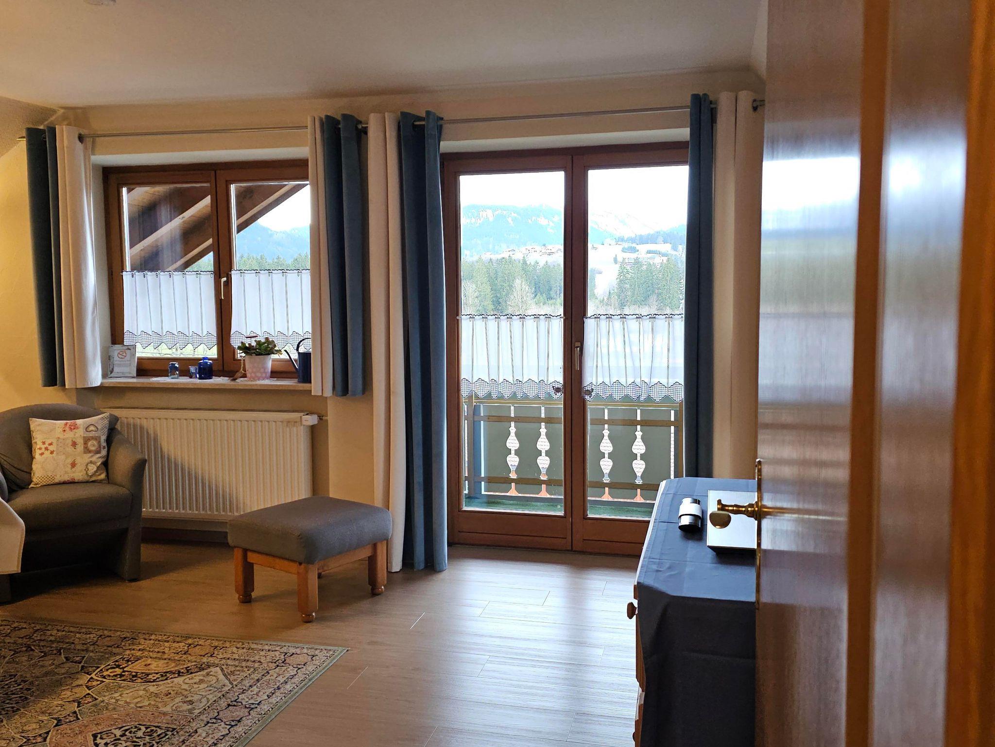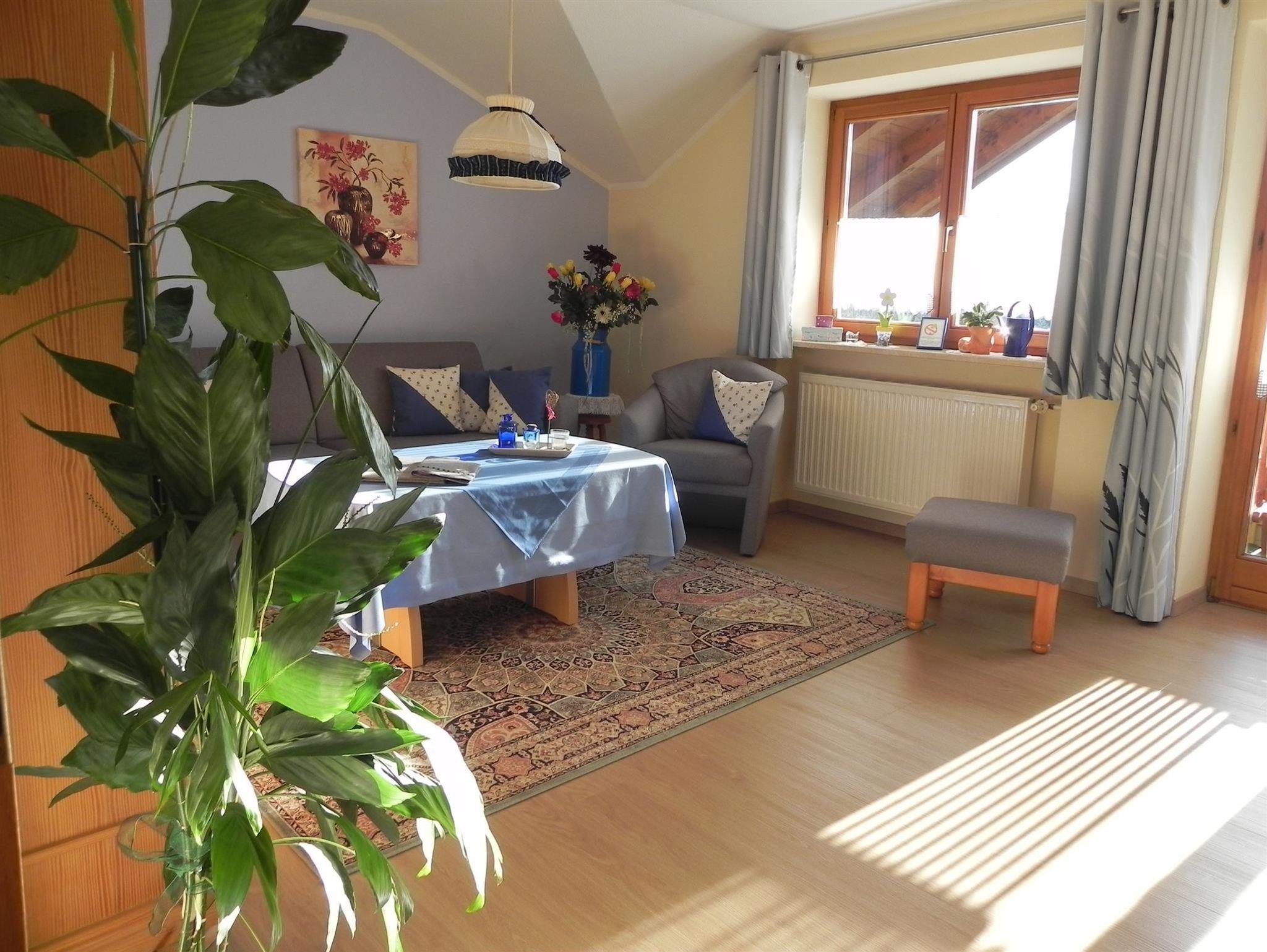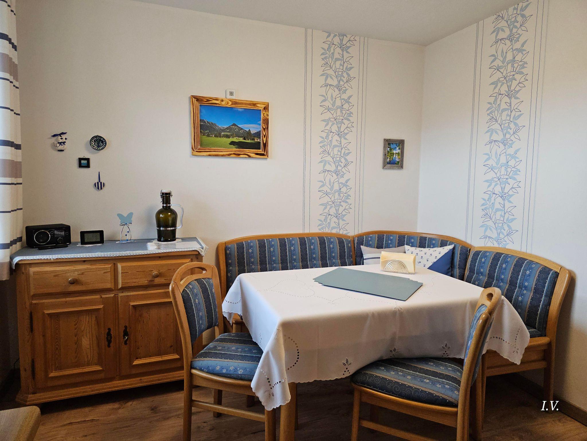 Diese ländlich ausgestattete Obergeschosswohnung in blauem Ambiente bietet Ihnen auf dem Westbalkon ausreichend Platz für sonnige Stunden bei Kaffee u. Kuchen; und ein gemütliches Abendbrot im Sonnenuntergang,mit Blick auf die Bolsterlanger Bergkette. Eine separate voll ausgestattet Küche mit Eckbank, ein Tageslichtbad und ein kuscheliges Schlafzimmer komplettieren die Ausstattung.