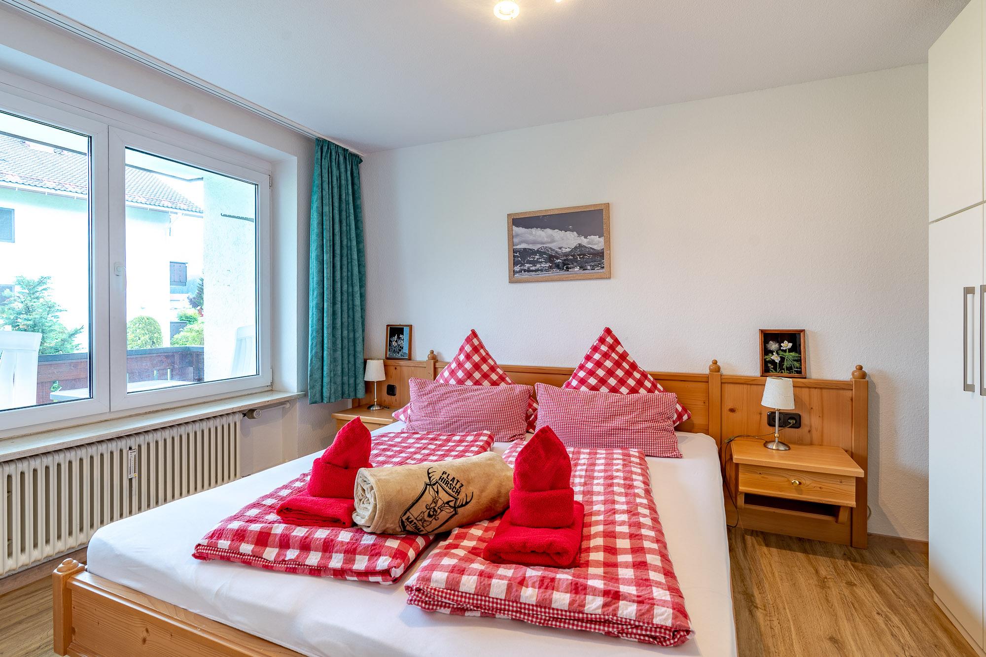 Das Schlafzimmer mit Bergblick bietet Ihnen ein Doppelbett einen geräumigen Kleiderschrank.