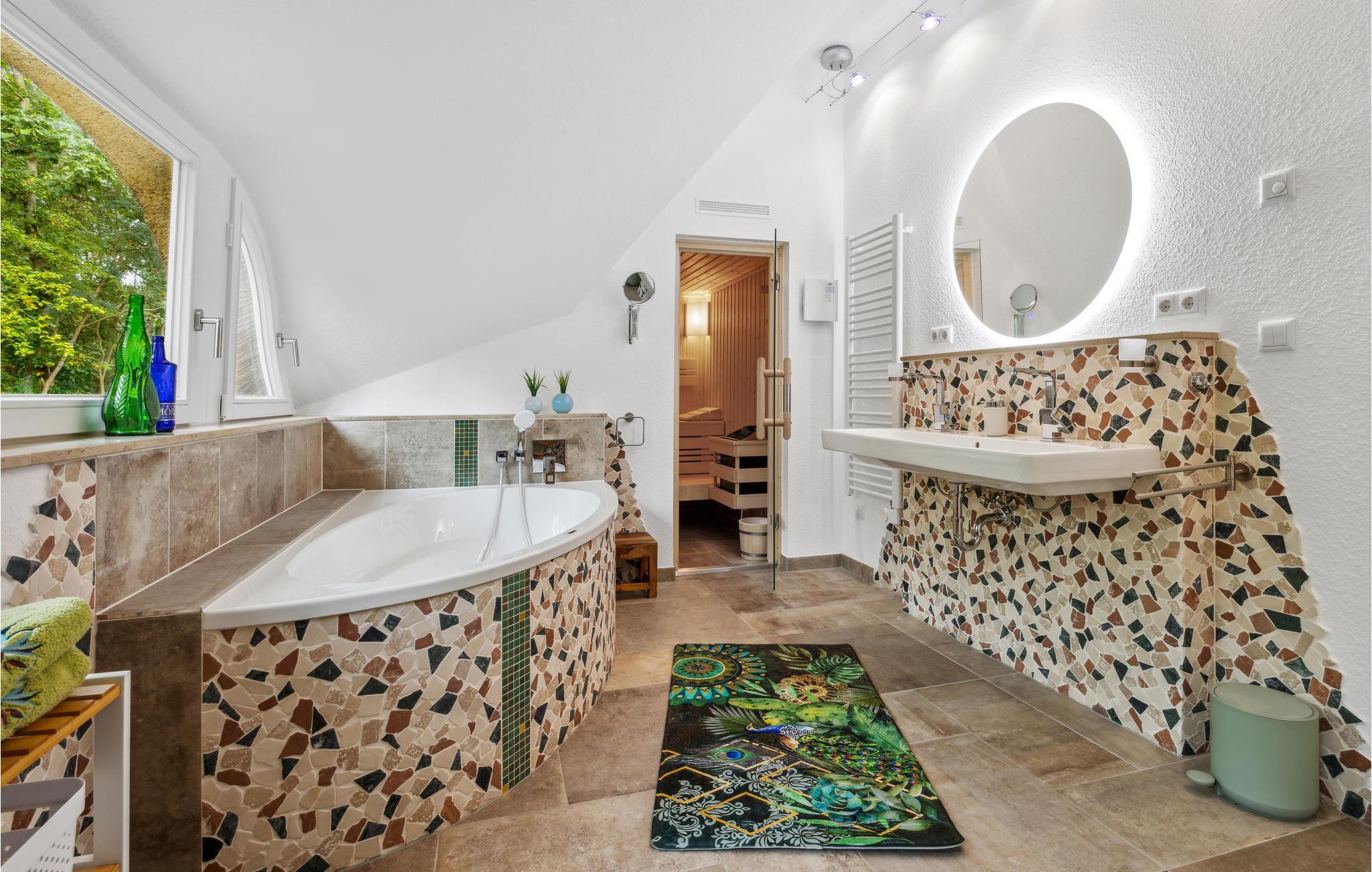 Dette hus er fordelt over to etager, som er personligt indrettet med markante fototapeter og velvalgte møbler. Brændeovnen bidrager med en hyggelig varme i stuen. Find sammen om brætspil og hyggelige samtaler i sofaen eller ved spisebordet og forkæl jer selv med en rolig stund i den private infrarøde sauna. Fra det kombinerede opholds- og spiseområde er der adgang til terrassen, hvor I kan nyde Usedoms mange skønne solskinstimer.