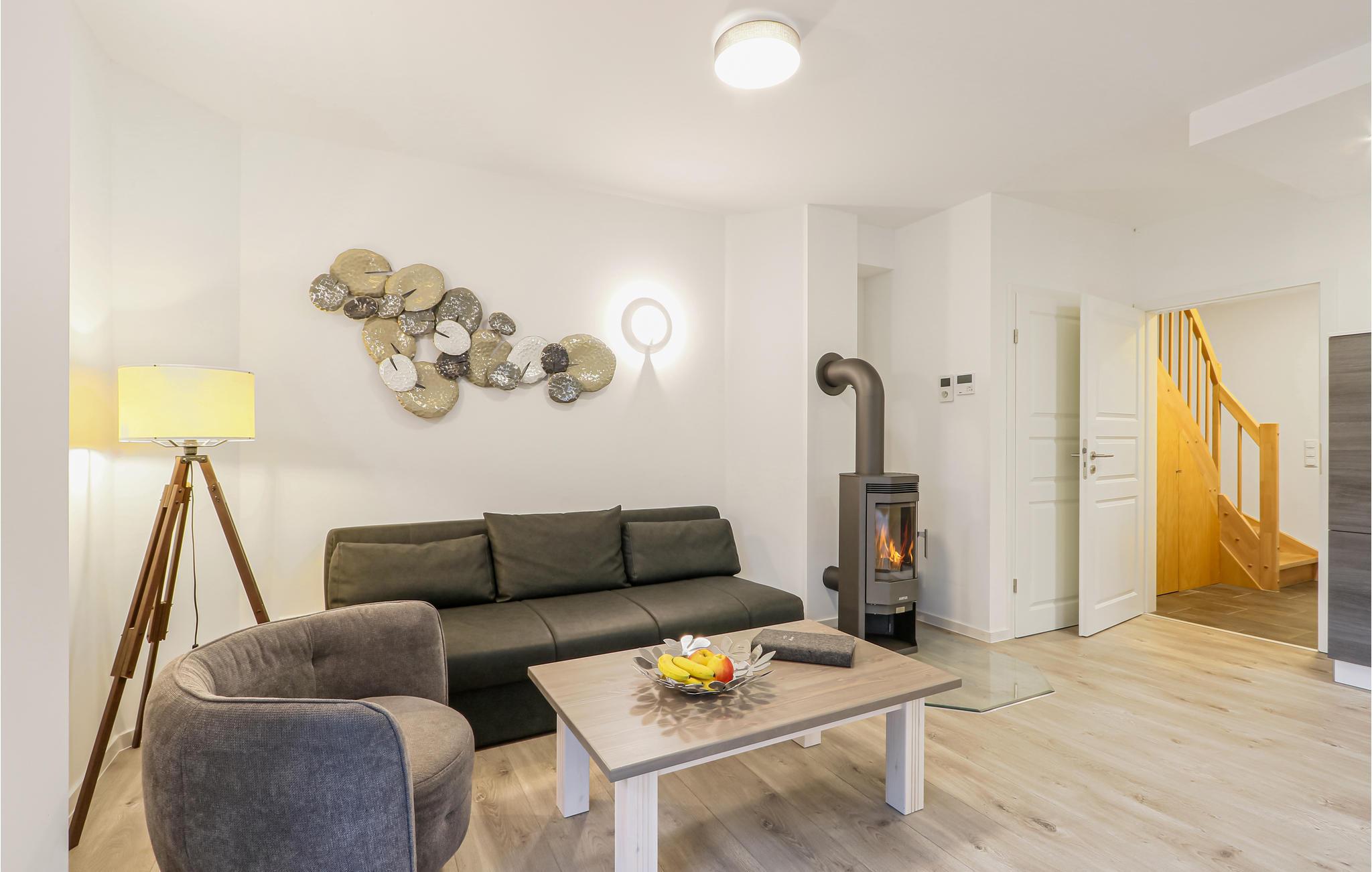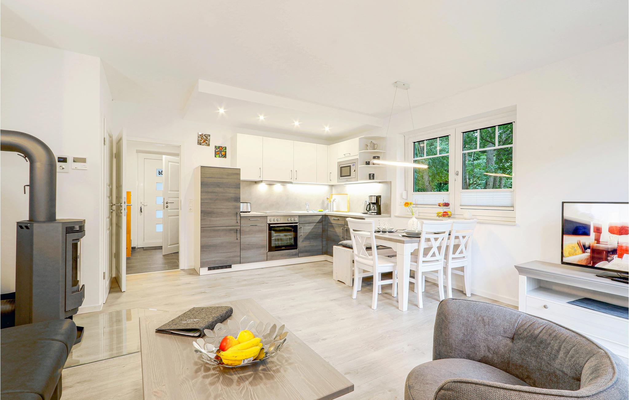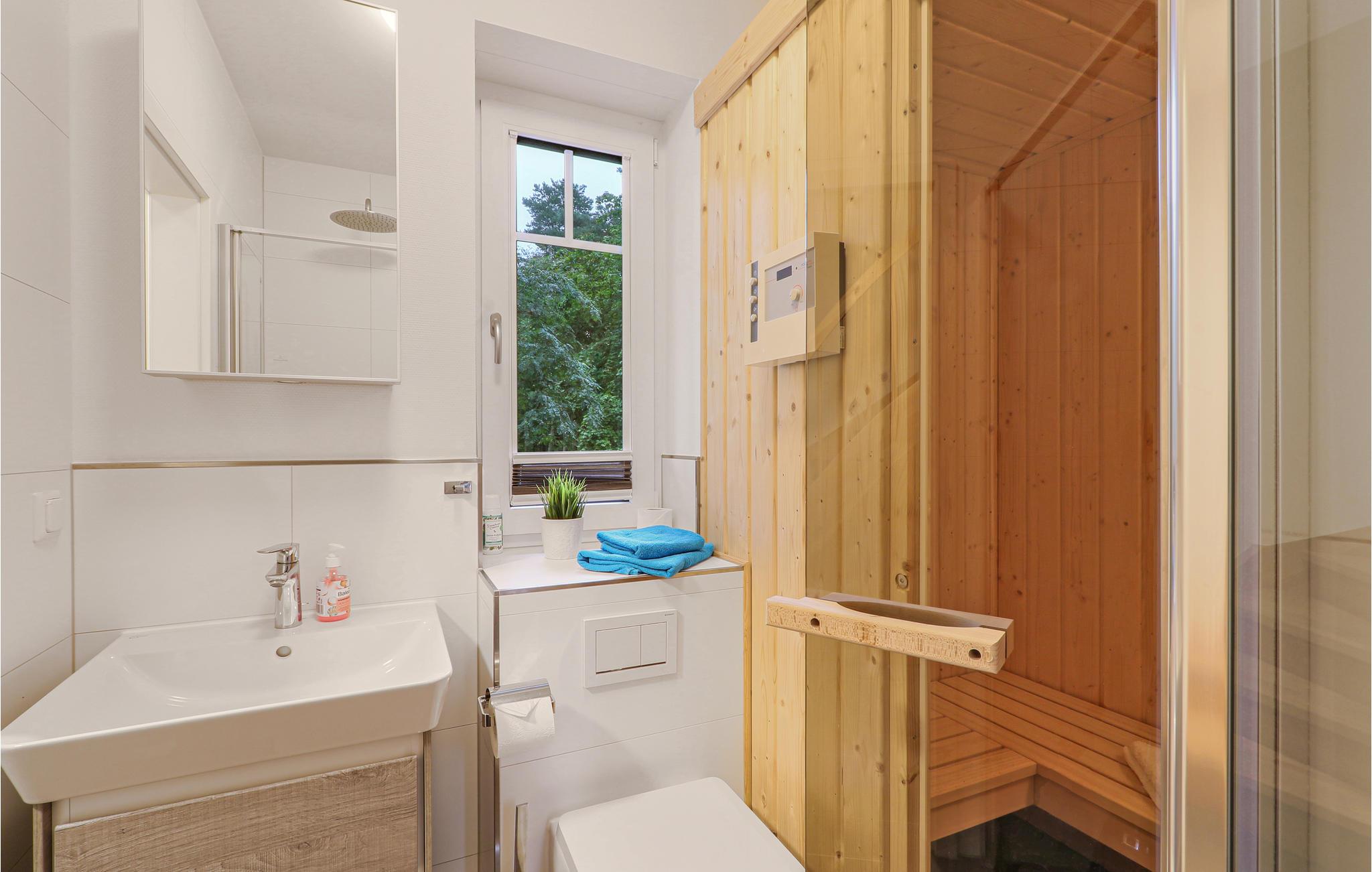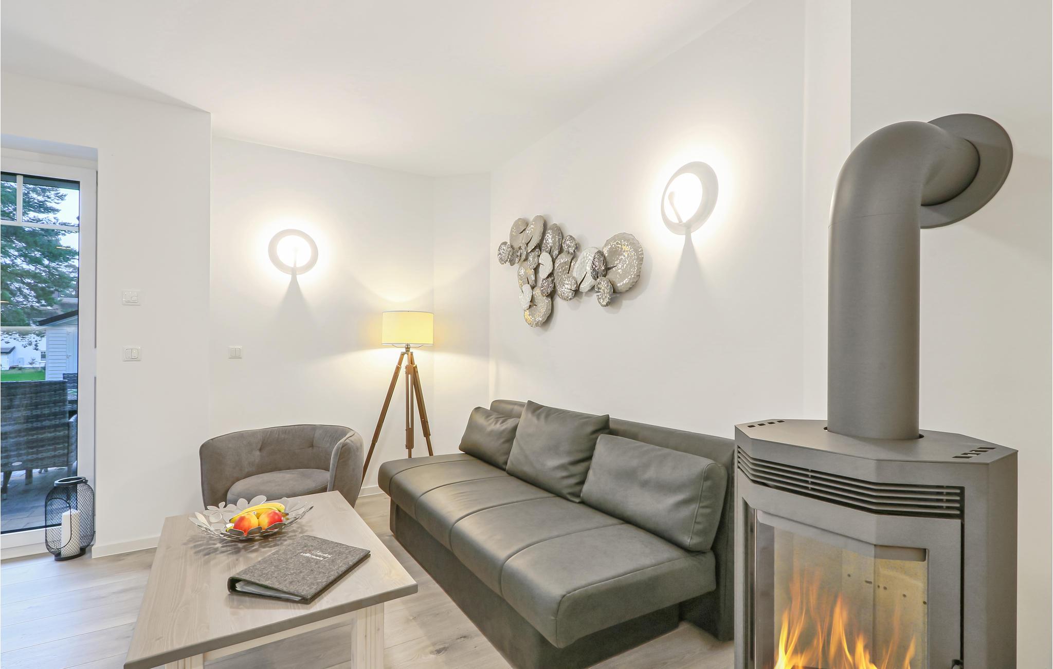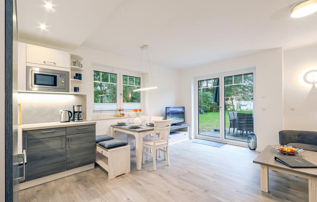 Det halve dobbelthus 'Waldidylle' fordeler sig over to etager og er moderne og indbydende indrettet. Fra den kombinerede stue- og spisestue er der udgang til en terrasse. På kølige dage er det dejligt at sidde i saunaen og blive varm eller tænde op i brændeovnen.