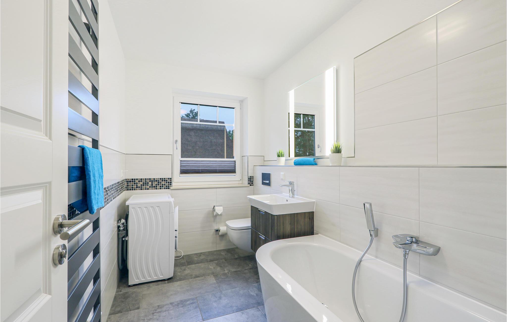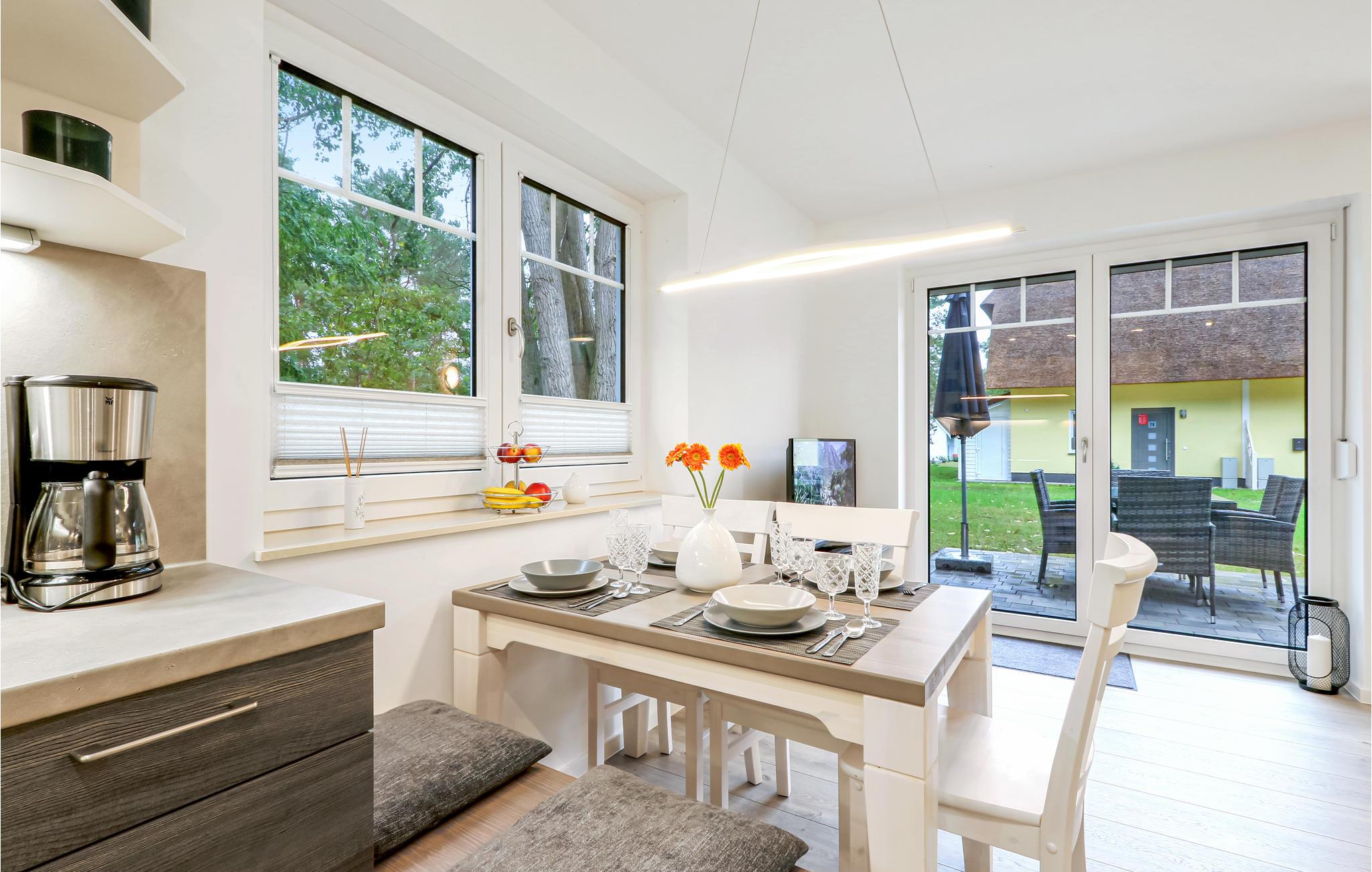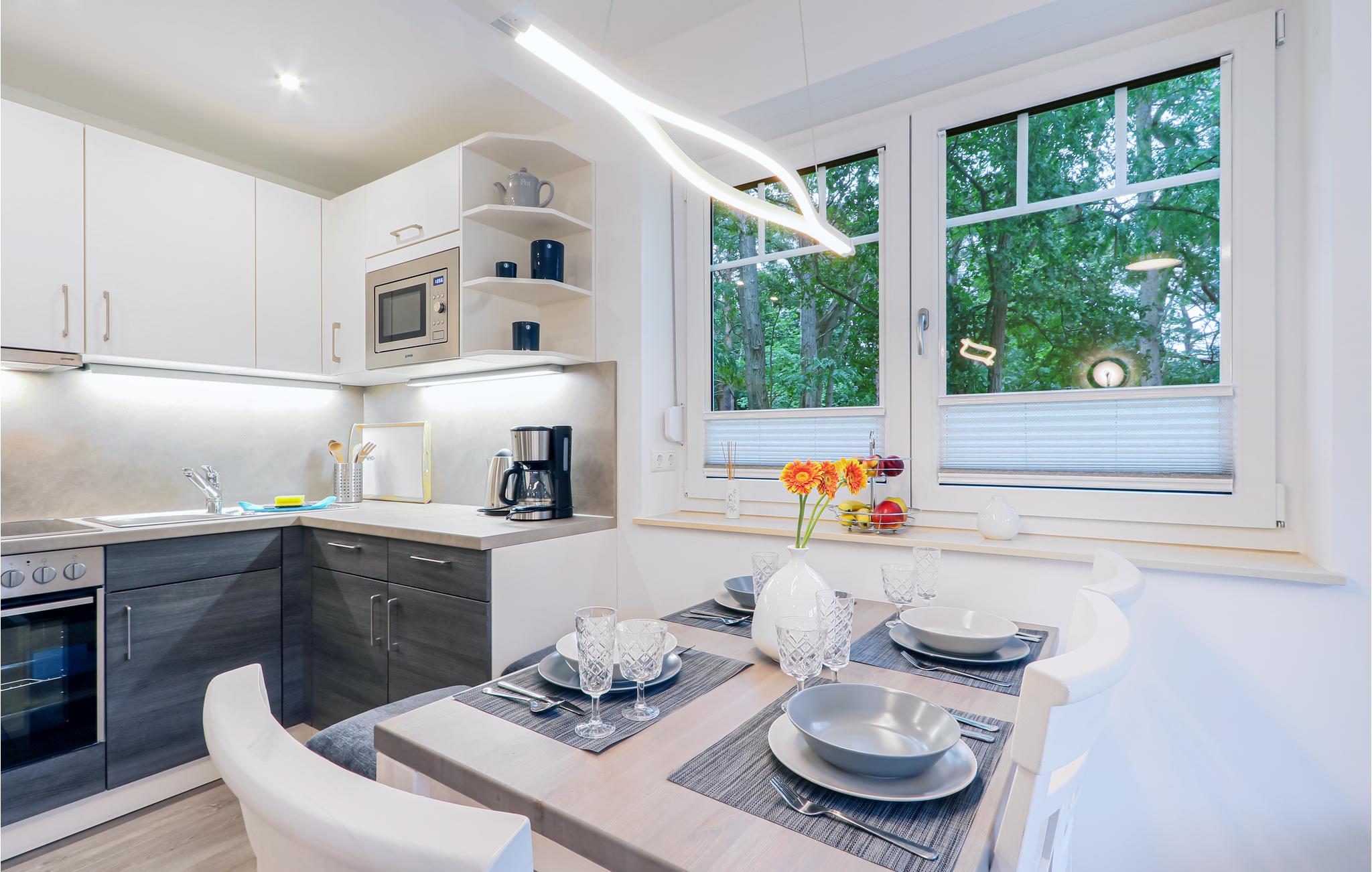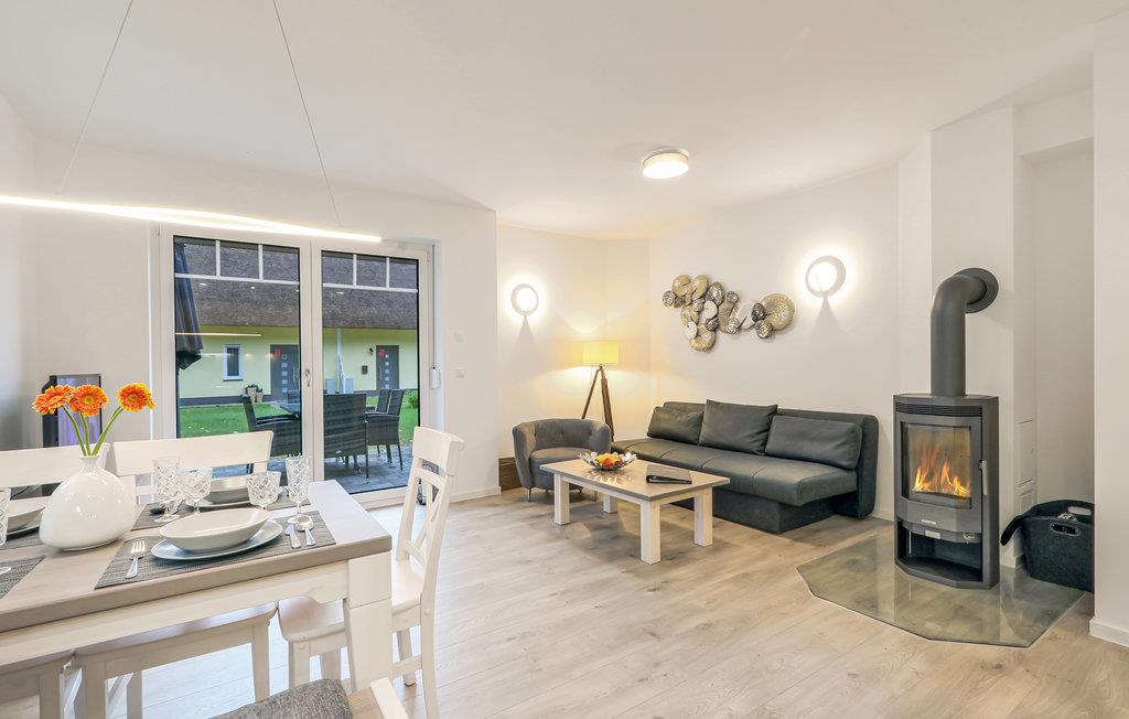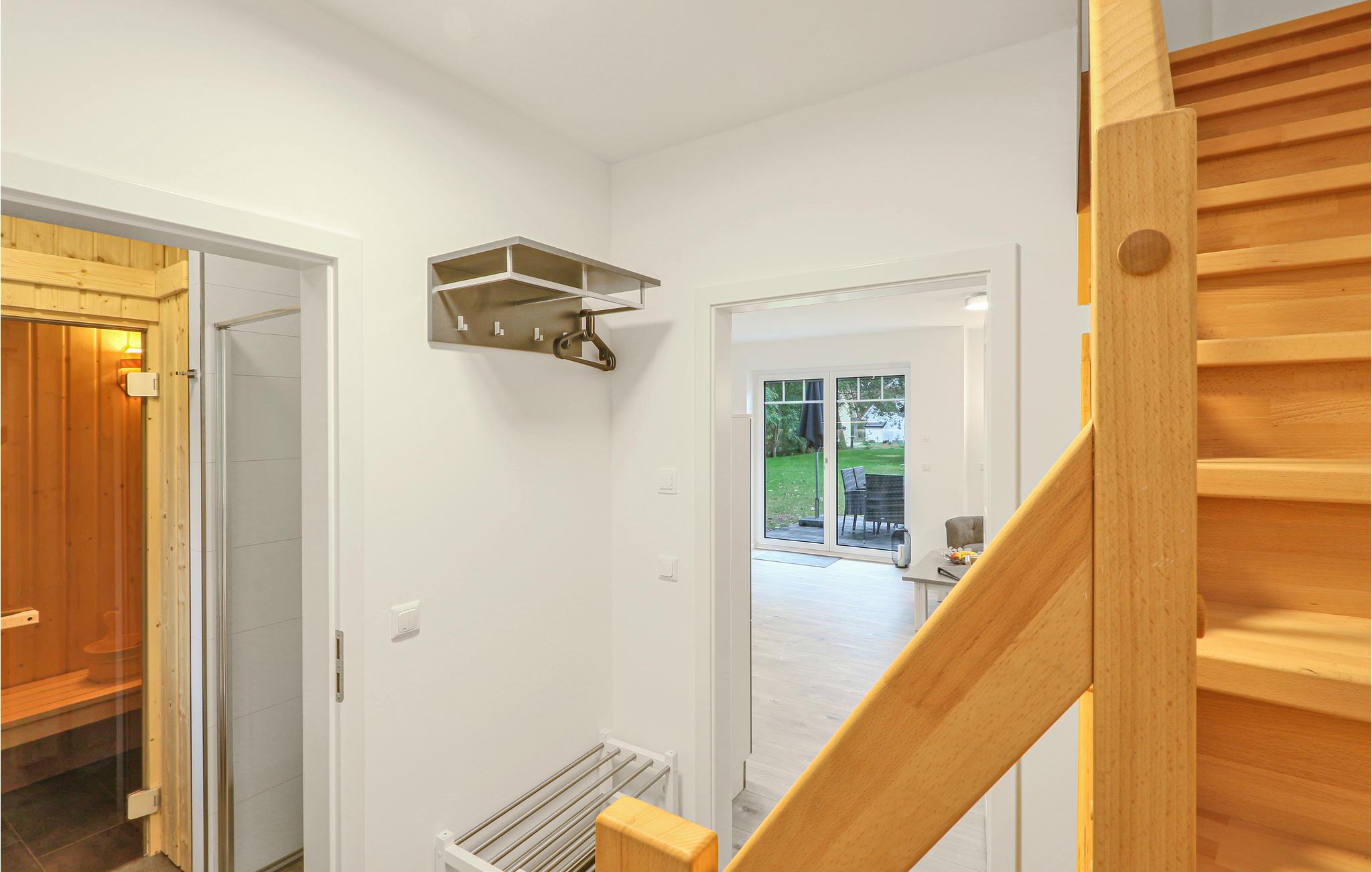 Det halve dobbelthus 'Waldidylle' fordeler sig over to etager og er moderne og indbydende indrettet. Fra den kombinerede stue- og spisestue er der udgang til en terrasse. På kølige dage er det dejligt at sidde i saunaen og blive varm eller tænde op i brændeovnen.
