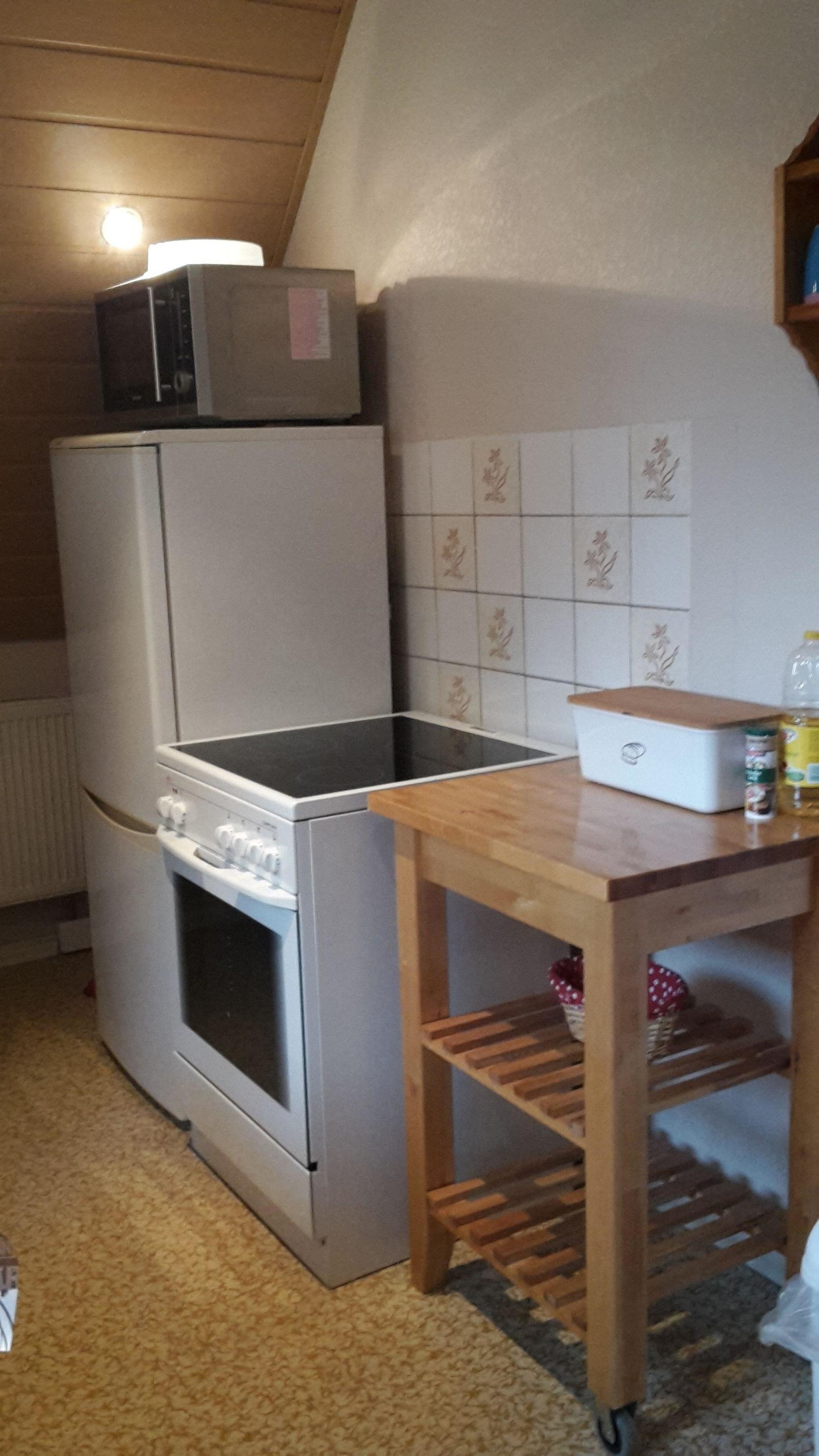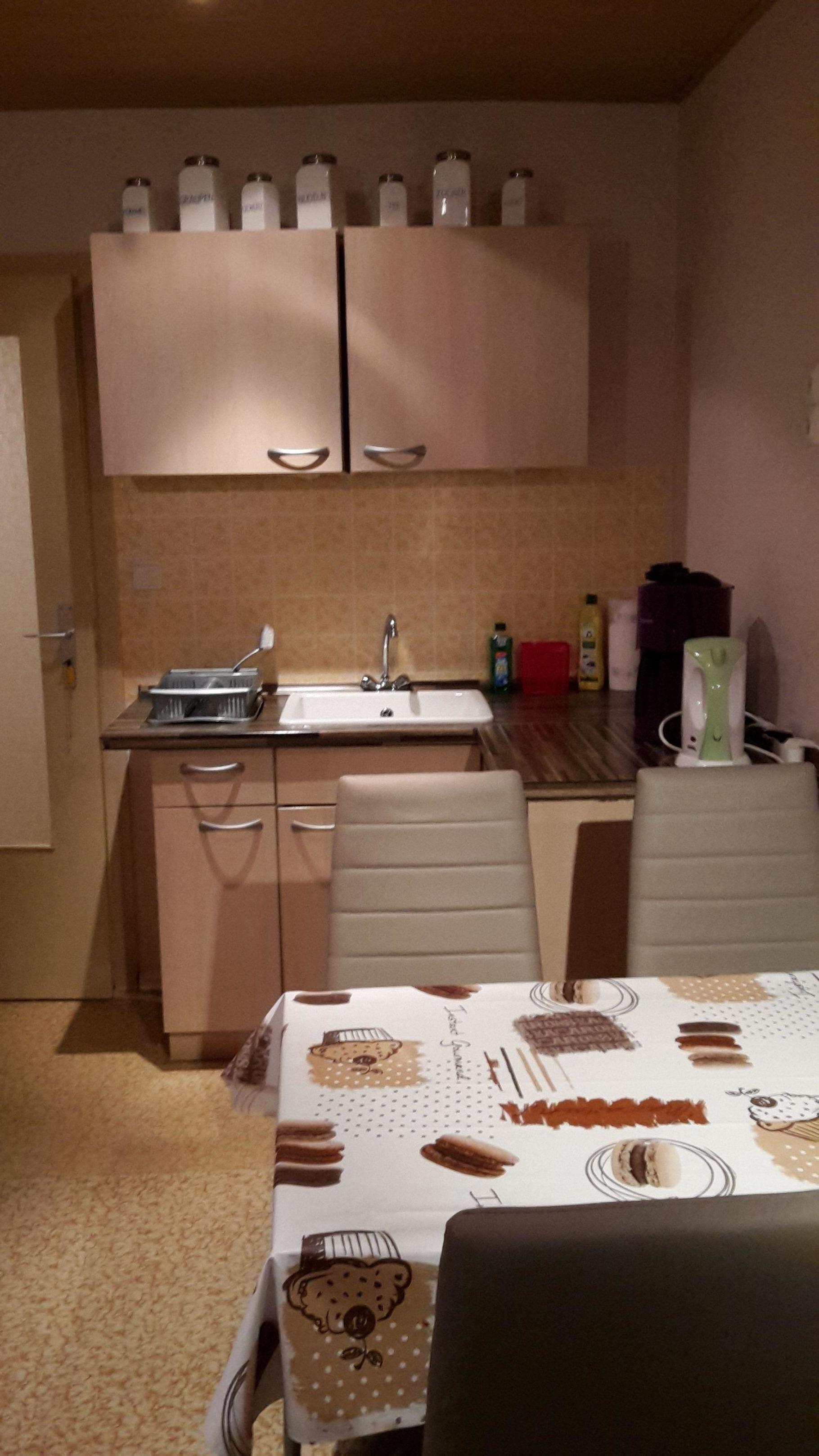 Die Küche bietet alle Kleingeräte die man braucht . Die Wohnstube ist 32 m² gross und hat zwei Schlafsofas , mit Essecke und kleiner Spielecke.