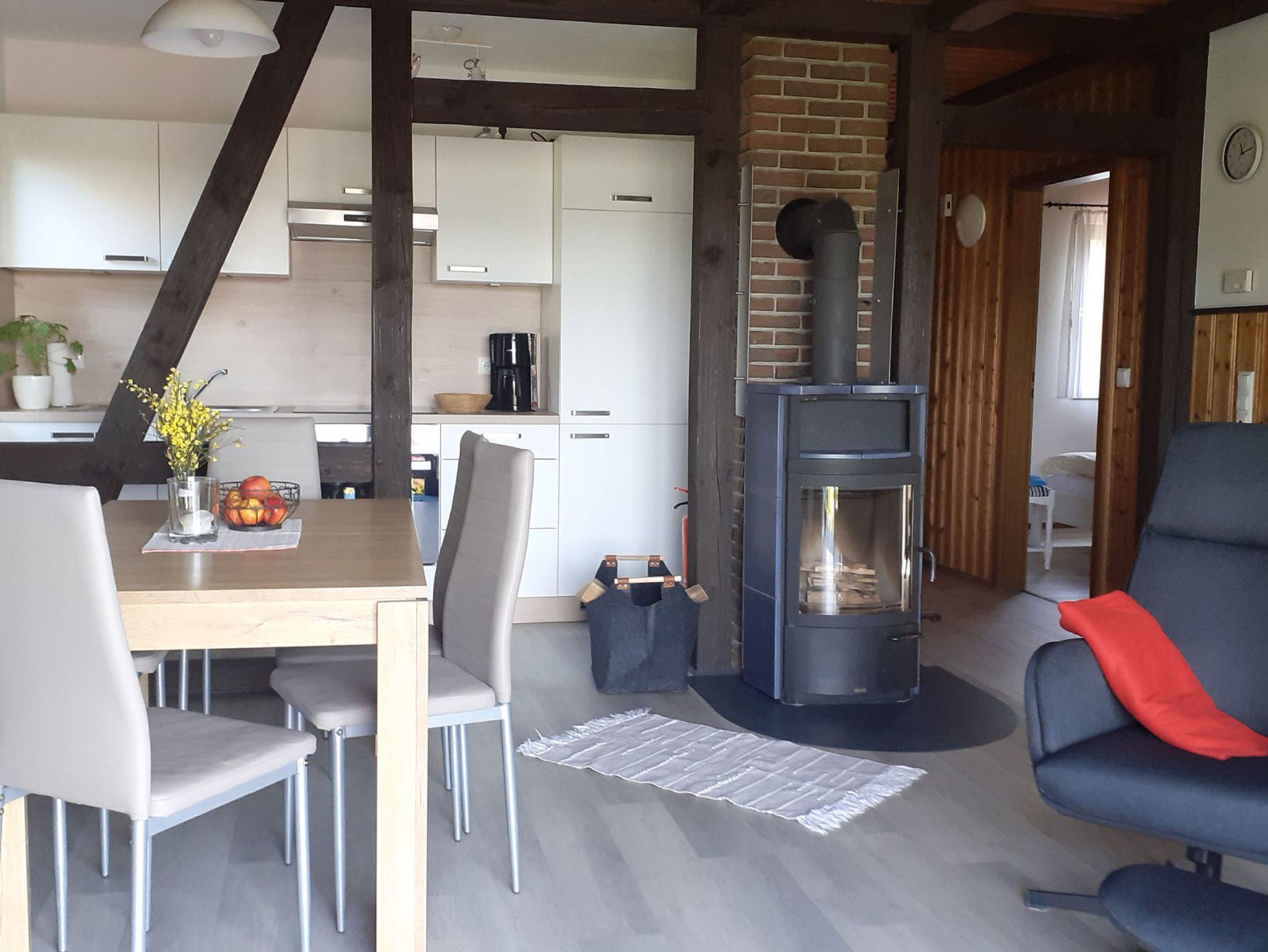 Die Ferienwohnung hat drei Schlafzimmer (2 Doppelbettzimmer, 1 Kinderzimmer mit Doppelstockbett). In dem großen Wohnraum mit Essecke und Schwedenofen kann man sich wohlfühlen. Die Küche ist für Ihren Aufenthalt gut ausgestattet. Im Badezimmer befindet sich eine Dusche und das WC
