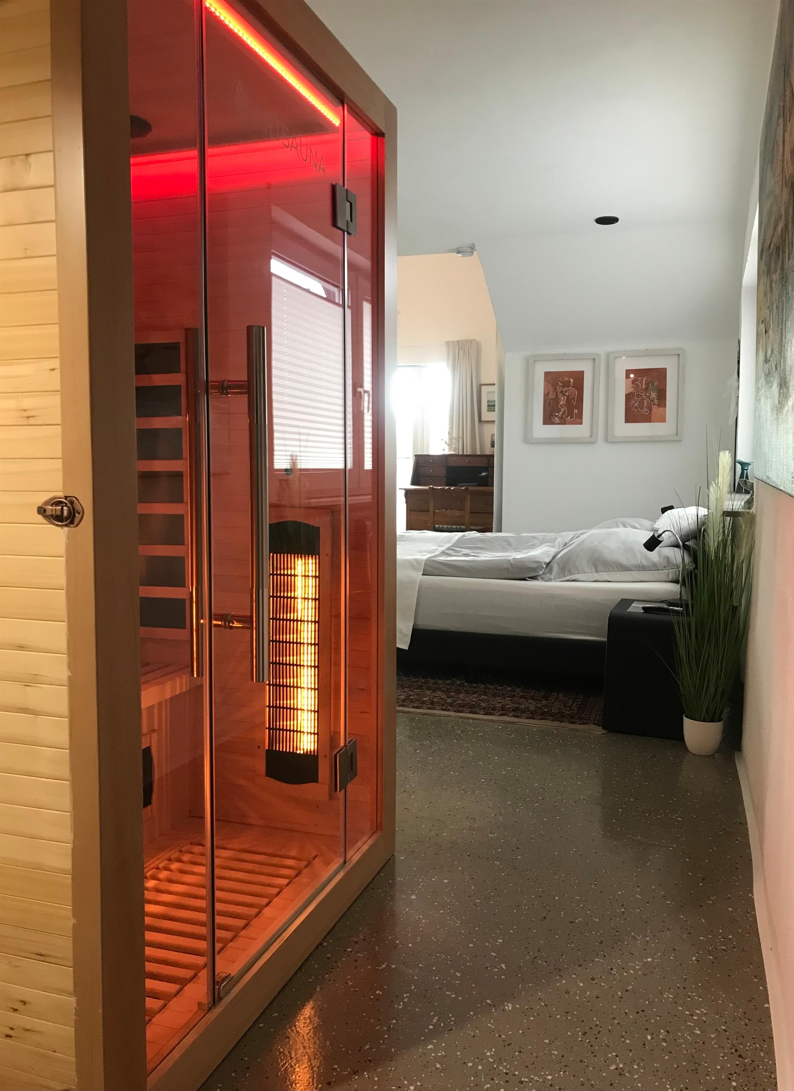 Pantryküche mit Theke und Barhockern, ein gemütlicher Essbereich, mit Blick in den Garten, Lese- und Yoganische sowie ein kompaktes Duschbad mit WC und Waschbecken befinden sich, wie auch der Massagesessel, auf Ebene 1. Im Durchgangsbereich auf Ebene 2 steht die Infrarotkabine für 2 zur Alleinnutzung zur Verfügung.