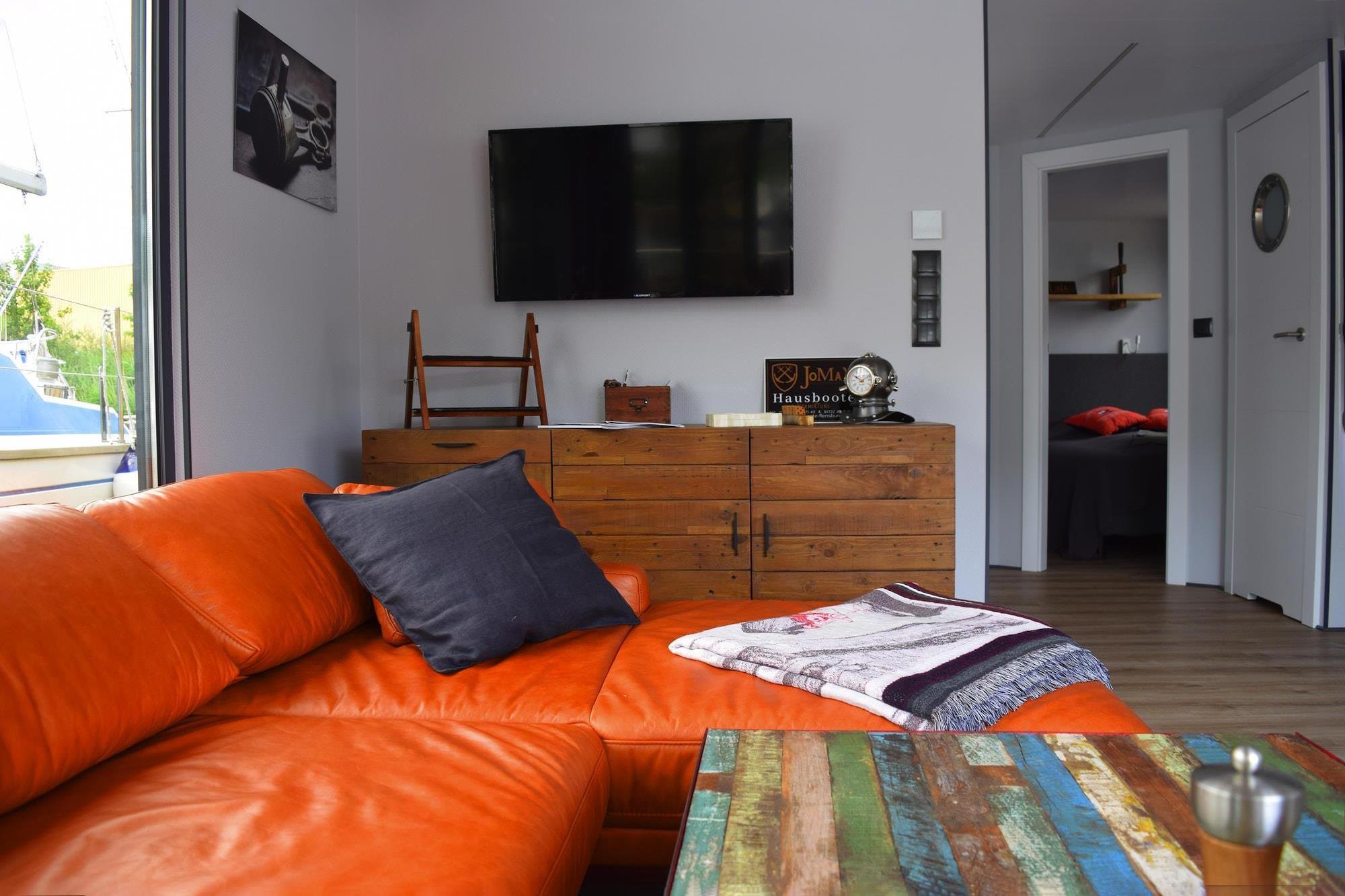 Et flydende feriehus med noget særligt: Denne moderne og smagfuldt indrettede husbåd ligger fortøjet i havnen i den historiske søfarts- og havneby Flensborg. Nyd panoramaudsigten over vandet og havnen, mens du nyder morgenmaden på terrassen. Tagterrassen er et fantastisk sted at slappe af i det strålende solskin. Selve husbåden imponerer med sit lyse interiør og sine generøse faciliteter. I nærheden finder du den livlige sejlhavn og en kult-currypølsebod kaldet Piratennest. Efter en slentretur gennem den smukke gamle bydel eller en havnerundfart på en passagerbåd kan du afslutte dagen komfortabelt på sofaen i din husbåd og nyde solnedgangen i horisonten. Nyd den fineste maritime havnestemning i rombyen Flensborg med en slentretur langs havnepromenaden eller gennem den gamle bydel, der er oversået med mange historiske bygninger og smukke kirker. I sommermånederne bringer Nordermarkt med sine gadecaféer og restauranter et middelhavspræg til fjordbyen. Du bør også altid have tid til en afslappende pause med udsigt over vandet og en lækker fiskesandwich efter en omfattende shoppingtur på Slesvig-Holstens længste shoppinggade. Højdepunkter inkluderet: Strøm Wi-Fi Aktiviteter i nærheden: En afstikker til Holnis-halvøen, cirka 15 kilometer væk, er bestemt umagen værd. Den strækker sig nordpå fra Glücksburg ud i Flensborg Fjord og repræsenterer den nordligste spids af den tyske Østersøkyst. Her finder du et naturreservat på cirka 400 hektar, som du kan udforske på velmarkerede vandrestier med enestående udsigt over Flensborg Fjord og ind i Danmark. Et sandt paradis for fuglekiggere, naturelskere og planteelskere. Også på halvøen, ud mod den ydre fjord, ligger den smukke, fine sandstrand Holnis "Drei" med sin cirka tre kilometer lange, naturlige promenade. Denne bade- og spastrand betragtes som den smukkeste strand ved Flensborg Fjord. Nyd den vidunderlige panoramaudsigt over Flensborg Fjord og Østersøen, helt til vores danske naboer. Øl-elskere bør ikke gå glip af et besøg på Flensborg Bryggeri, og en dagstur til LEGOLAND i Billund vil helt sikkert glæde de yngre gæster. Vigtig bemærkning: Linnedpakker er ikke inkluderet i lejeprisen. Disse kan bookes på forhånd som en mulighed, hvis det er nødvendigt!