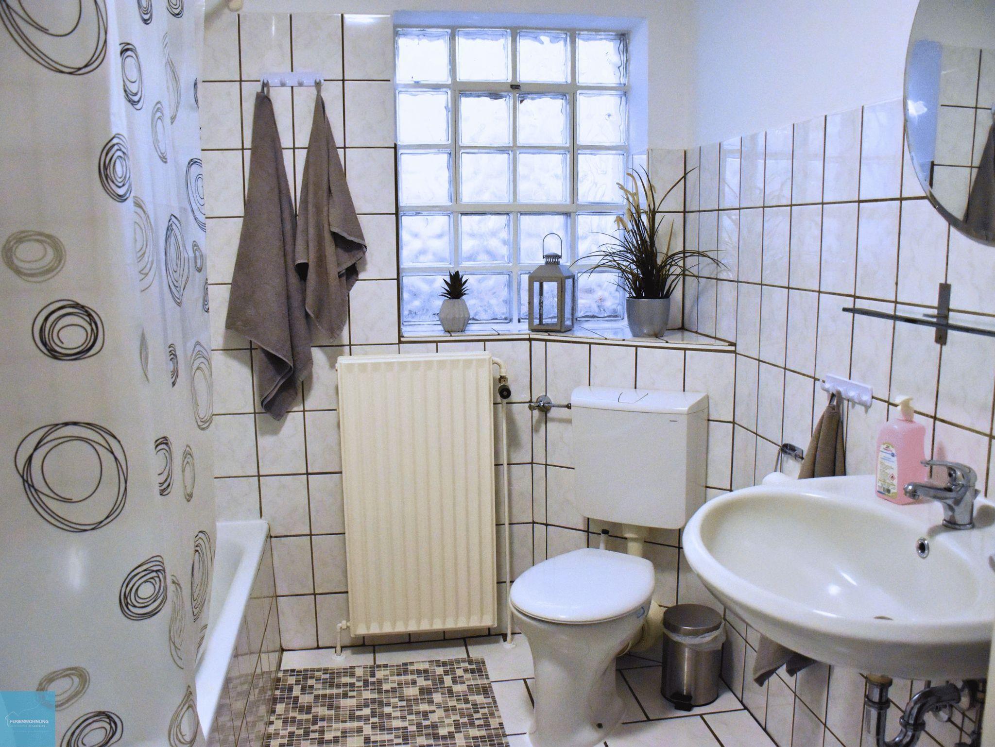 • 1 Badezimmer mit Badewanne, Dusche, WC und Waschmaschine