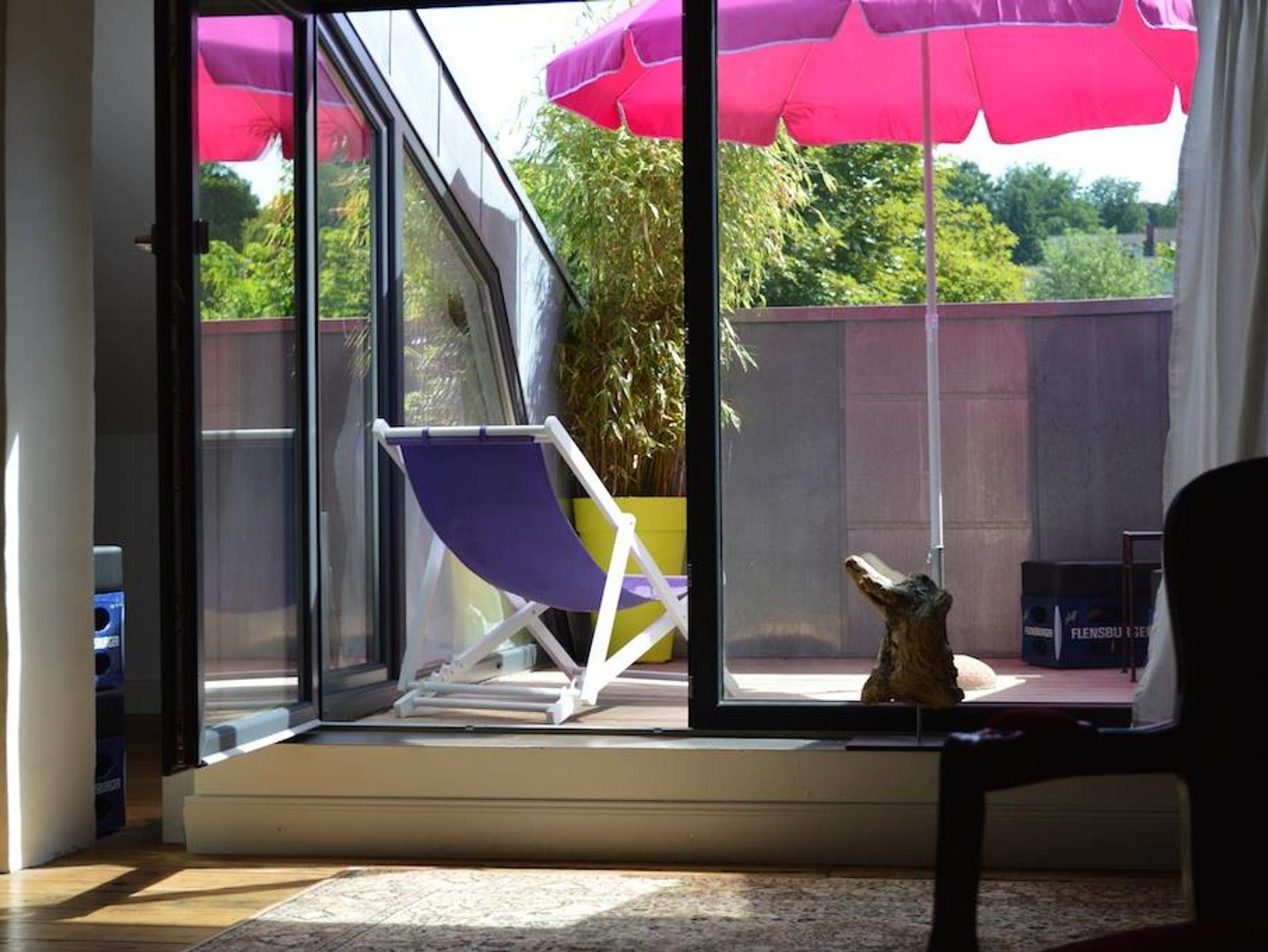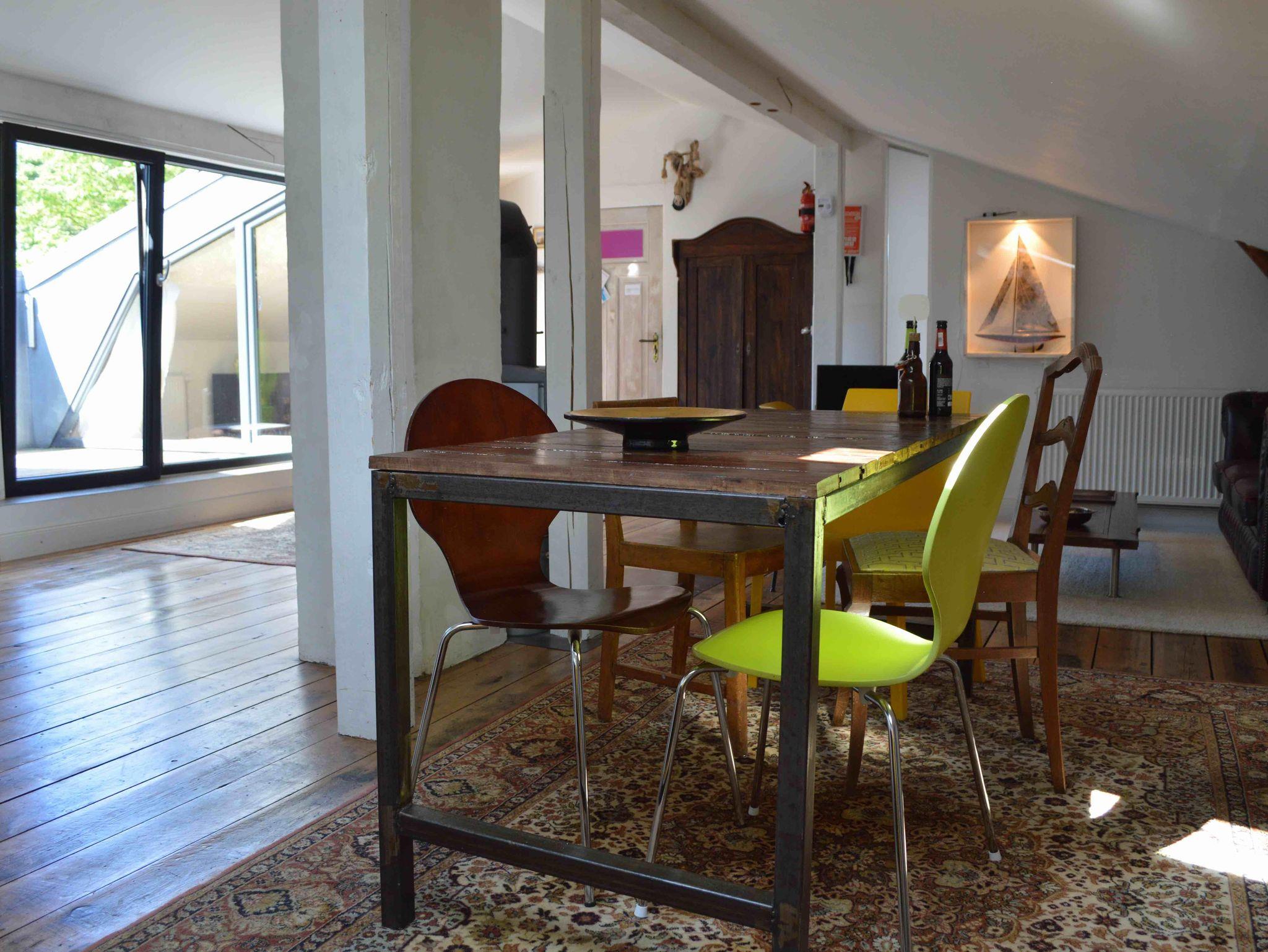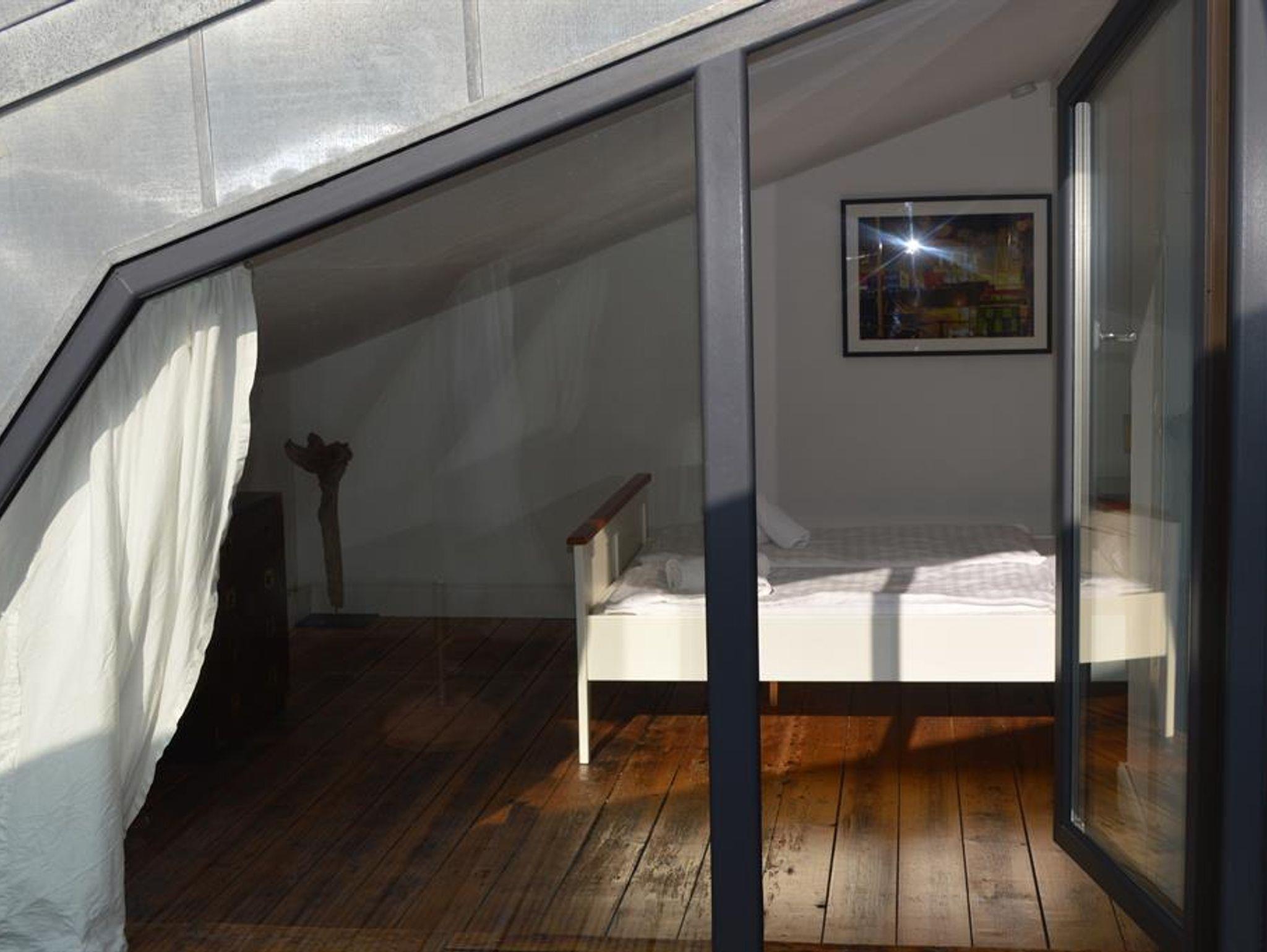 Unsere Wohnung im Dachgeschoss bietet Platz für 4+ Personen. Zur Wohnung gehört eine großzügige Dachterrasse. Ein großzügiger Wohn- und Essbereich mit angrenzender offener Küche bildet das Herz der Wohnung. Auf der Richtung Süden gelegenen Dachterrasse können Sie den Blick über die Dächer genießen. Die Wohnung hat ein Schlafzimmer mit Doppelbett, sowie ein Schlafzimmer mit zwei Einzelbetten. Ein Alkovenbett bietet bei Bedarf zwei weitere Schlafplätze. Das modern ausgestattete Badezimmer verfügt über Dusche und Badewanne. Ein Kaminofen sorgt für Gemütlichkeit.