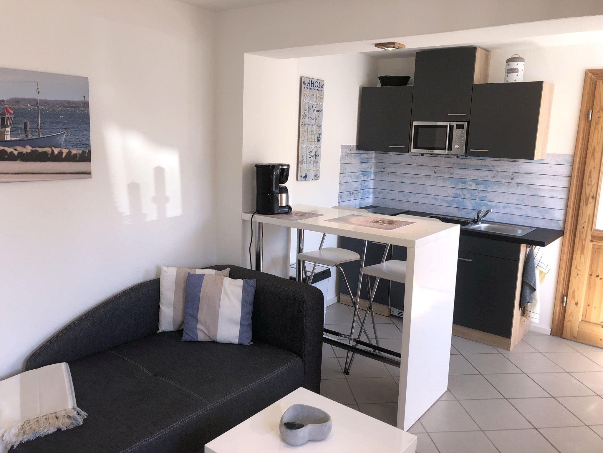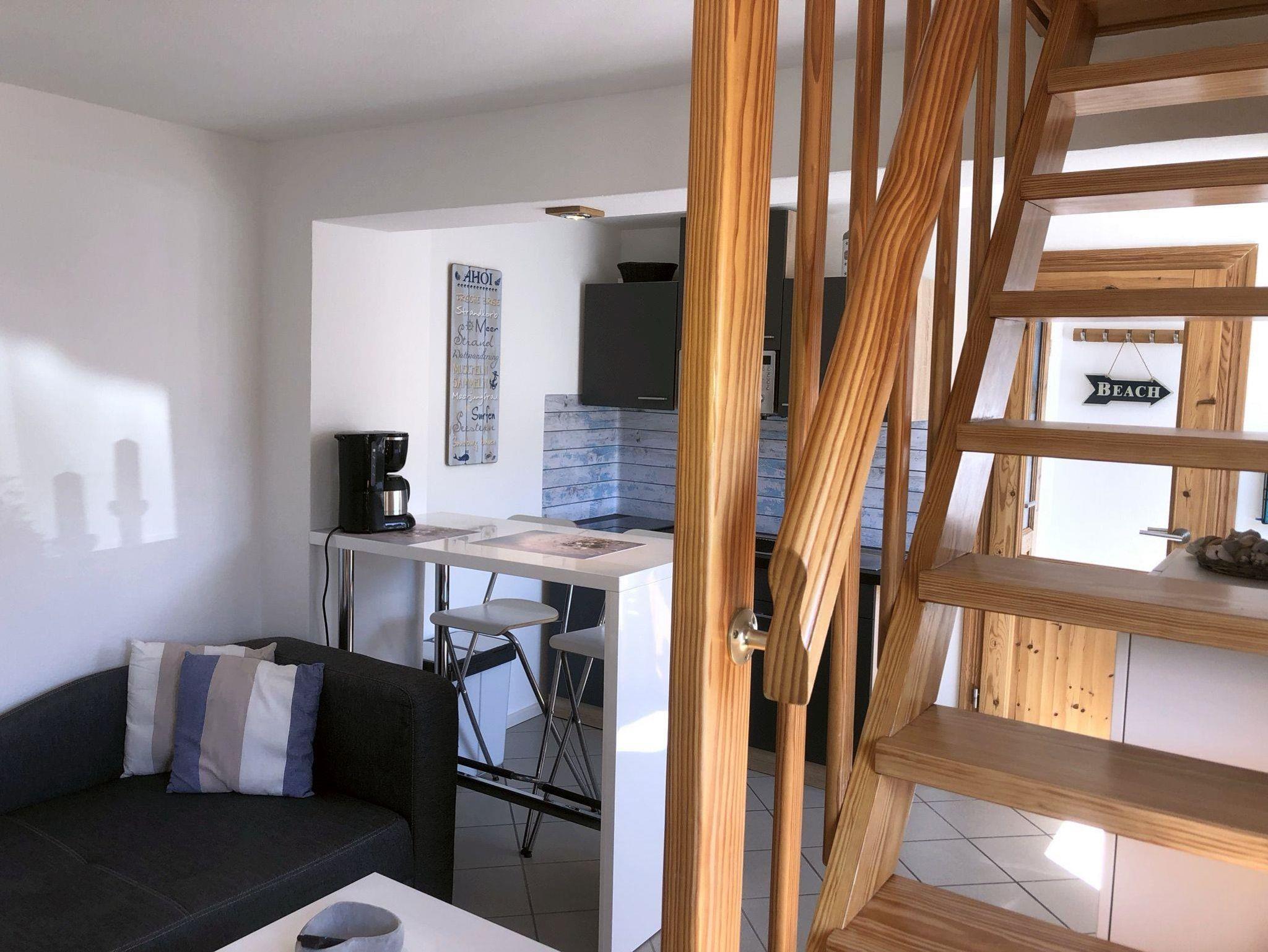 Gönnen Sie sich Ihre Kleine Auszeit in der passenden Ferienwohnung! Die offene Gestaltung der Wohnung und die Schlafmöglichkeiten auf der Galerie machen diese Wohnung zu einem besonderen Ort. Die Küchenzeile ist mit allem ausgestattet, was man braucht und von der Frühstücksbar oder dem bequemen Sofa aus können Sie fern sehen oder Ihren Tag Revue passieren lassen. Die Treppe führt zur Galerie mit den 2 Einzelbetten. Die Dachschrägen und das Dachfenster lassen diesen Raum gemütlich wirken. Ein Duschbad gehört ebenso zum Standard. Nutzen Sie doch bei schönem Wetter die Gemeinschaftsterrasse! Kostenloses W-Lan und ein PKW-Stellplatz runden das Angebot ab.