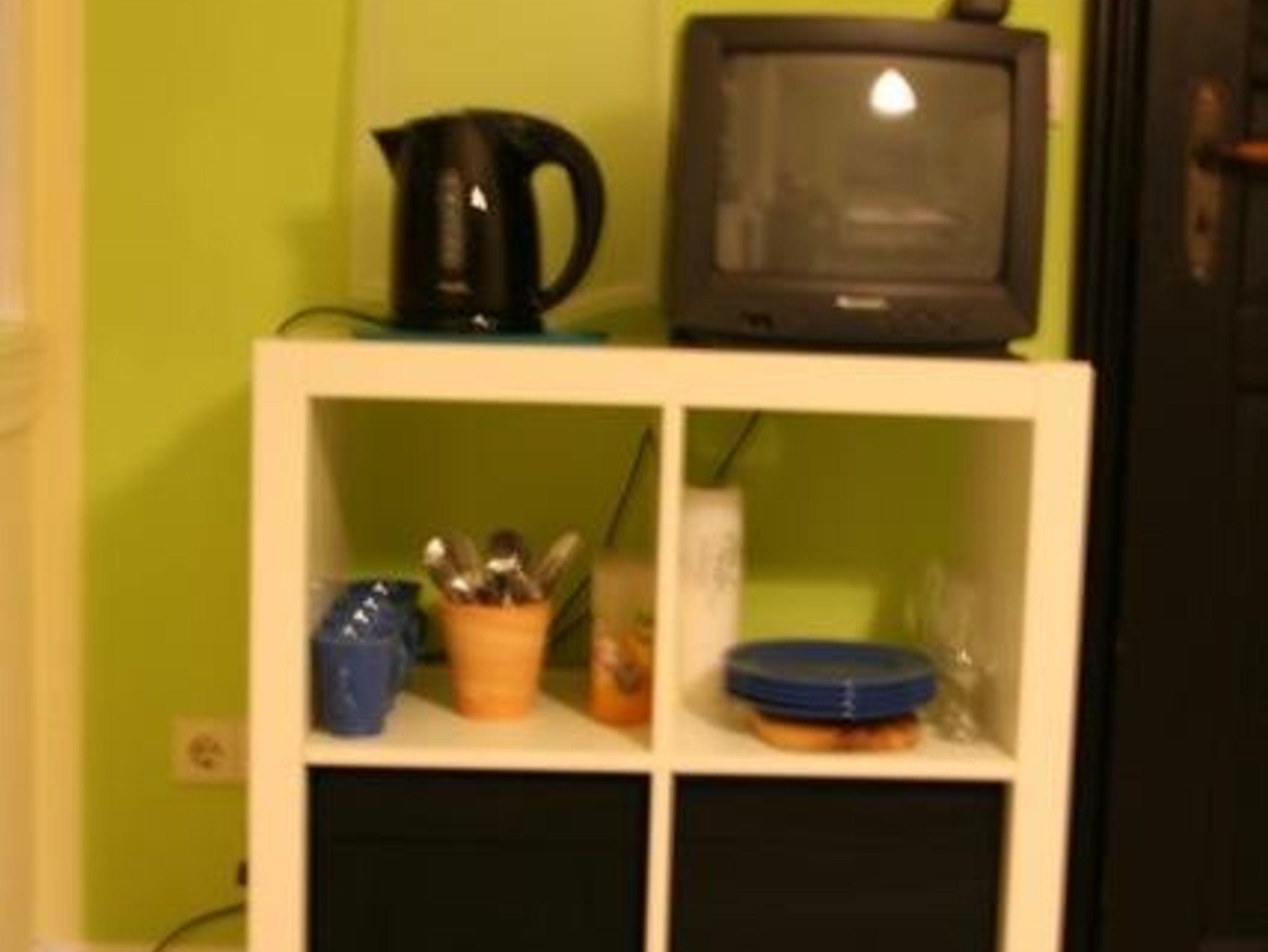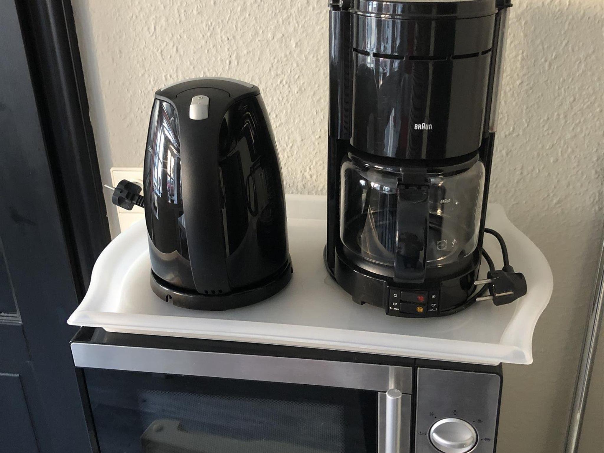 Die Ausstattung mit Kühlschrank, Wasserkocher, Kaffeekocher und Mikrowelle ist geeignet, um sich zu versorgen. Sogar einen Eierkocher gibt es.