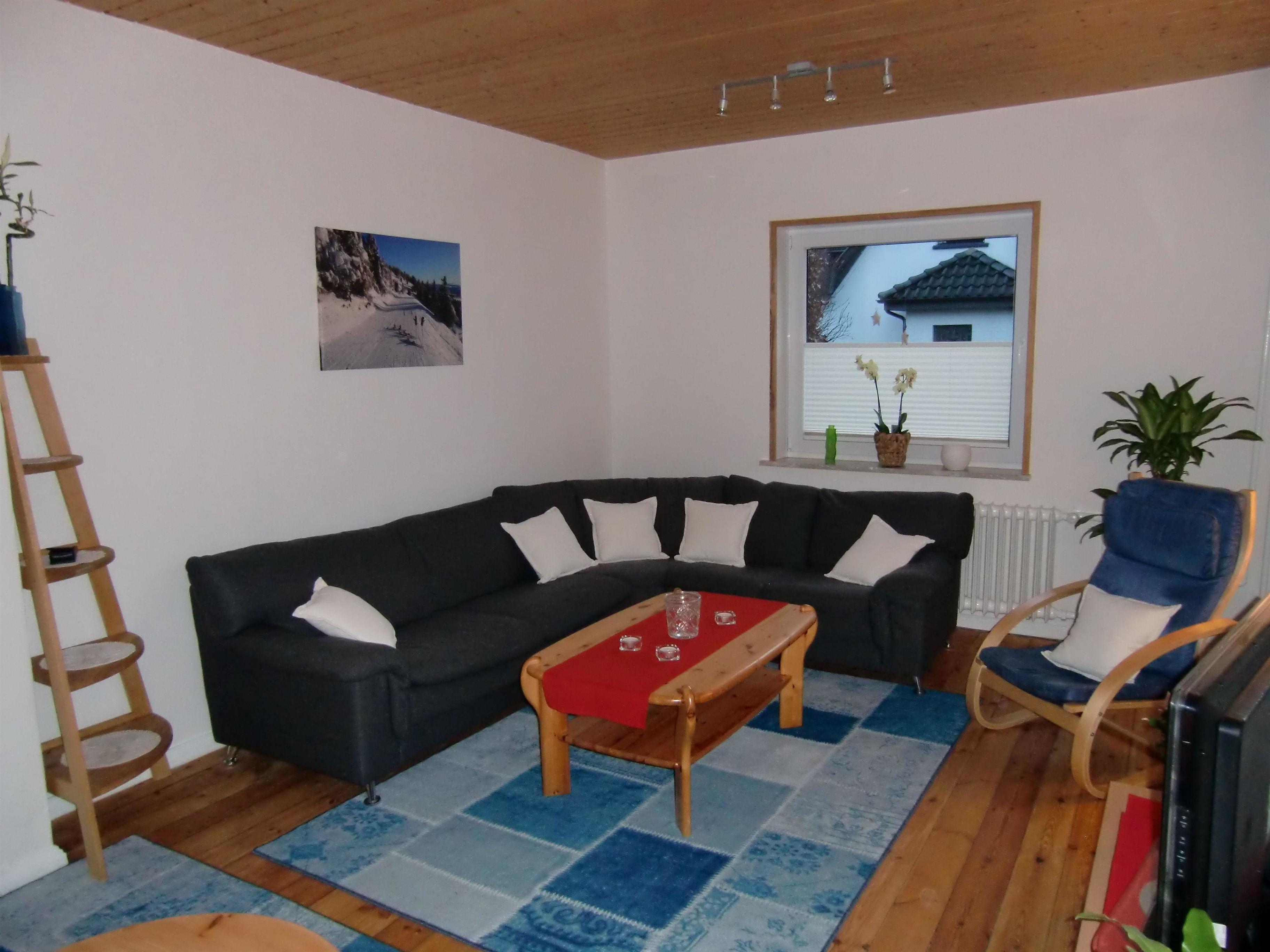 Im großem Wohnzimmer steht eine gemütliche Ecksitzgruppe mit einem Flachbildschirm, Kabel - TV und DVD - Player. WLAN vorhanden.