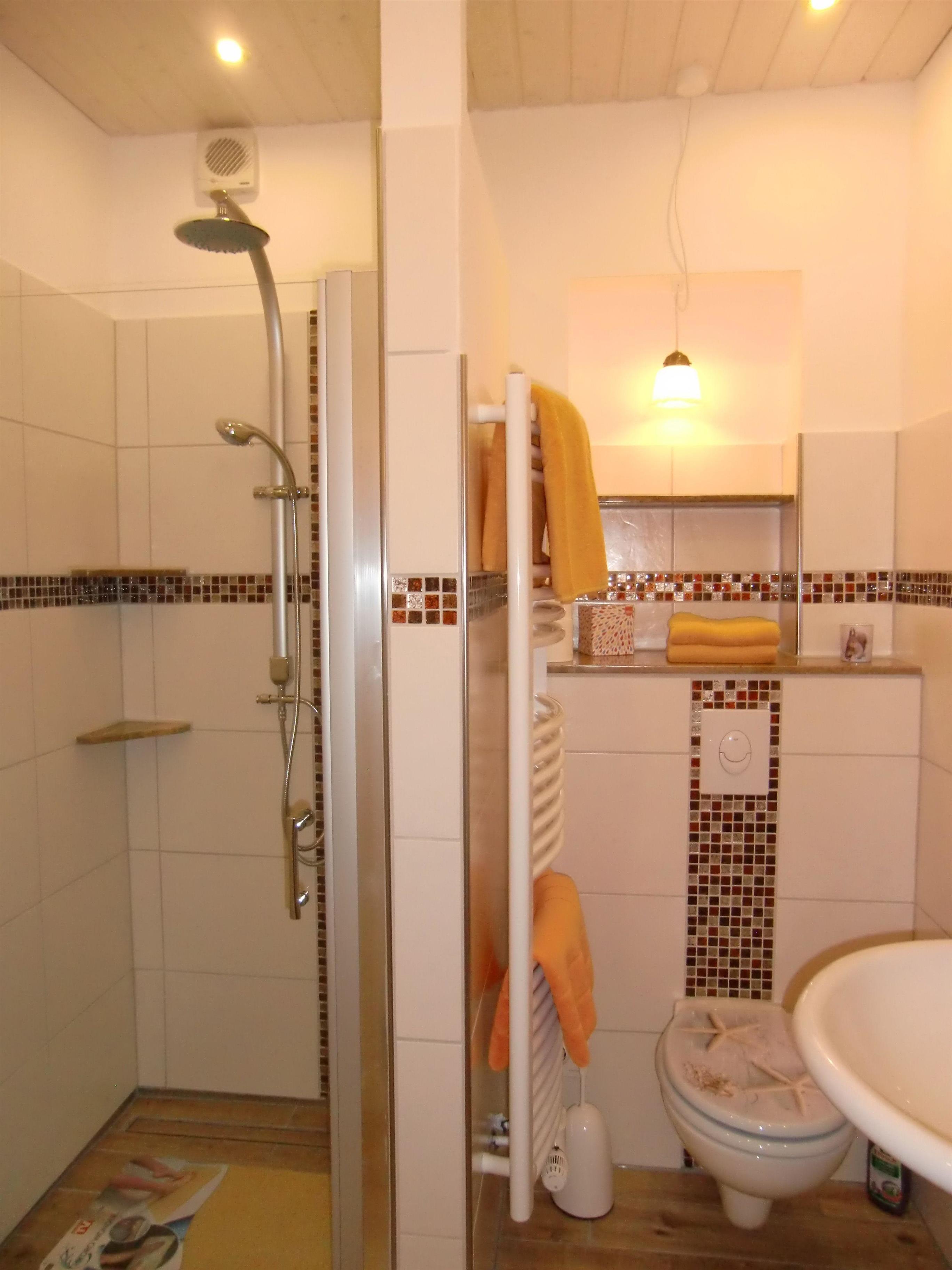 Das Duschbad besteht auch aus einer Massagebrause, einem Waschbecken, Fön, WC, Handtuchheizkörper und einer Fußbodenheizung. Im Gäste - WC befindet sich ein kleines Handwaschbecken. Der Eingangsbereich zeichnet sich durch einen langen Flur aus, von dem man das Kinderzimmer, das Wohnzimmer, das Gäste - WC, das Duschbad und die Küche erreichen kann.