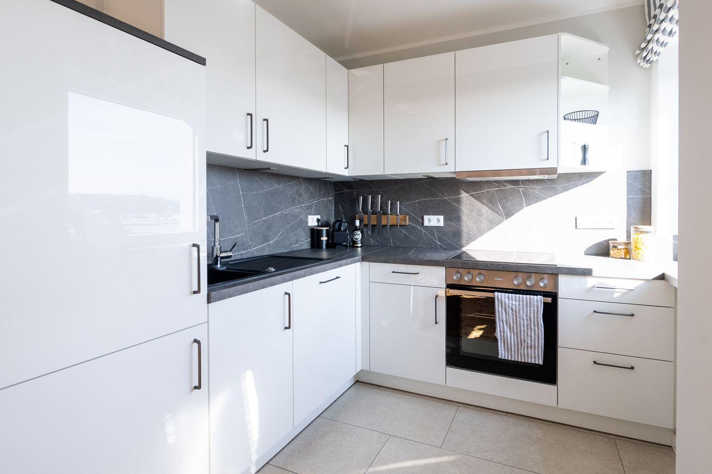 Die modern ausgestattete Küche lädt Dich zum Kochen ein und bietet Dir dabei einen wunderschönen Ausblick auf den Flensburger Hafen, der das Kocherlebnis zu etwas Besonderem macht.