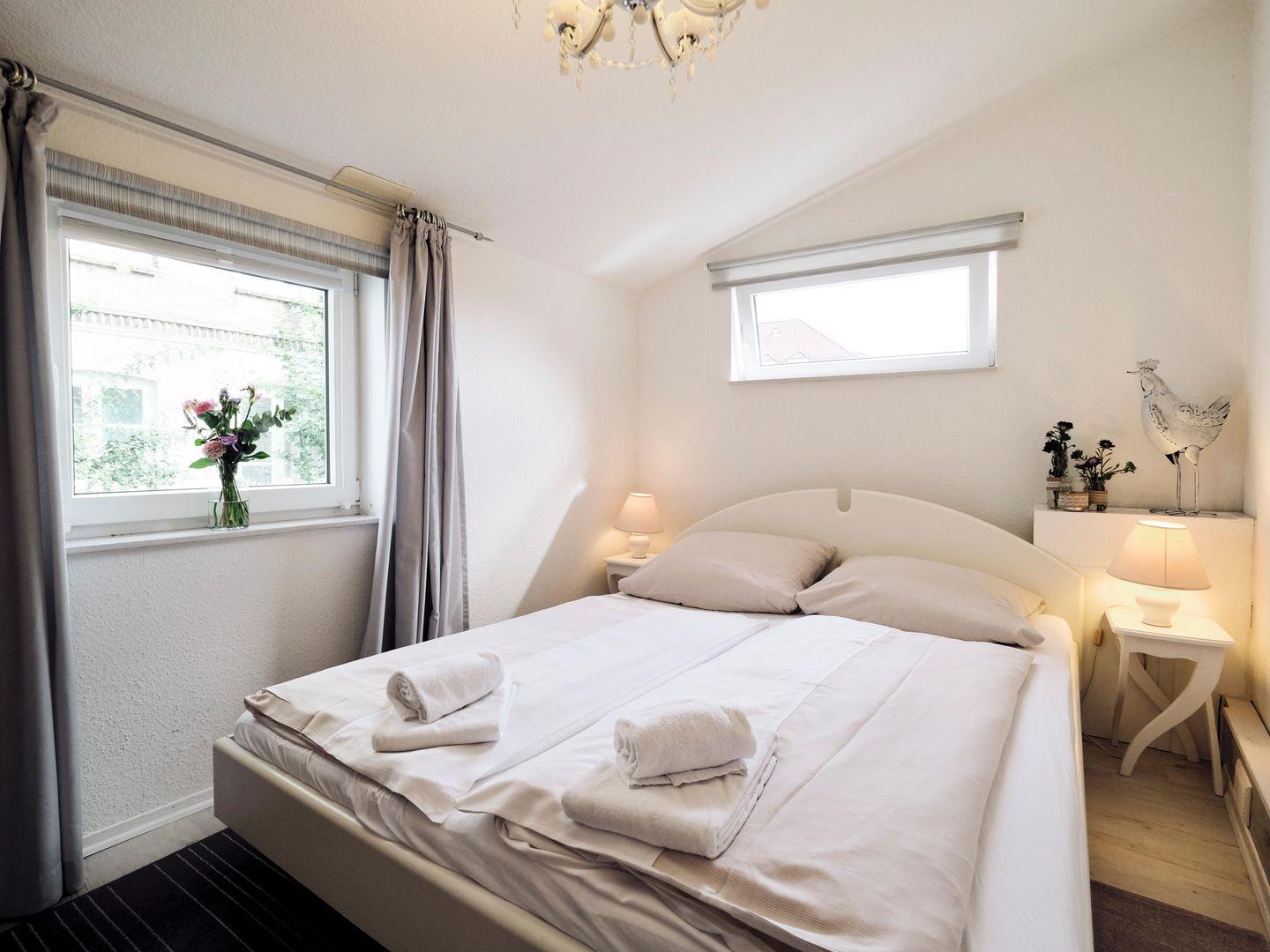 Das separate Schlafzimmer ist mit einem großzügigen Doppelbett (1,60 x 2,00 m) ausgestattet. Hier kannst du nach einem aufregenden Tag in der Stadt wunderbar entspannen und neue Energie tanken.