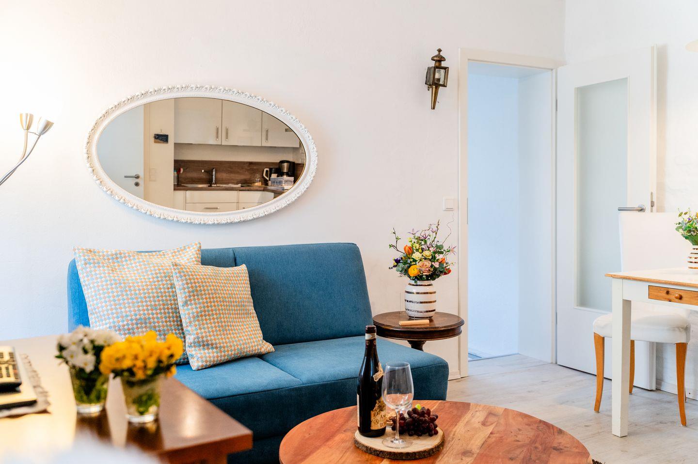Zu den weiteren Annehmlichkeiten der Ferienwohnung gehören kostenloses WLAN und ein abschließbarer Fahrradabstellplatz, der besonders für E-Bike-Nutzer von Vorteil ist. Öffentliche Parkplätze sind bequem hinter dem Haus, am Hafen oder im nahgelegenen Parkhaus zu finden.