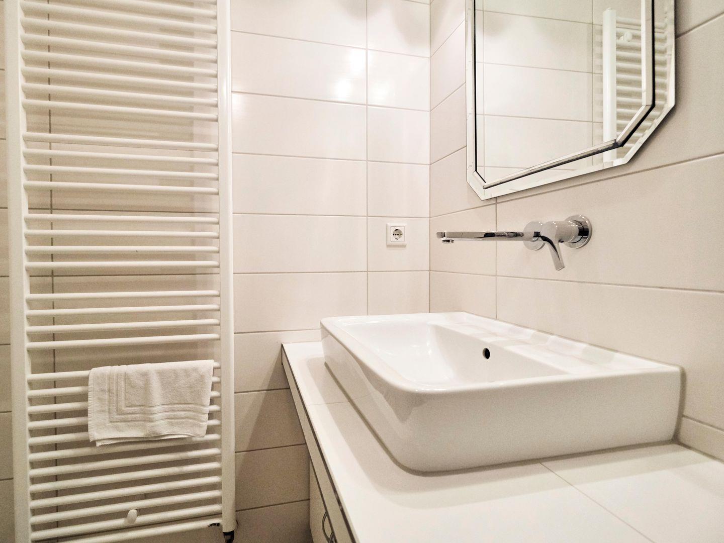 Das Badezimmer ist ein weiteres Highlight der Wohnung. Es wurde ebenfalls vollständig erneuert und verfügt über eine ebenerdige Dusche, ein WC sowie einen beheizten Handtuchhalter, der für zusätzlichen Komfort sorgt.
