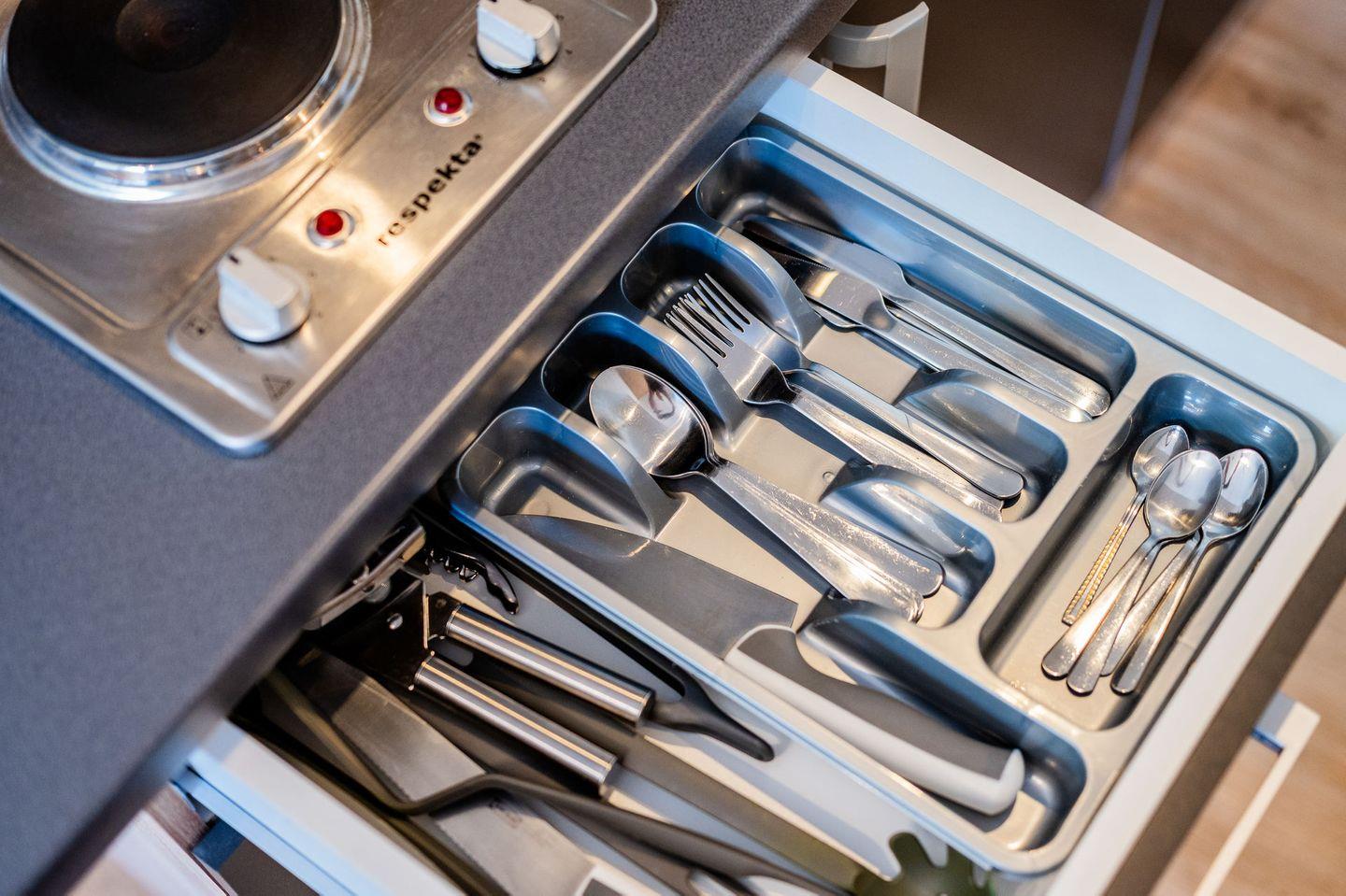 In den jeweiligen Studios ist ein Doppelbett 160x 200 m, eine Kochnische, ein Tresen mit Sitzgelegenheit, ein Flachbild-TV und ein separates Badezimmer mit Dusche.