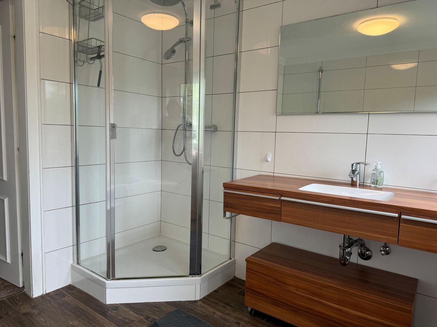 In der Wohnung befindet sich ein großes Tageslicht-Badezimmer mit Dusche und Badewanne und ein separates kleines Gäste-WC, mit Waschbecken und Toilette.