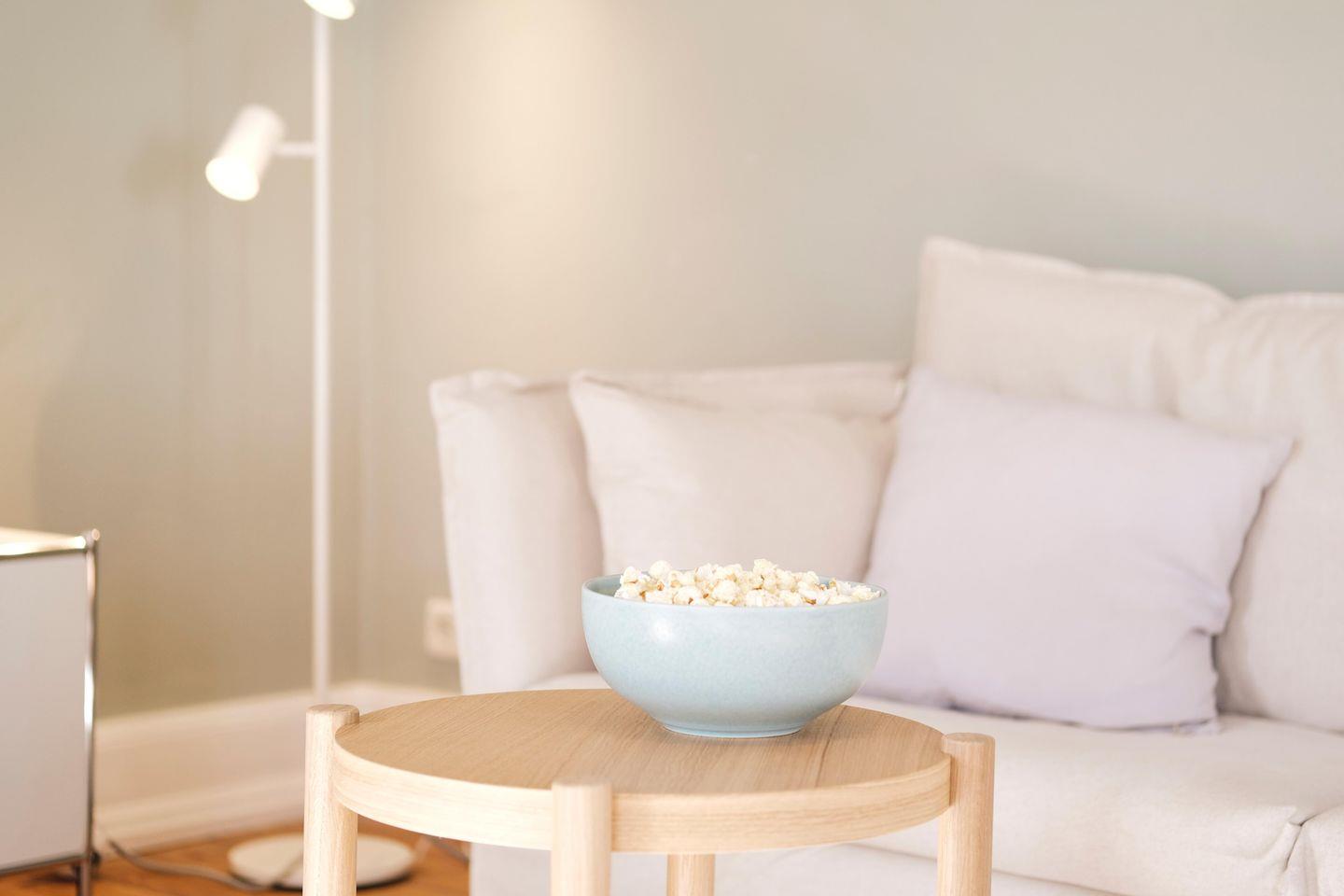Das große Wohnzimmer hat einen kleinen, romantischen Wintergarten als Vorbau. Im Wohnzimmer gibt es eine große Eckcouch und Smart-TV. Dazu noch einen großen Esstisch mit viel Platz für gemeinsames Essen und Spieleabende.