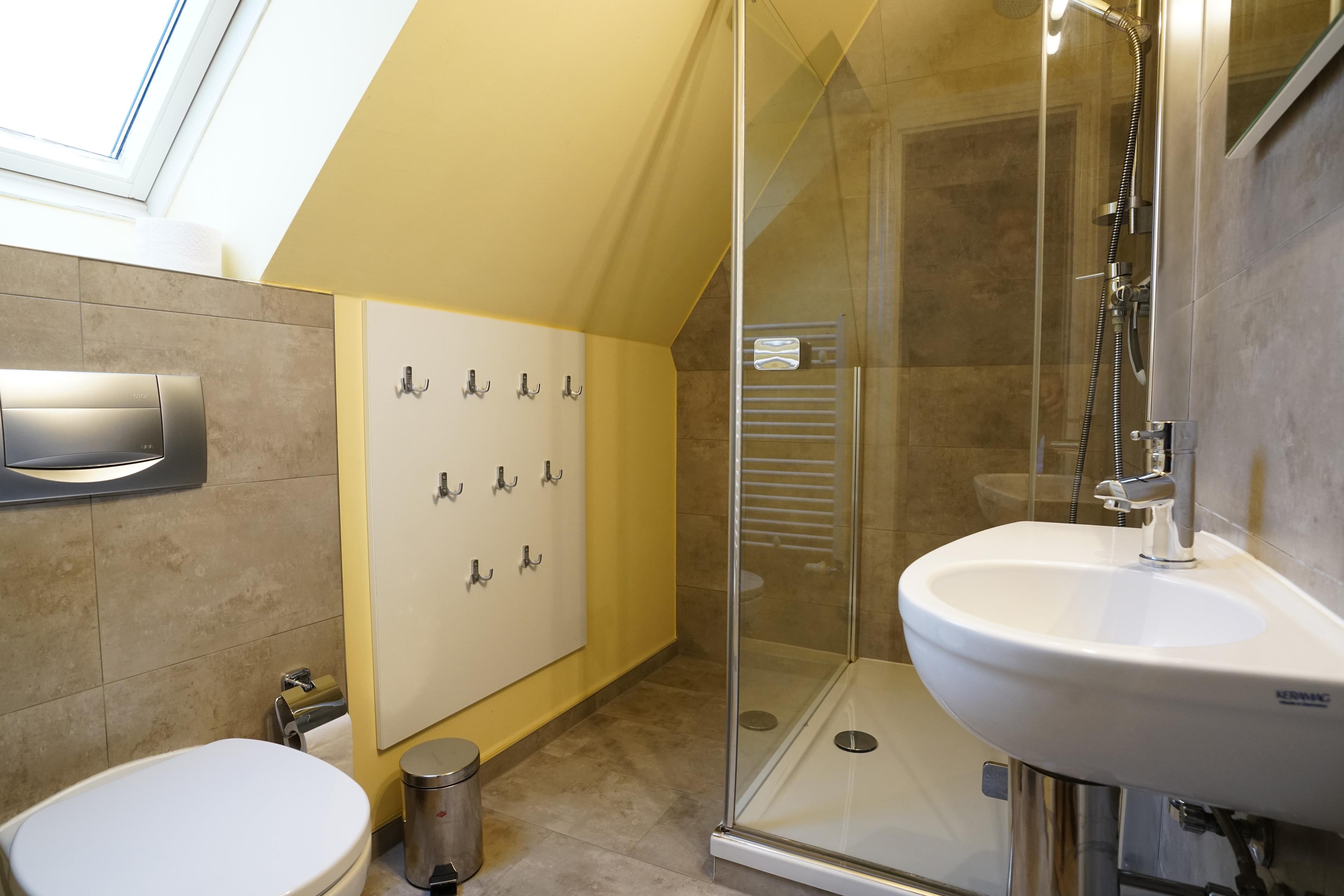 Zu den Annehmlichkeiten gehören zwei moderne Duschbäder im Obergeschoss und im Dachgeschoss sowie ein Gäste-WC im Flur. Ein eigenes Gartengrundstück mit gemauertem Kamin lädt zum Entspannen im Freien ein und vervollständigt das Urlaubserlebnis in der Seeufervilla.