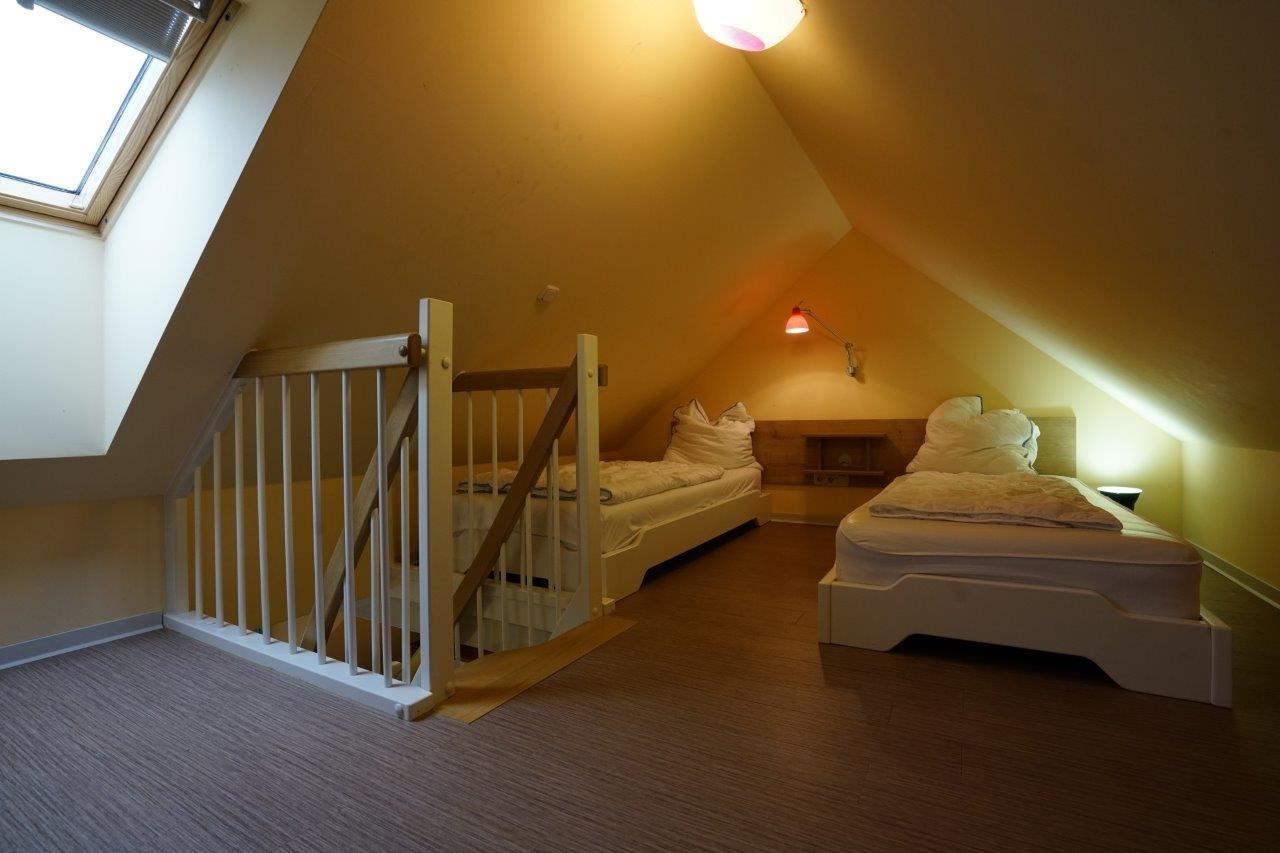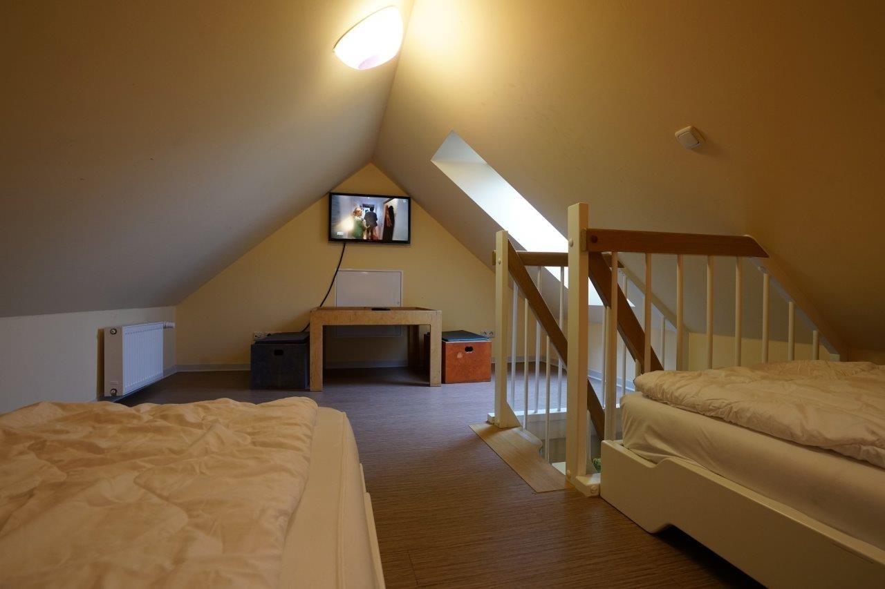 Es ist wichtig zu wissen, dass das Schlafzimmer im Spitzdach für ältere Kinder ab 5 Jahren geeignet ist und über eine Raumspartreppe erreichbar ist. Die gemütlichen Dachschrägen verleihen dem Raum eine besondere Atmosphäre. Ein Fernseher und ein Dachflächenfenster sorgen für Komfort und Belüftung.