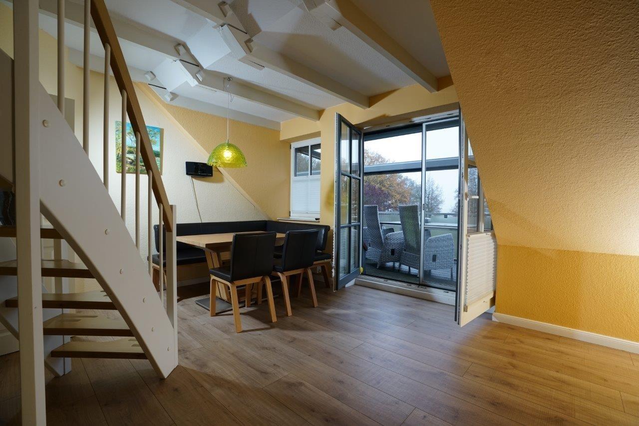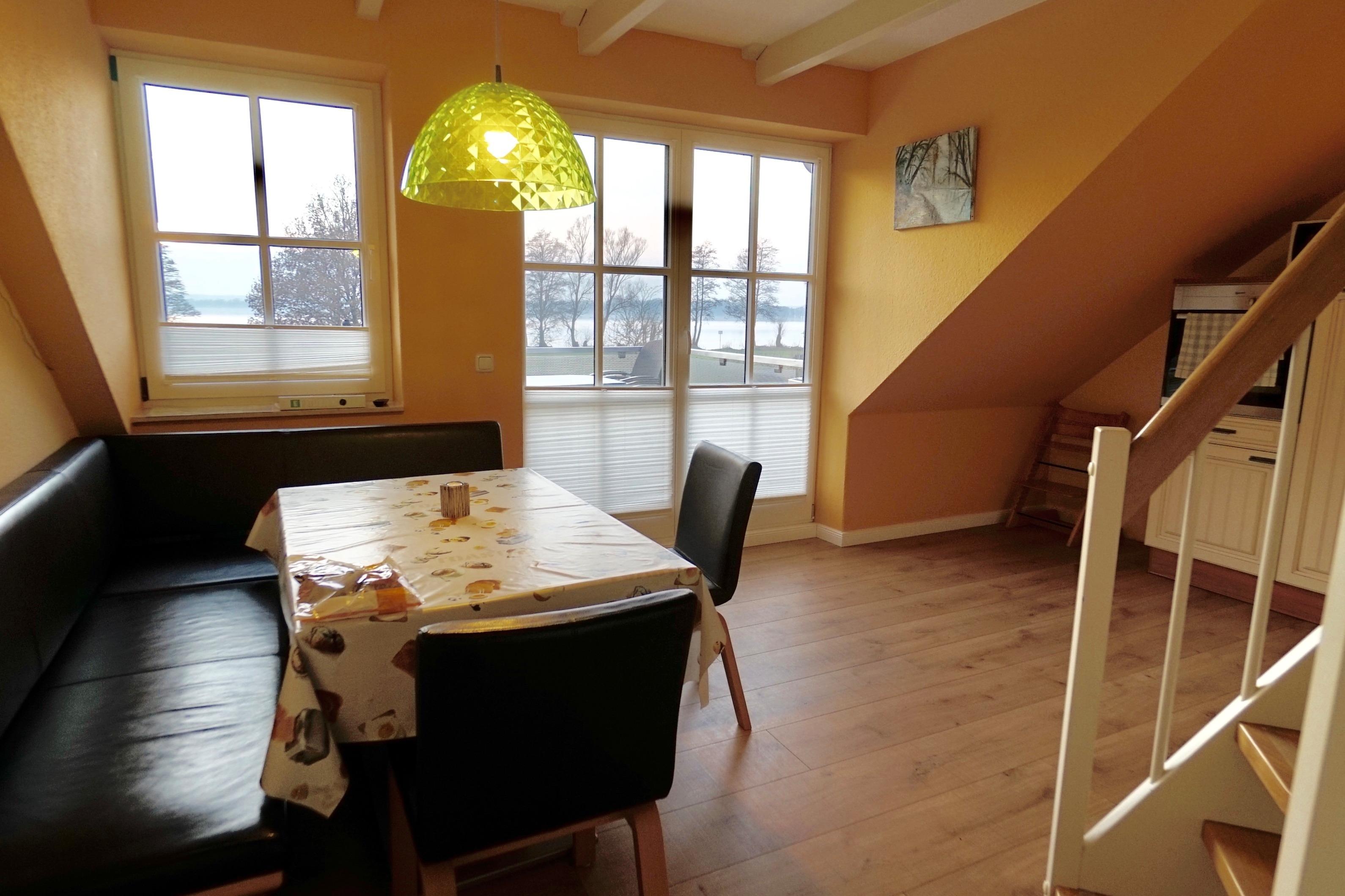 Seeblick, große 20 m² Terrasse mit Markise ; Kugelkgrill"Bastard" , modernes Schlafzimmer mit Doppelbett, Wohn/Schlafzimmer mit super Schlafcouch und im Spitzdach 2 Einzelbetten über Raumsparterppe erreichbar. Ein Traum für Teenager, weil mit Fernseher . Separate große Küche mit schöner Sitzecke - auch zum Spielen , Schönes modernes Duschbad. - Garten nutzbar , wenn gewünscht, Strand in 100 m