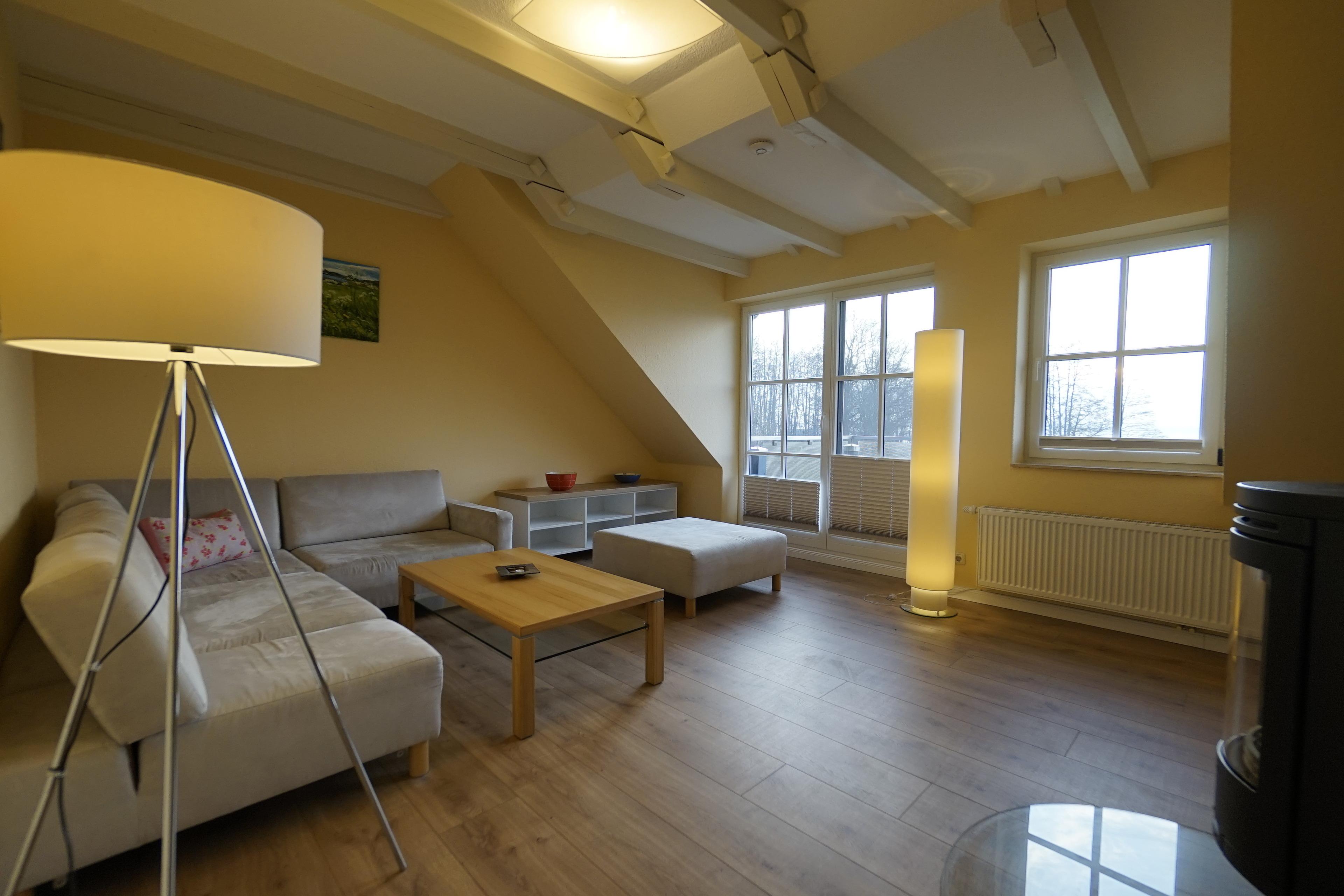 Die hochwertige Küche ist separat vom Wohnraum und verfügt über einen schönen Esstisch, der auch zum Spielen genutzt werden kann. Ein Fernseher und ein CD-Radio sorgen für Unterhaltung. Im hellen und modernen Wohnzimmer lädt ein Kamin zum Verweilen ein, während eine große Couch viel Platz bietet. Im Schlafzimmer erwartet Sie ein komfortables Boxspringbett, und das moderne Duschbad rundet das Angebot ab. Im Wohnzimmer hat eine Couch eine Schlaffunktion - Sie können also Schnarcher umquartieren...