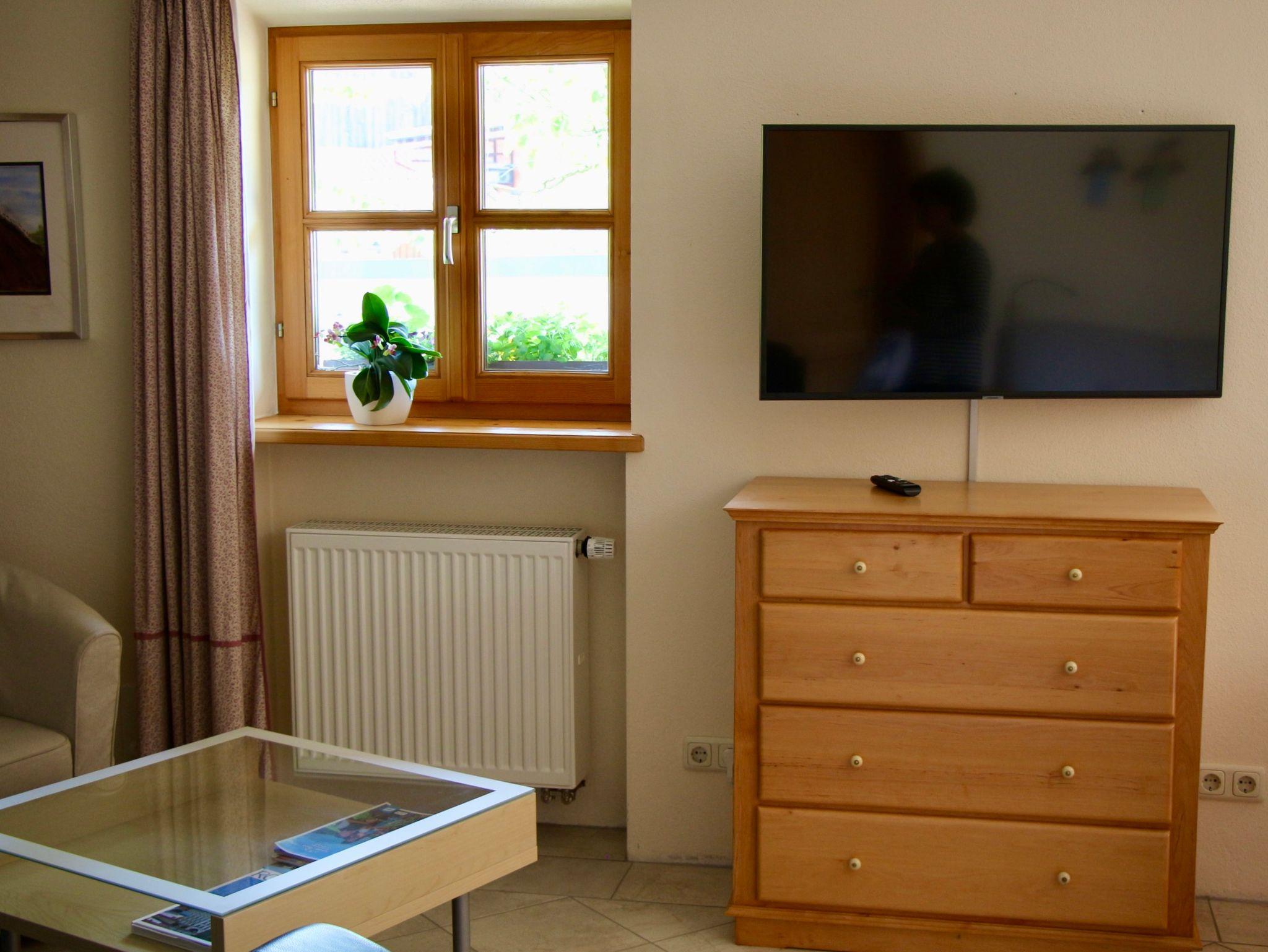 Modern ausgestattetes, ebenerdiges Appartement mit Fußbodenheizung, extra Badezimmer mit WC, Badewanne, sowie extra kleinem Abstellraum. Im Wohnzimmer großer Flachbild TV mit SAT. Die Küche ist voll ausgestattet mit Herd, Backofen, Ceranfeld, Geschirrspüler etc. und reichlich Geschirr und Gläser. Fahrräder können eingestellt werden. Das W-LAN, sowie der Parkplatz vor dem Haus sind kostenlos. Die Bettwäsche und Handtücher sind im Tagespreis enthalten.