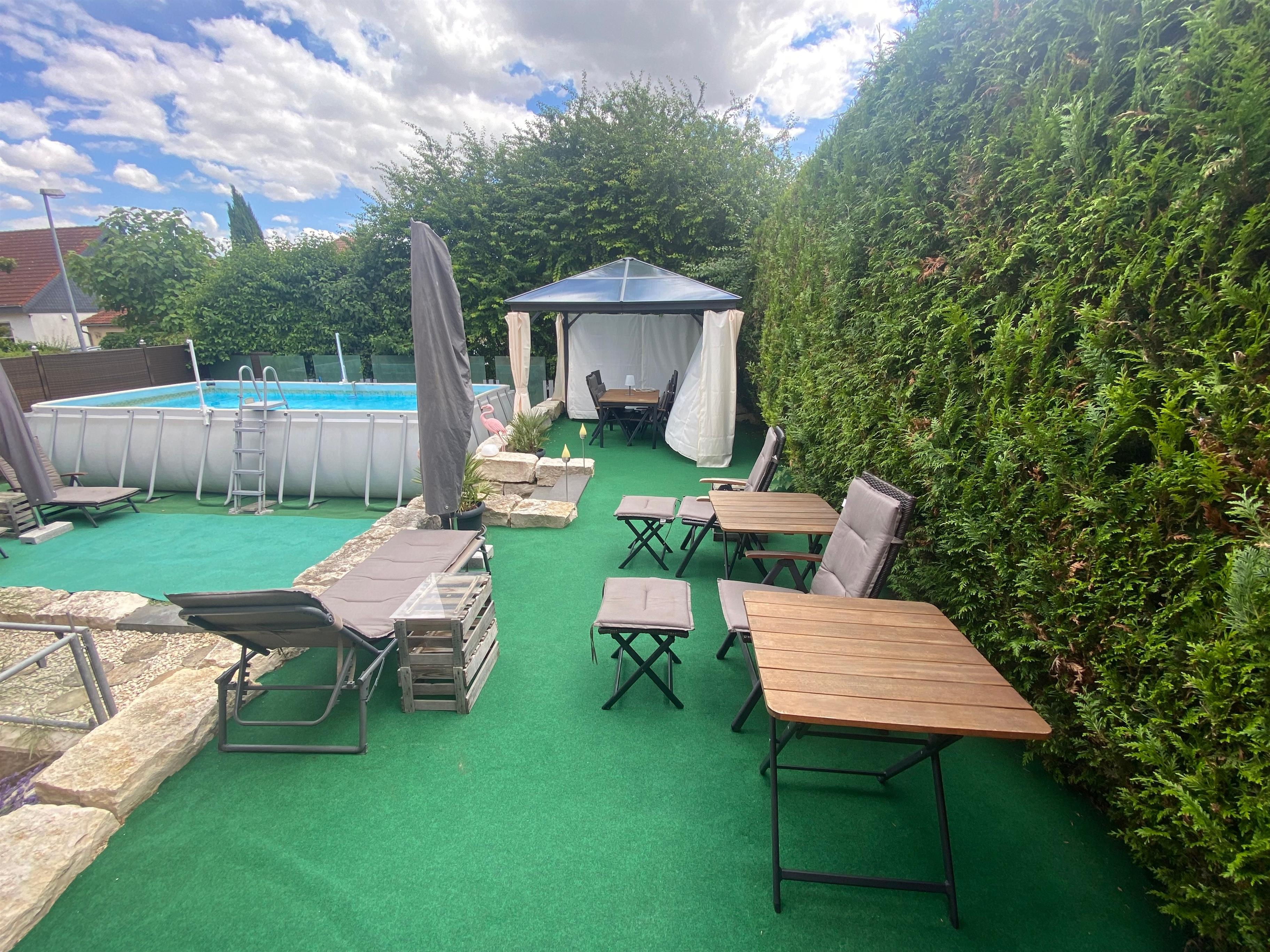 Die im Souterrain unseres Hauses befindliche 70 m² Wohnung hat einen separaten Eingang und besteht aus einem großen Wohn-/Schlafbereich mit Himmelbett 180x200 und Sofa (Schlafsofa 190x190 bei Buchung 5-6 Personen), Bad mit Dusche + WC, einer vollständig eingerichteten Küche und einem separaten Schlafzimmer mit Bett 180x200 (Bei Buchung 3-4 Personen). WLAN und Parken am Haus (eigener Stellplatz auf dem Grundstück) sind kostenfrei. Garten-/Poolsaison 08.06.-12.09.26 erst ab 3 Nächten incl. (Bitte um Voranmeldung). Bei längerem Aufenthalt auf Anfrage evtl. früher/länger möglich.