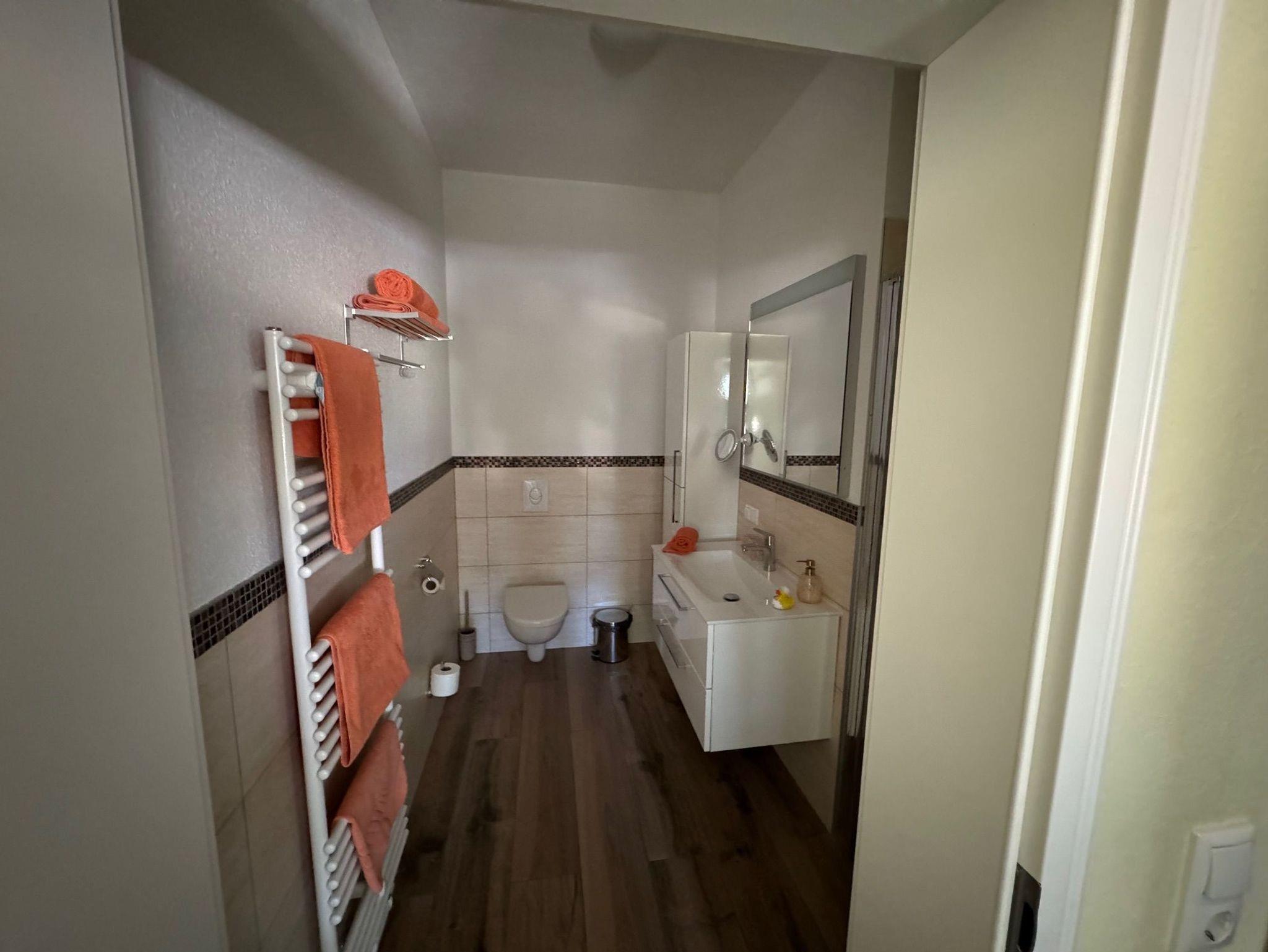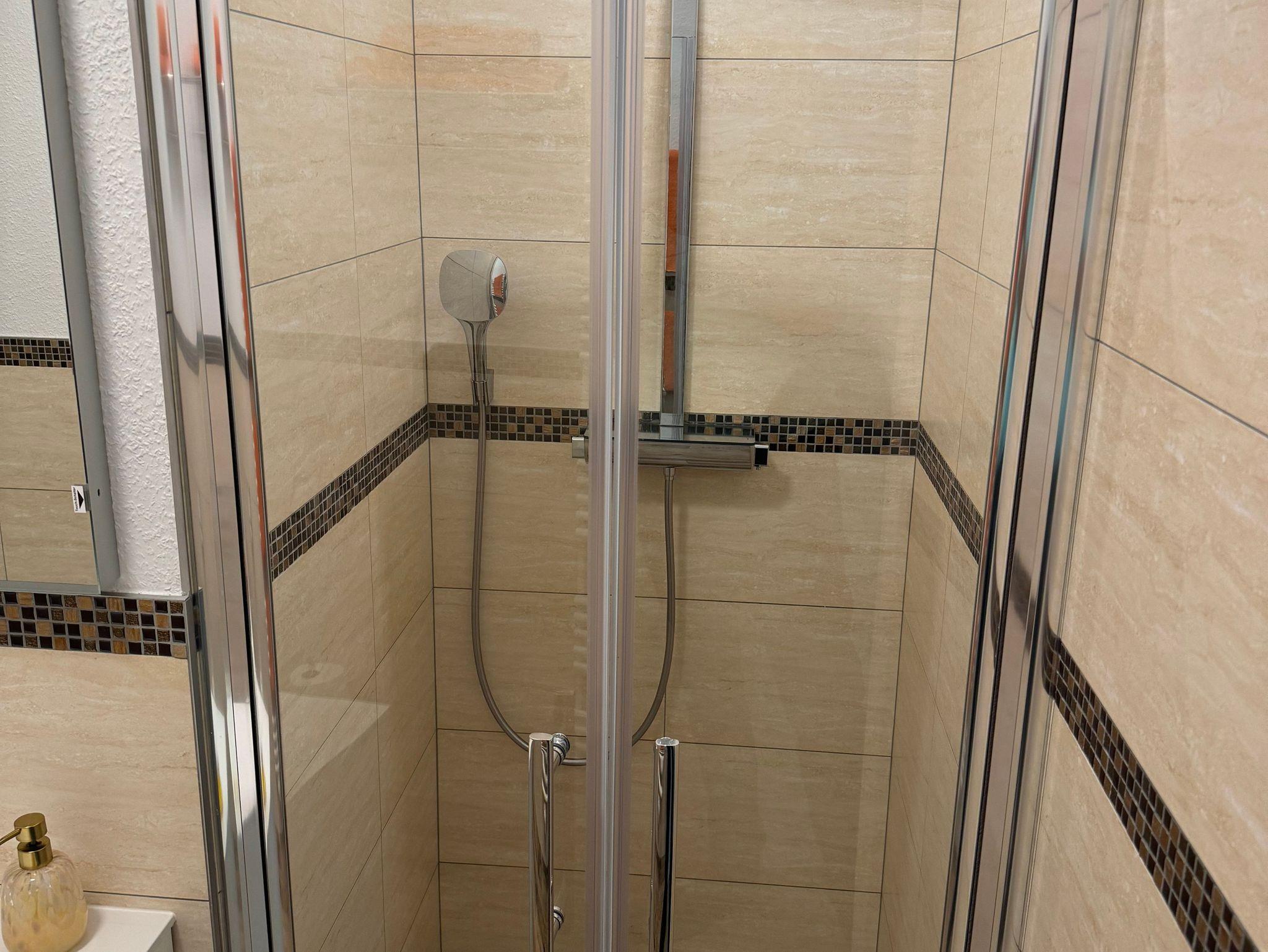 Das Bad verfügt über eine ebenerdige Dusche.