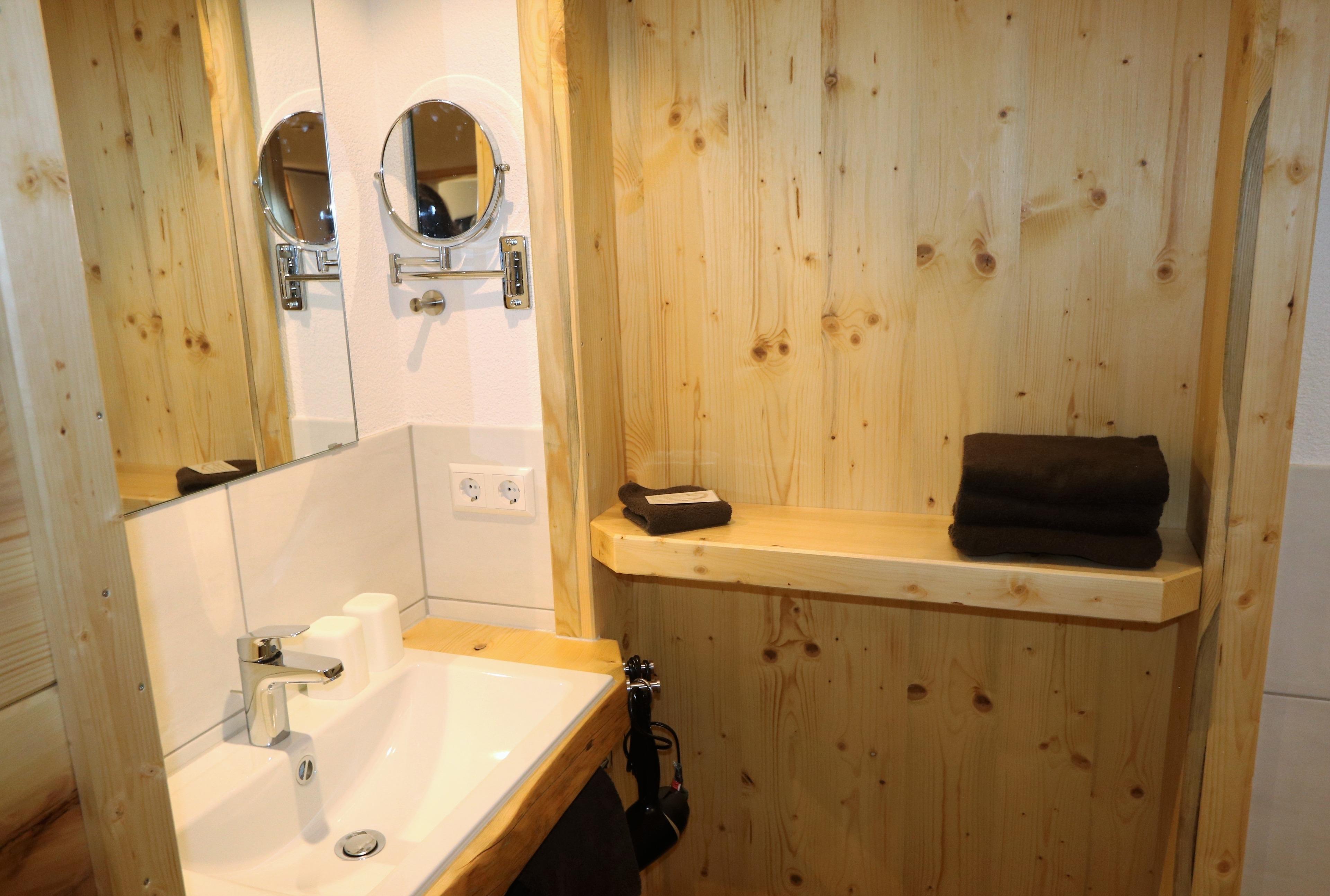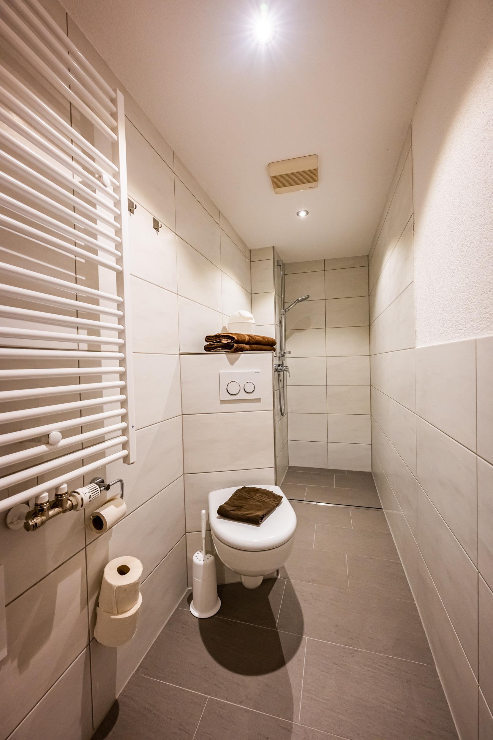 Die ebenerdige Dusche mit WC, Kosmetikspiegel, Haartrockner und ausreichend Handtücher für Ihren Aufenthalt runden den Wohlfühlurlaub ab.