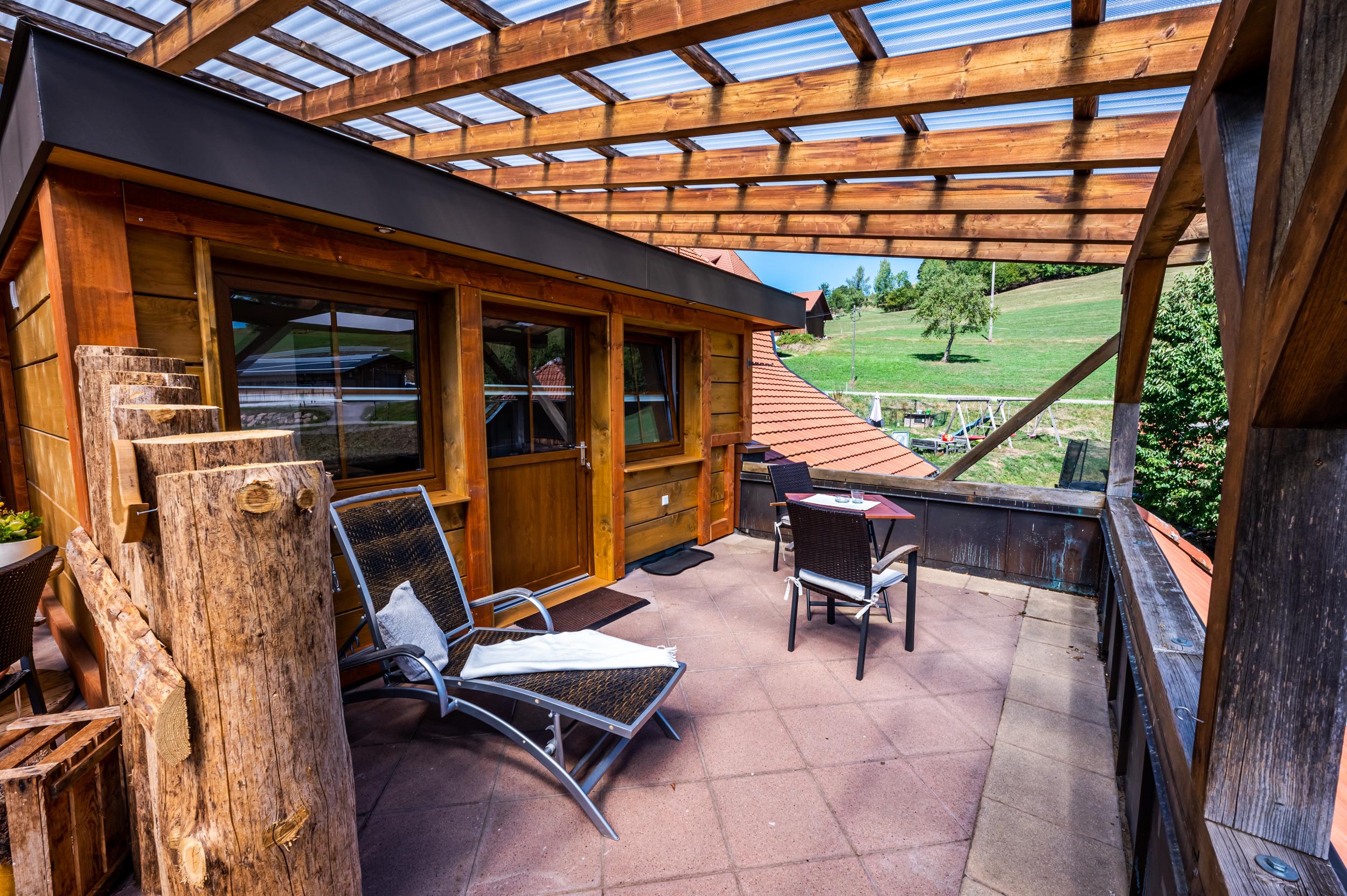 Auf der großen, überdachten und möbilierten Terrasse können Sie Ihr Frühstück unabhängig vom Wetter genießen.