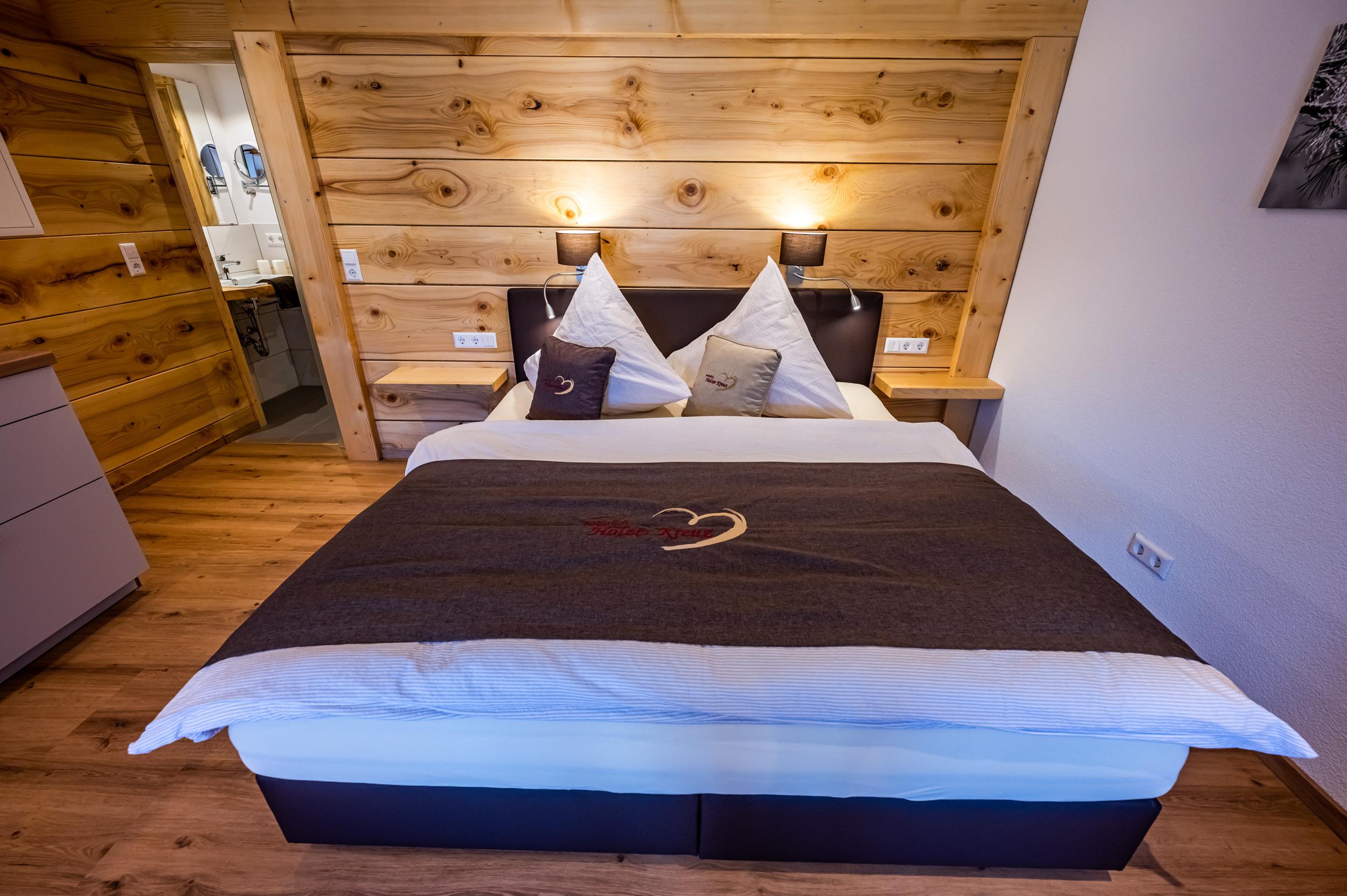 Unsere geräumiger Wohnschlafraum haben wir mit heimischen Holz gemütlich ausgestattet. Das Boxspringbett mit Leselampen wurde in den Raum integriert.