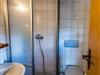 DU/WC mit Haartrockner, Kosmetikspiegel, Handtücher und Regal.