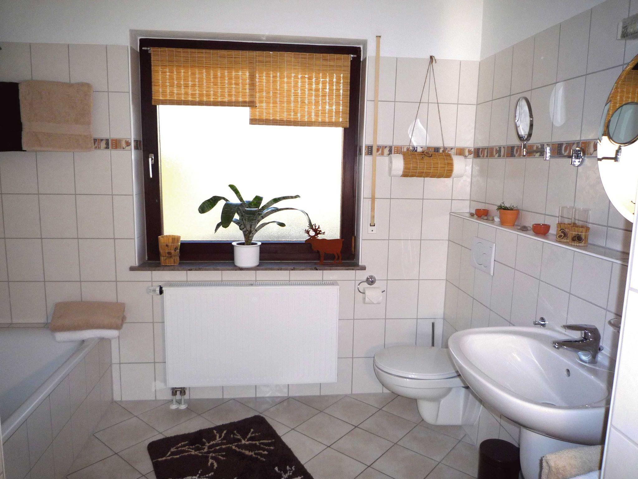 Das geräumige Badezimmer mit Dusche und Badewanne ist eine wahre Wohlfühloase.