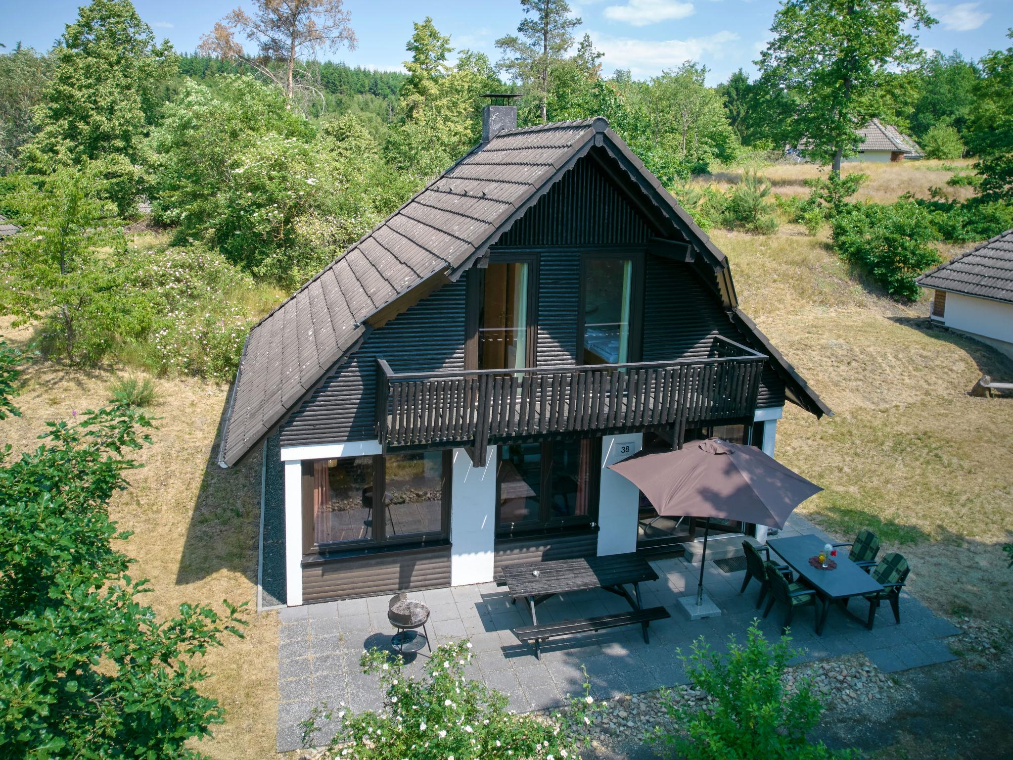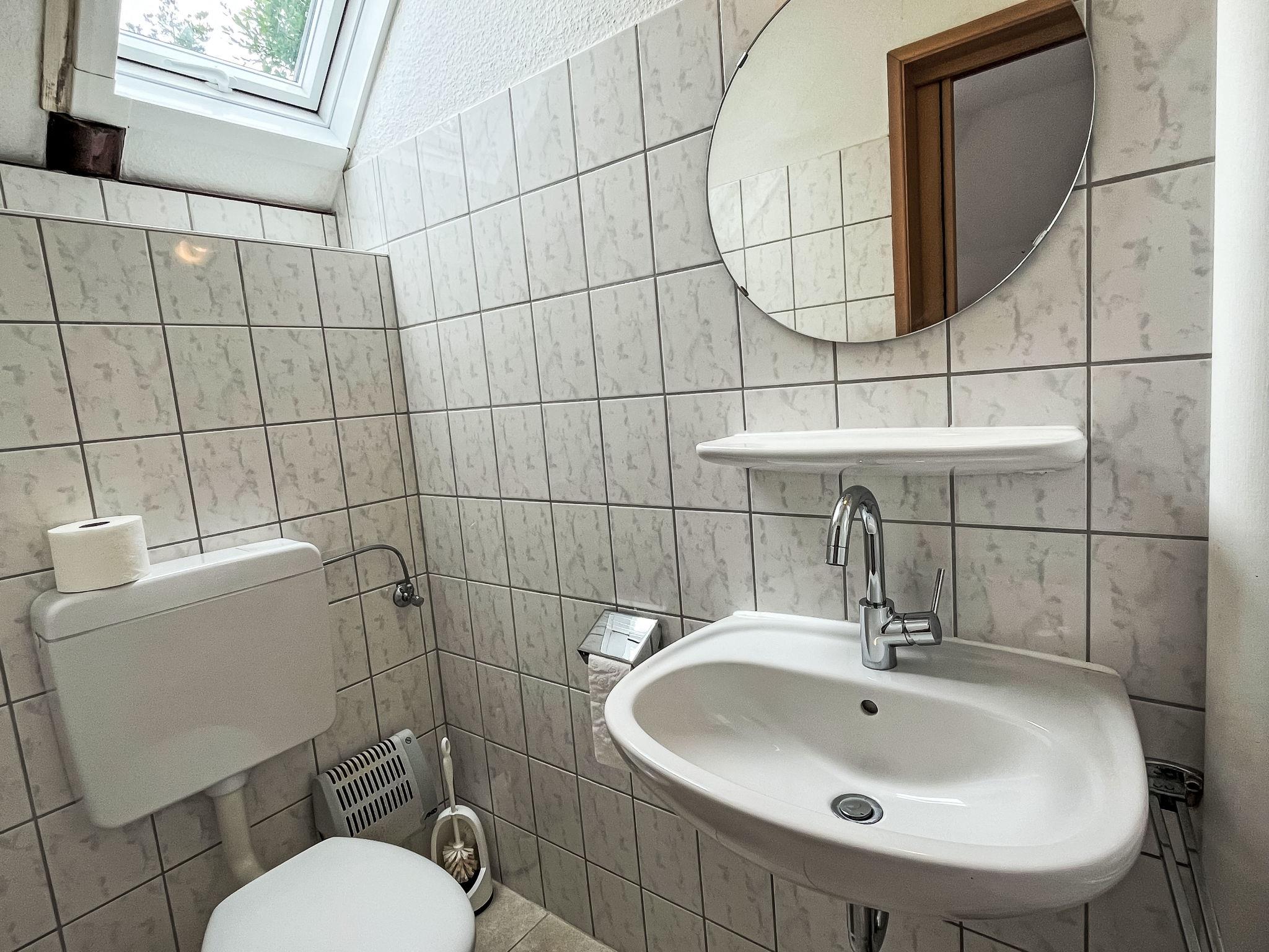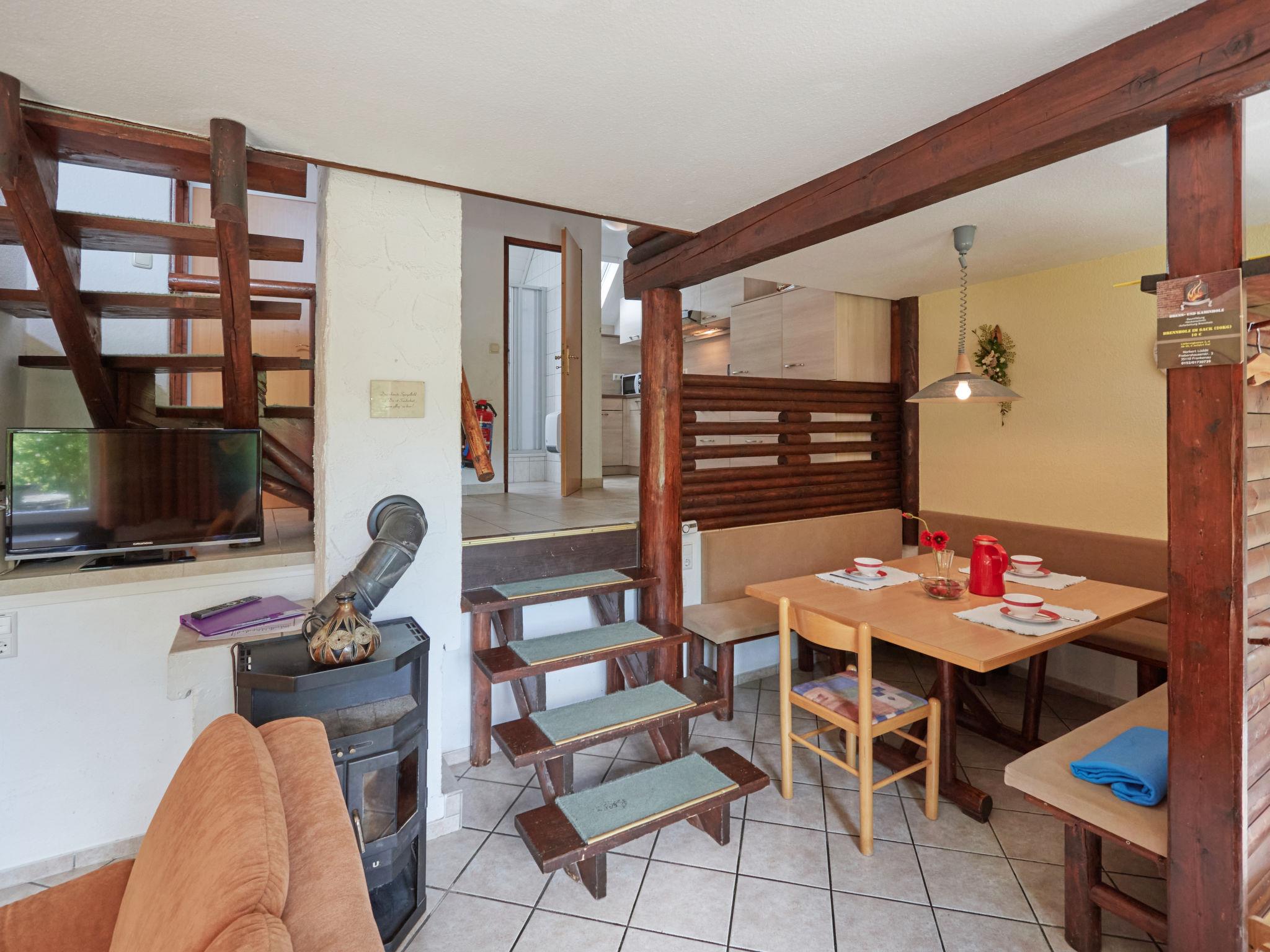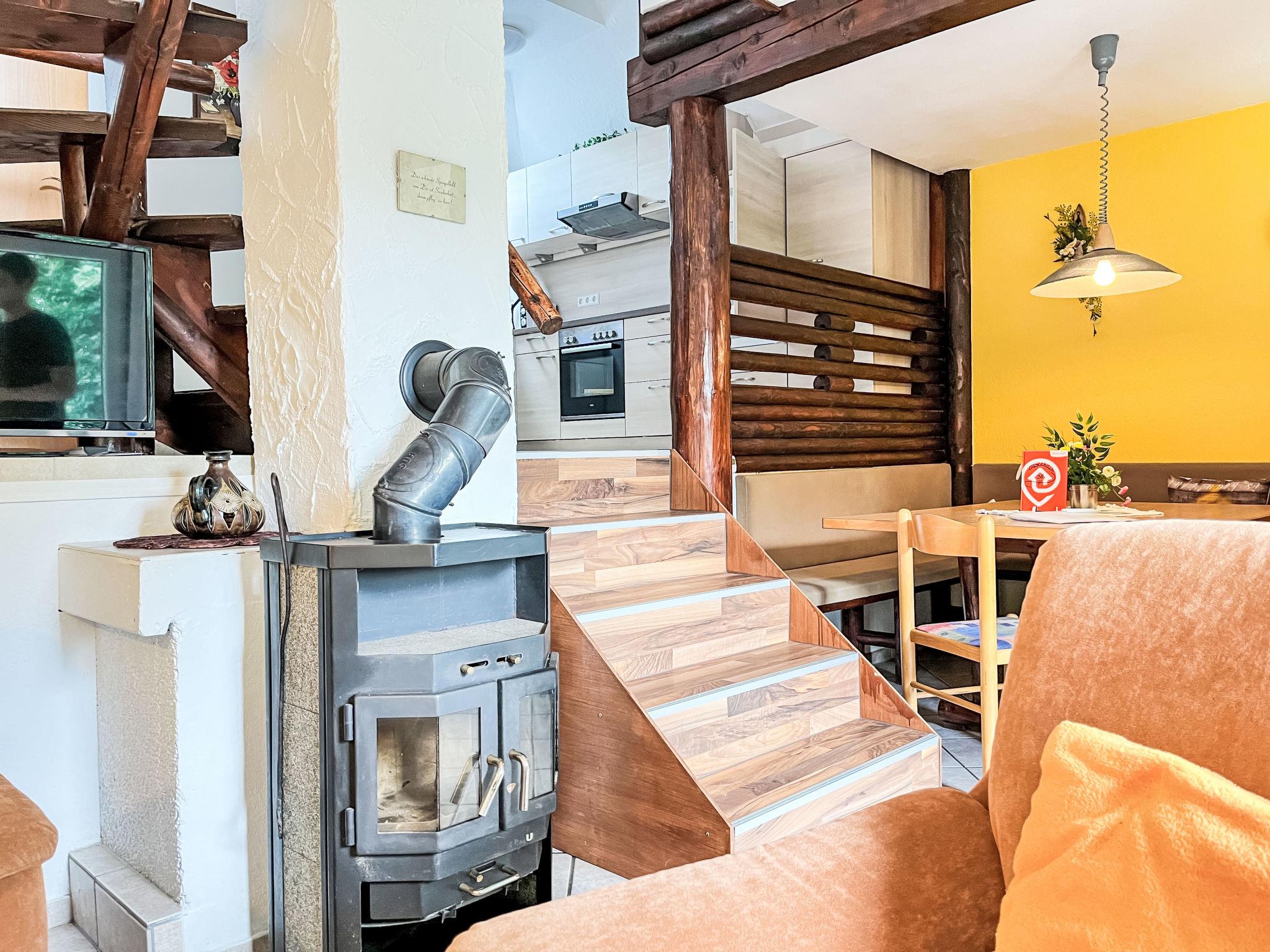 "Am Sternberg 38", 4-room house 75 m2 on 2 levels, on the ground floor. Cosy and wooden furniture furnishings: living/dining room 25 m2 with cable TV (flat screen), hi-fi system and wood-burning stove. Exit to the terrace, to the patio. 1 room 12 m2 with 1 double bed (180 cm, length 200 cm), separate WC. Open kitchen 8 m2 (oven, dishwasher, 4 ceramic glass hob hotplates, microwave, electric coffee machine, Capsules for coffee machine (Senseo)). Shower/WC. Upper floor: (spiral staircase), 1 room 12 m2, with sloping ceilings with 1 double bed (180 cm, length 200 cm), hand-basin. Exit to the balcony. 1 room 11 m2, with sloping ceilings with 2 beds (90 cm, length 200 cm), hand-basin. Exit to the balcony. Electric heating. Small balcony 5 m2, south facing position, terrace 20 m2 partly roofed, patio, lawn 100 m2. Terrace furniture, balcony furniture, barbecue (portable). Facilities: children's high chair, hair dryer, logs (extra). Internet (WiFi, free). Parking (1 car) at 20 m. Please note: non-smokers only. Maximum 2 pets/ dogs allowed. Smoke alarm, fire extinguisher. The rooms on the ground floor are connected by stairs (mezzanine). Smoking allowed.