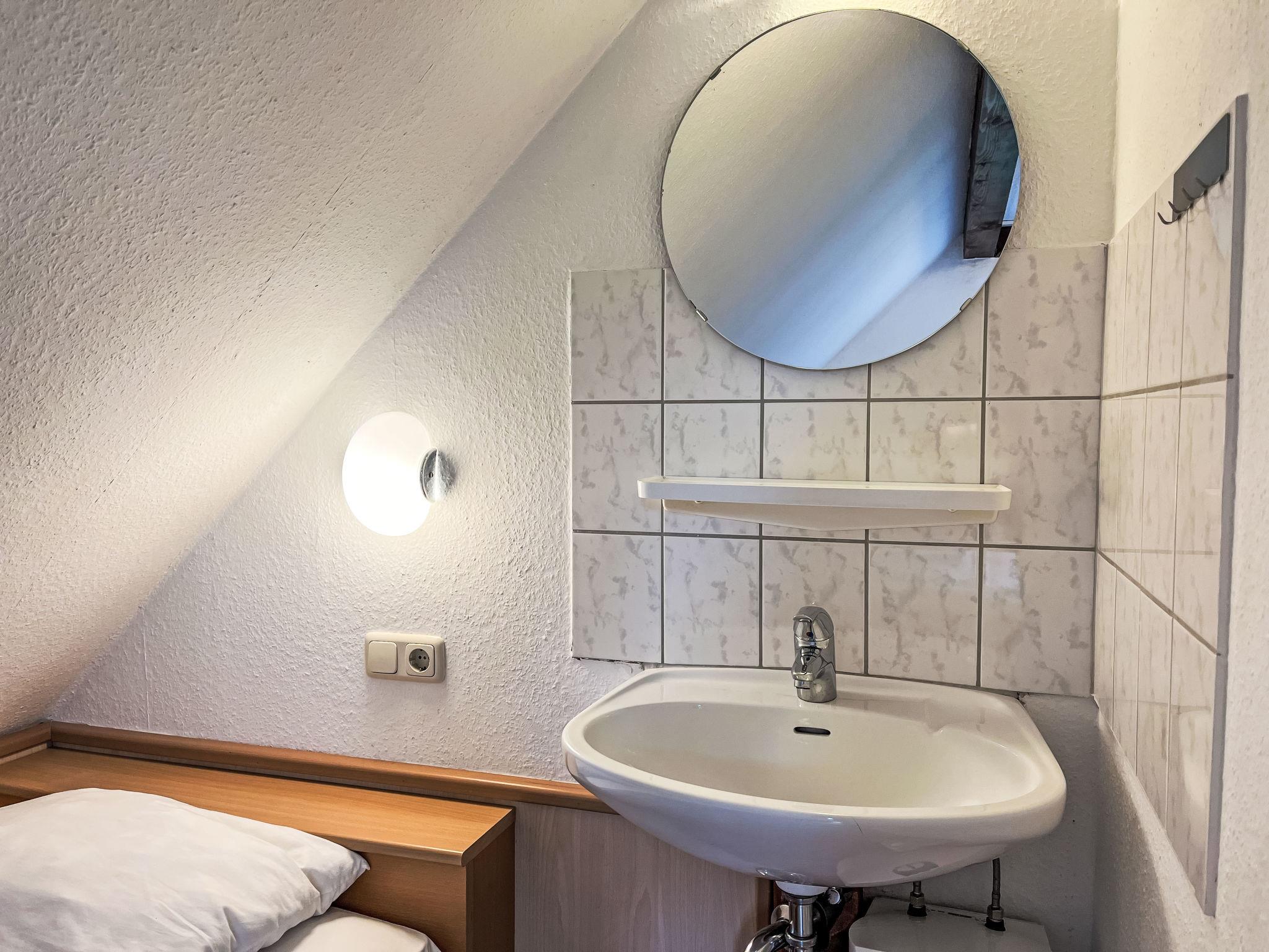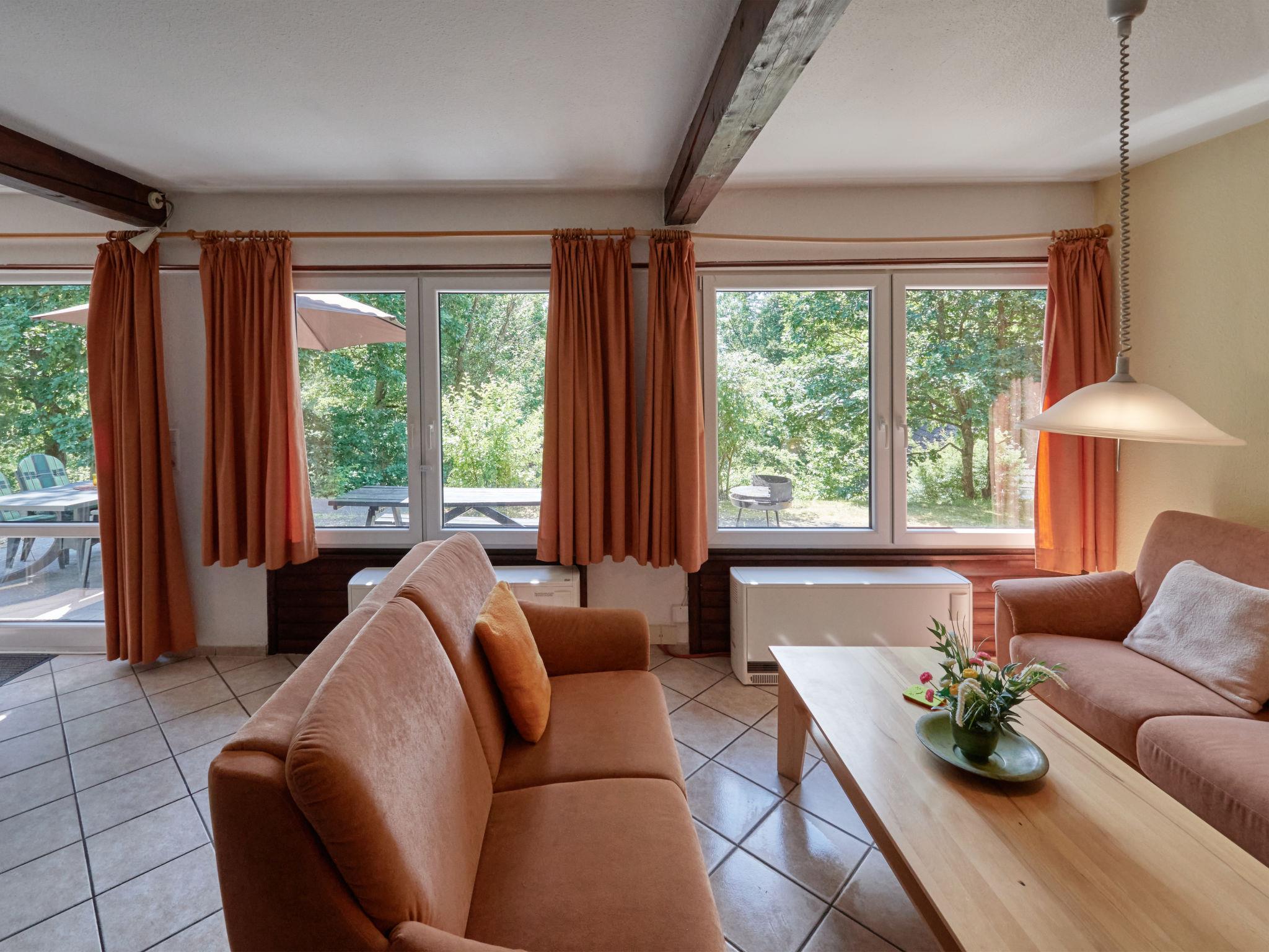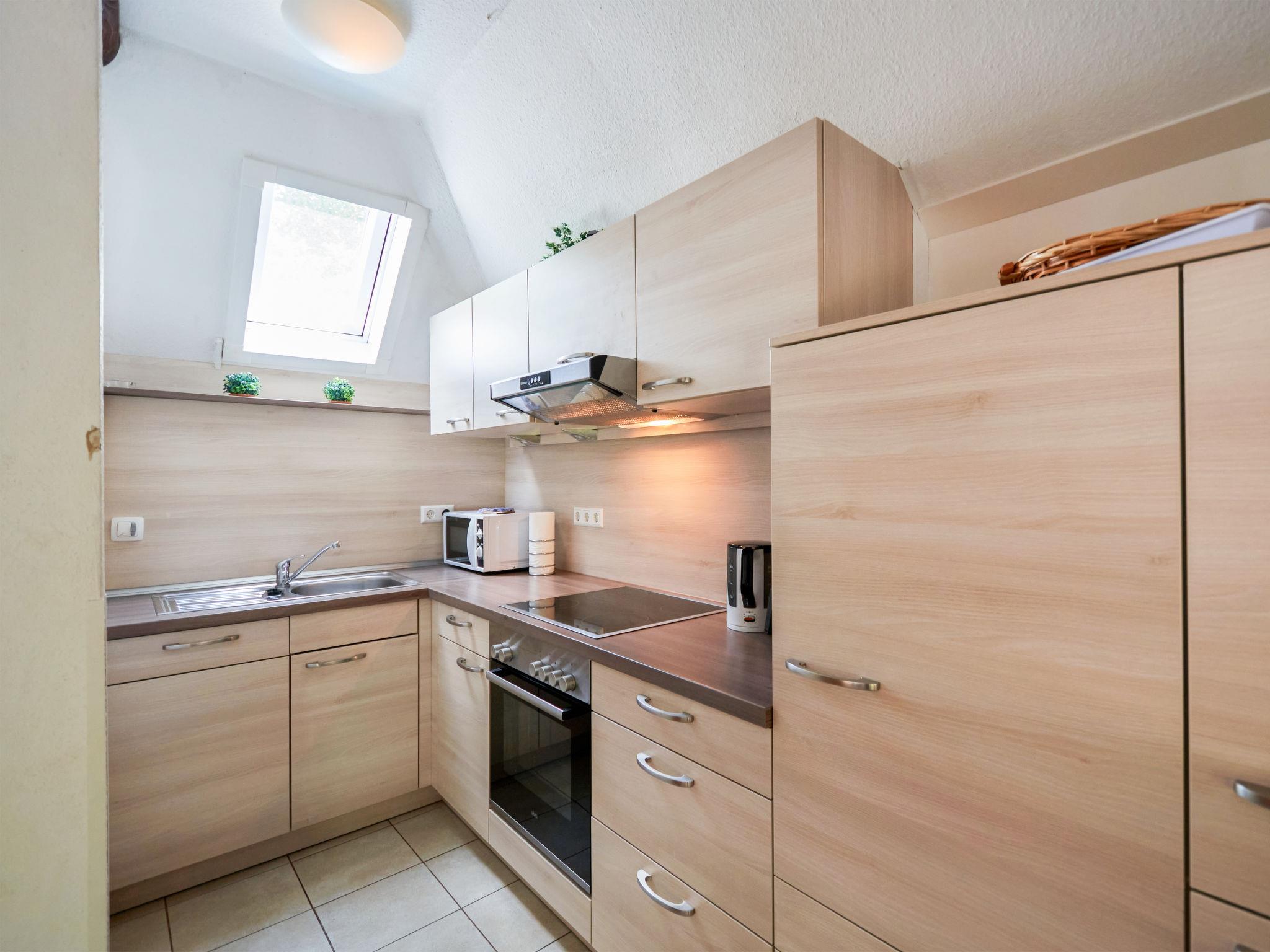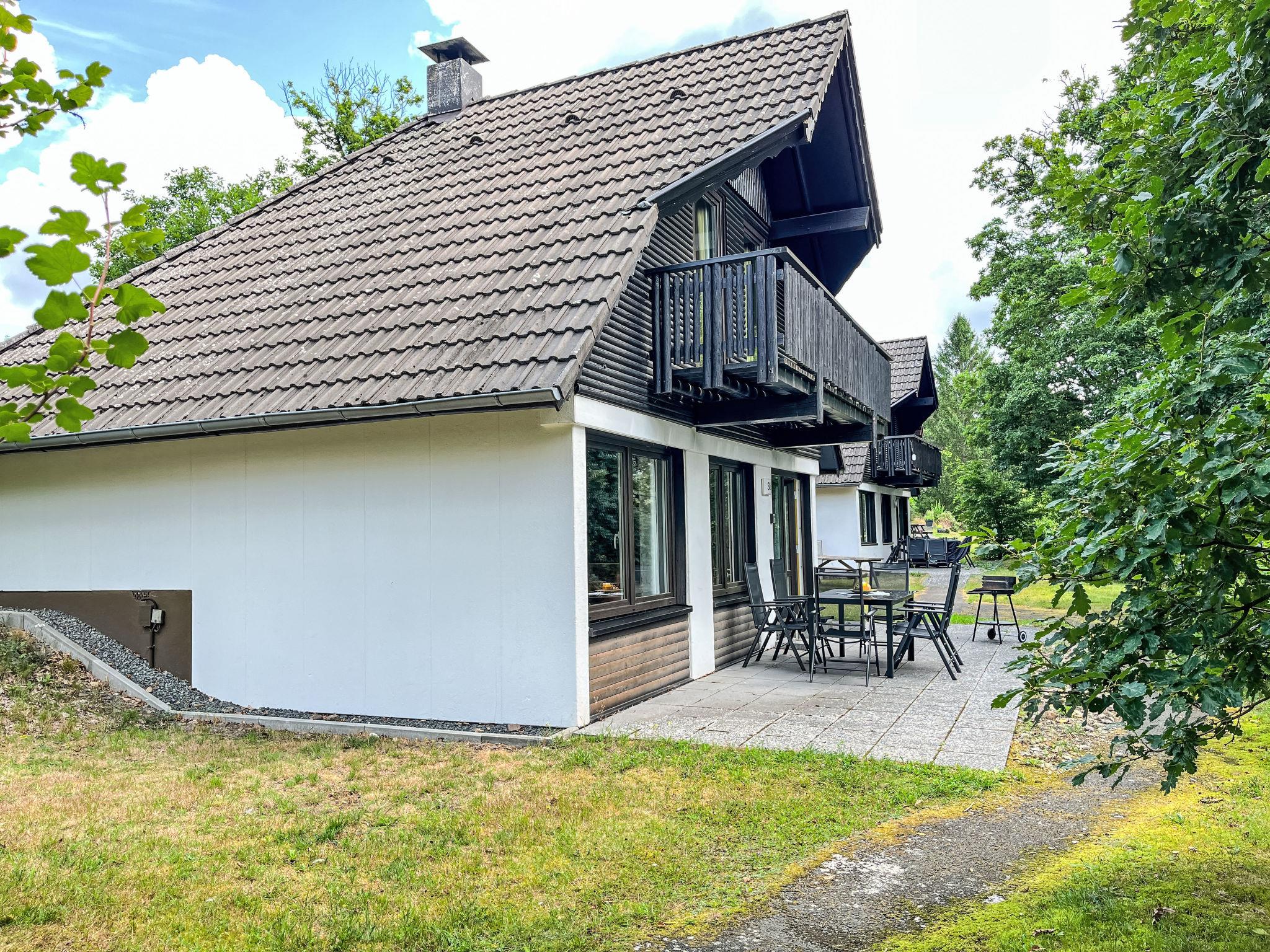 "Am Sternberg 38", 4-room house 75 m2 on 2 levels, on the ground floor. Cosy and wooden furniture furnishings: living/dining room 25 m2 with cable TV (flat screen), hi-fi system and wood-burning stove. Exit to the terrace, to the patio. 1 room 12 m2 with 1 double bed (180 cm, length 200 cm), separate WC. Open kitchen 8 m2 (oven, dishwasher, 4 ceramic glass hob hotplates, microwave, electric coffee machine, Capsules for coffee machine (Senseo)). Shower/WC. Upper floor: (spiral staircase), 1 room 12 m2, with sloping ceilings with 1 double bed (180 cm, length 200 cm), hand-basin. Exit to the balcony. 1 room 11 m2, with sloping ceilings with 2 beds (90 cm, length 200 cm), hand-basin. Exit to the balcony. Electric heating. Small balcony 5 m2, south facing position, terrace 20 m2 partly roofed, patio, lawn 100 m2. Terrace furniture, balcony furniture, barbecue (portable). Facilities: children's high chair, hair dryer, logs (extra). Internet (WiFi, free). Parking (1 car) at 20 m. Please note: non-smokers only. Maximum 2 pets/ dogs allowed. Smoke alarm, fire extinguisher. The rooms on the ground floor are connected by stairs (mezzanine). Smoking allowed.