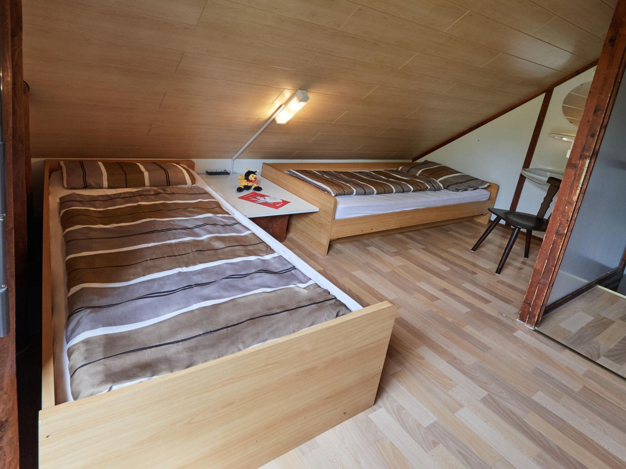 "Sigi", 4-room house 75 m2 on 2 levels, on the ground floor. Modern and wooden furniture furnishings: living/dining room 25 m2 with cable TV (flat screen), hi-fi system, wood-burning stove and air conditioning. Exit to the terrace, to the patio. 1 room 12 m2 with 1 double bed (180 cm, length 200 cm), hand-basin and separate WC. Open kitchen 8 m2 (oven, dishwasher, 4 ceramic glass hob hotplates, kettle, microwave, electric coffee machine). Shower, sep. WC. Upper floor: (spiral staircase), 1 room 12 m2, with sloping ceilings with 1 double bed (180 cm, length 200 cm), hand-basin. Exit to the balcony. 1 room 11 m2, with sloping ceilings with 2 beds (90 cm, length 200 cm). Exit to the balcony. Electric heating. Small balcony 5 m2, south facing position, large terrace 20 m2 partly roofed, patio, lawn 100 m2. Terrace furniture, balcony furniture. View of the forest. Facilities: logs (extra). Internet (WiFi, free). Please note: non-smoking house. Smoke alarm, fire extinguisher. On the ground floor, the rooms are connected by stairs (mezzanine). Bookings accepted for holiday purposes only.