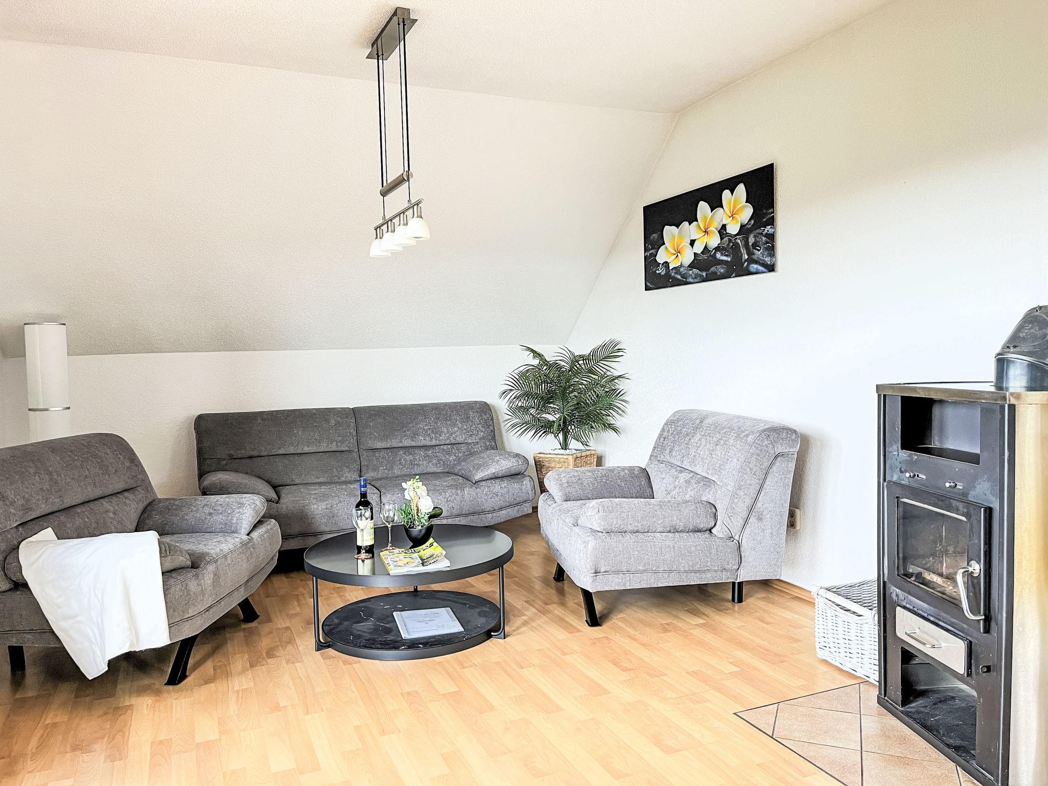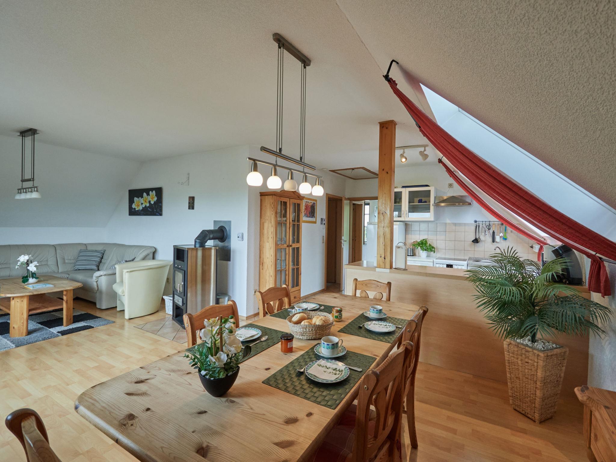"Hänsel & Gretel im Kellerwald", 6-room house 140 m2 on 2 levels. Spacious and bright, beautiful furnishings: living/dining room with Scandinavian wood stove, dining table, satellite TV and flat screen. Exit to the garden. 1 double bedroom. 1 room with 2 beds. Open kitchen (4 hot plates, oven, dishwasher, toaster, kettle, microwave, freezer, electric coffee machine). Shower/WC. Upper floor: living/dining room with Scandinavian wood stove, dining table and satellite TV (flat screen), radio. Exit to the balcony. 1 room with sloping ceilings with 1 double bed. 1 room with sloping ceilings with 2 beds. Open kitchen (oven, dishwasher, 4 ceramic glass hob hotplates, toaster, kettle, microwave, electric coffee machine). Shower/WC. Electric heating. Large terrace, lawn. Terrace furniture. Facilities: washing machine, baby cot, logs (extra). Internet (WiFi, free). Parking at the house. Please note: non-smokers only. Maximum 1 small pet/ dog allowed. Smoke alarm. No internal connecting door between the separated properties. PLEASE NOTE:This property is a combination of the two separate apartments DE3558.200.31 + DE3558.200.32. Bookings accepted for holiday purposes only.