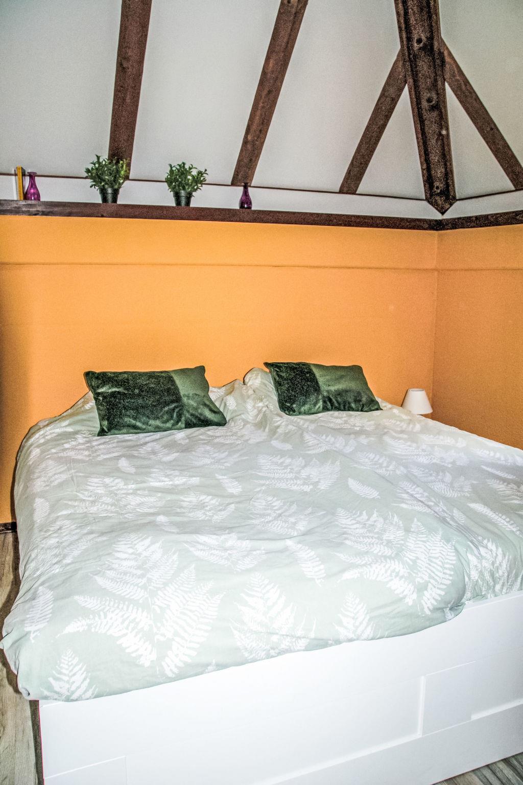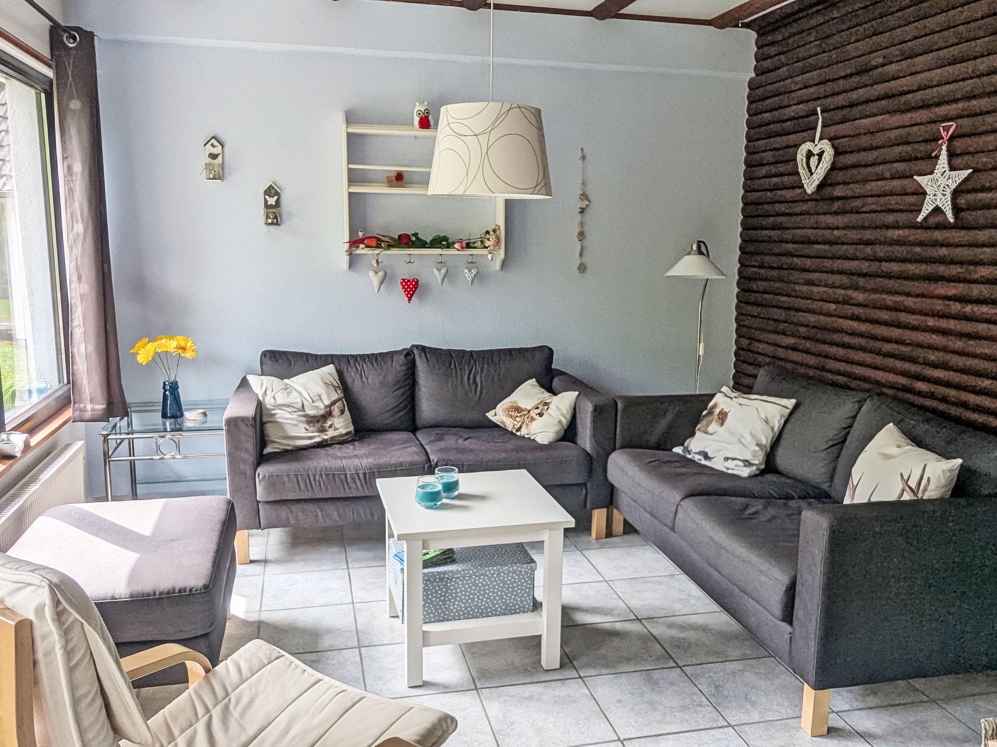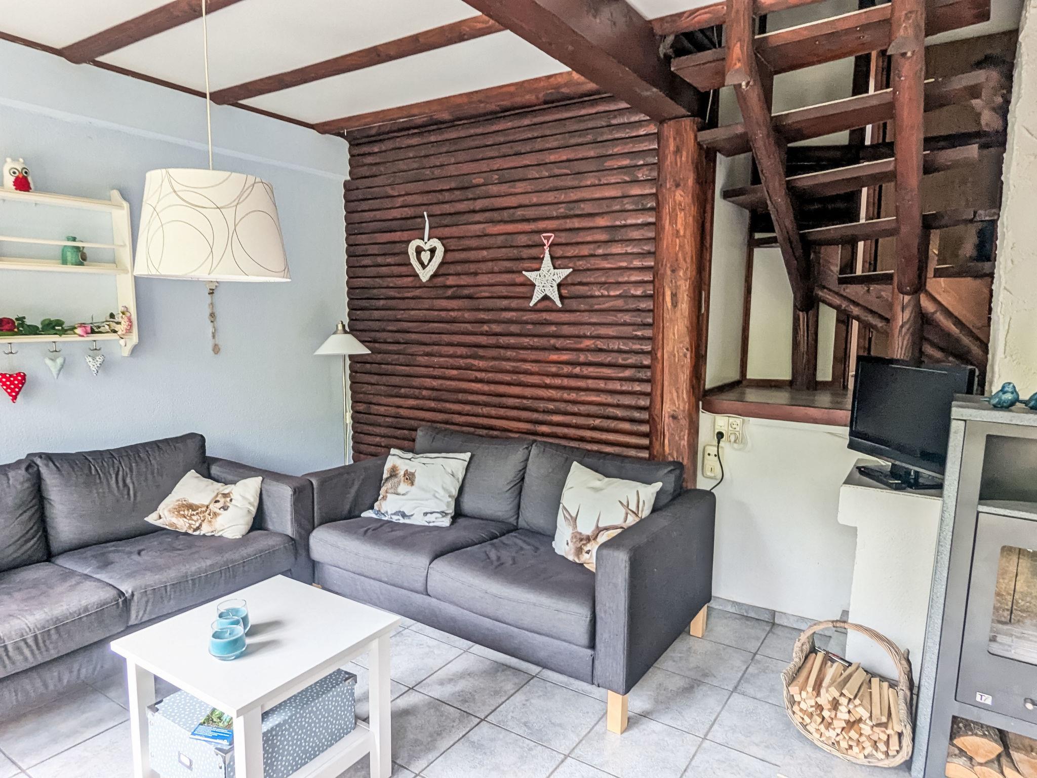 "Am Sternberg 115", 3-room house 65 m2 on 2 levels. Renovated in 2014, cosy and wooden furniture furnishings: living/dining room with Scandinavian wood stove, DVD and wood-burning stove. Exit to the terrace, to the patio. 1 room with 1 double bed (180 cm, length 200 cm). Open kitchen 8 m2 (oven, 4 ceramic glass hob hotplates, toaster, kettle, microwave, electric coffee machine) with dining nook. Shower/WC, sep. WC. Electric heating. Upper floor: (spiral staircase), 1 room with 1 double bed (180 cm, length 200 cm). 1 room with 2 beds (90 cm, length 200 cm). Small balcony 5 m2, large terrace 20 m2 partly roofed, patio, lawn 200 m2. Terrace furniture, balcony furniture. Facilities: logs (extra). Parking (1 car). Please note: non-smokers only. Smoke alarm.