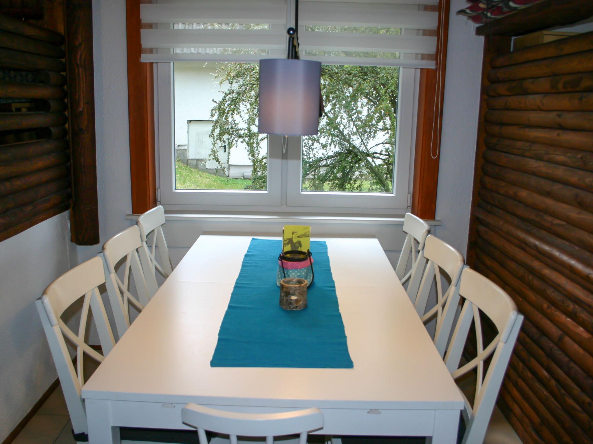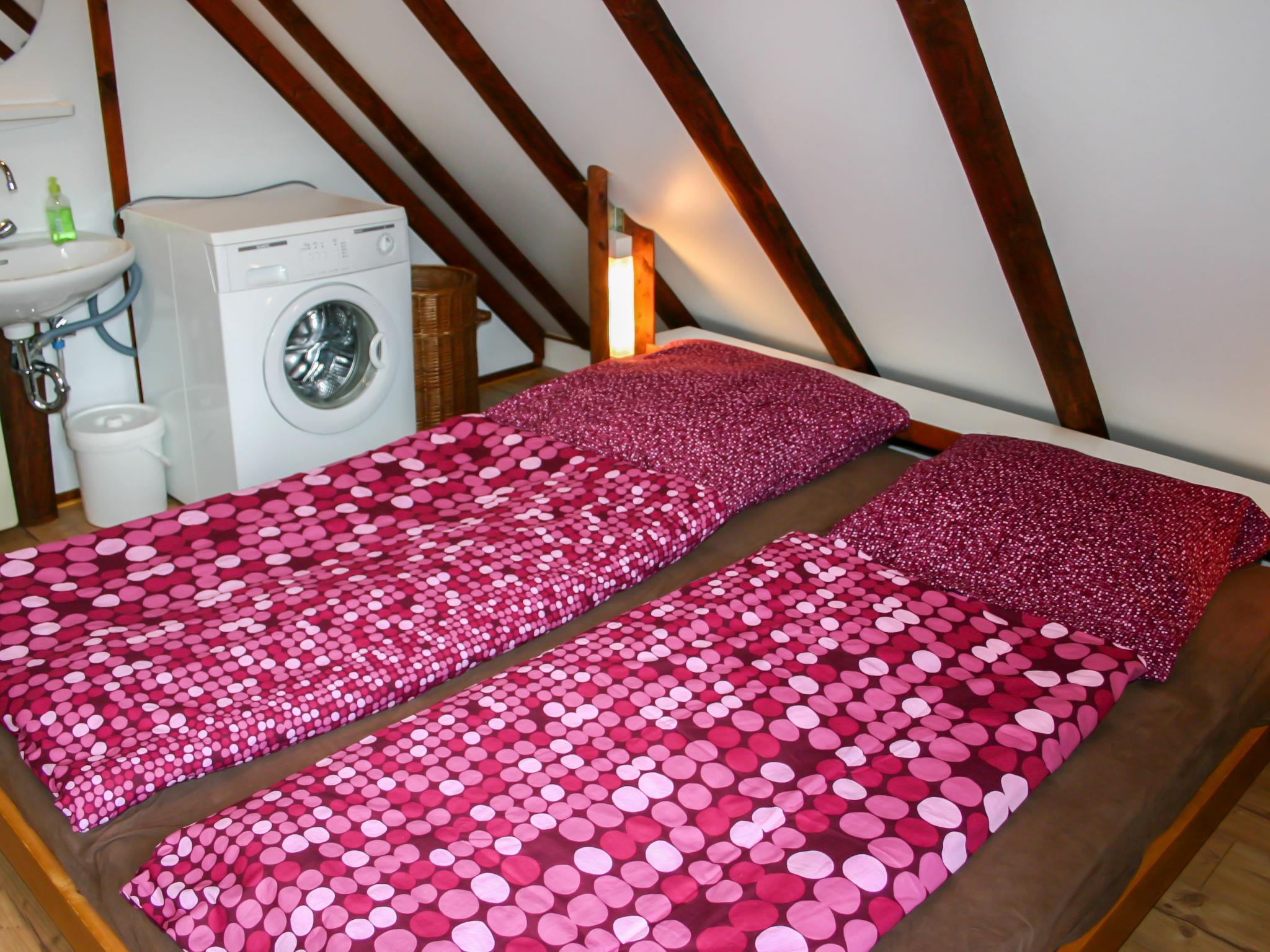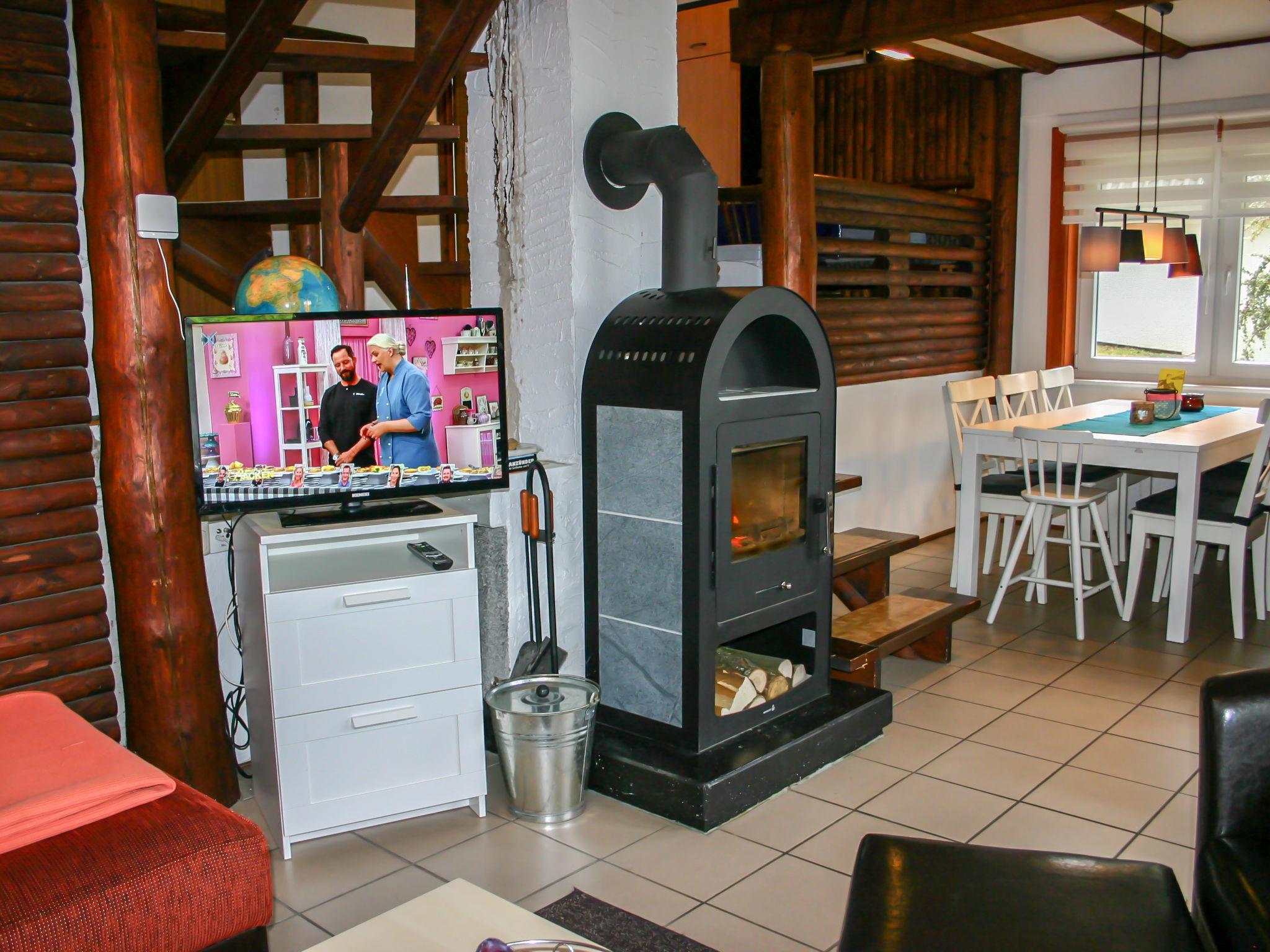 "Eule", 4-room house 75 m2 on 2 levels, on the ground floor. Partly renovated in 2021, cosy and wooden furniture furnishings: living/dining room 25 m2 with cable TV (flat screen), wood-burning stove. Exit to the terrace. 1 room 12 m2 with 1 double bed (180 cm, length 200 cm), separate WC. Open kitchen 8 m2 (4 hot plates, oven, dishwasher, electric coffee machine). Shower/WC. Upper floor: (spiral staircase), 1 room 12 m2, with sloping ceilings with 1 double bed (180 cm, length 200 cm), hand-basin. Exit to the balcony. 1 room 11 m2, with sloping ceilings with 2 beds (90 cm, length 200 cm), hand-basin. Exit to the balcony. Electric heating. Small balcony 5 m2, south facing position, large terrace 30 m2 partly roofed, lawn 150 m2. Terrace furniture, balcony furniture, barbecue (portable). Facilities: washing machine, iron, mosquito net, children's high chair, hair dryer, logs (extra). Internet (WiFi, free). Please note: non-smoking house. Maximum 2 pets/ dogs allowed. Smoke alarm, fire extinguisher. The rooms are connected by stairs (mezzanine) on the ground floor. Bookings accepted for holiday purposes only.