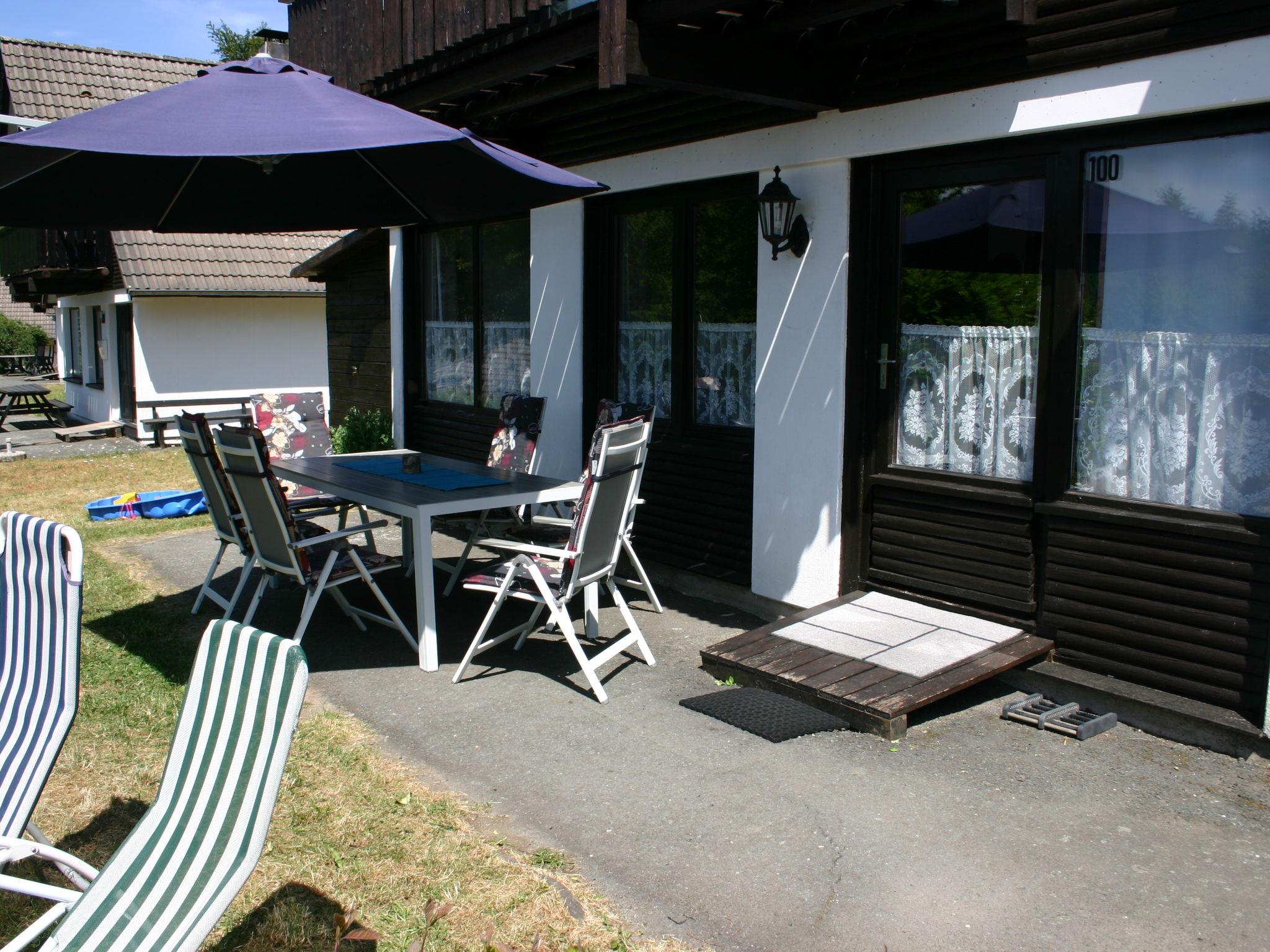 Holiday village "Frankenau", surrounded by trees and meadows. Outside the resort, 2 km from the centre of Frankenau, in the district Nationalpark Kellerwald, on a slope, 28 km from the lake. For shared use: natural state property, pond. In the complex: restaurant with TV, kiosk, sun terrace. Bread roll service. Grocery 8 km, restaurant 2 km, bakery 2 km, bicycle rental 15 km, bus stop 400 m, railway station "Frankenberg" 15 km, outdoor swimming pool 6 km, indoor swimming pool 15 km, thermal baths "Bad Wildungen-Reinhardshausen" 20 km, bathing lake 12 km. Golf course (18 hole) 25 km, tennis, indoor tennis centre 400 m, walking paths from the house 100 m, cycle lane 500 m, gondola lift 27 km, fishing possibilities 700 m. Nearby attractions: KellerwaldUhr 500 m, Schloss Waldeck 27 km. Well-known ski regions can easily be reached: Winterberg 45 km, Willingen 50 km. Well-known lakes can easily be reached: Edersee - Herzhausen 13 km. Hiking paths: Nationalpark Kellerwald 500 m. Please note: suitable for families. Neighbourhood highly sensitive to noise. Quietness and good behaviour expected. Some of the holiday homes can be reached via steps. At the park entrance there is a bistro/café with a sun terrace, Sunday breakfast buffet, children's cinema, table football (limited opening times outside of the season). There is also the option of using a washing machine and dryer for a fee.